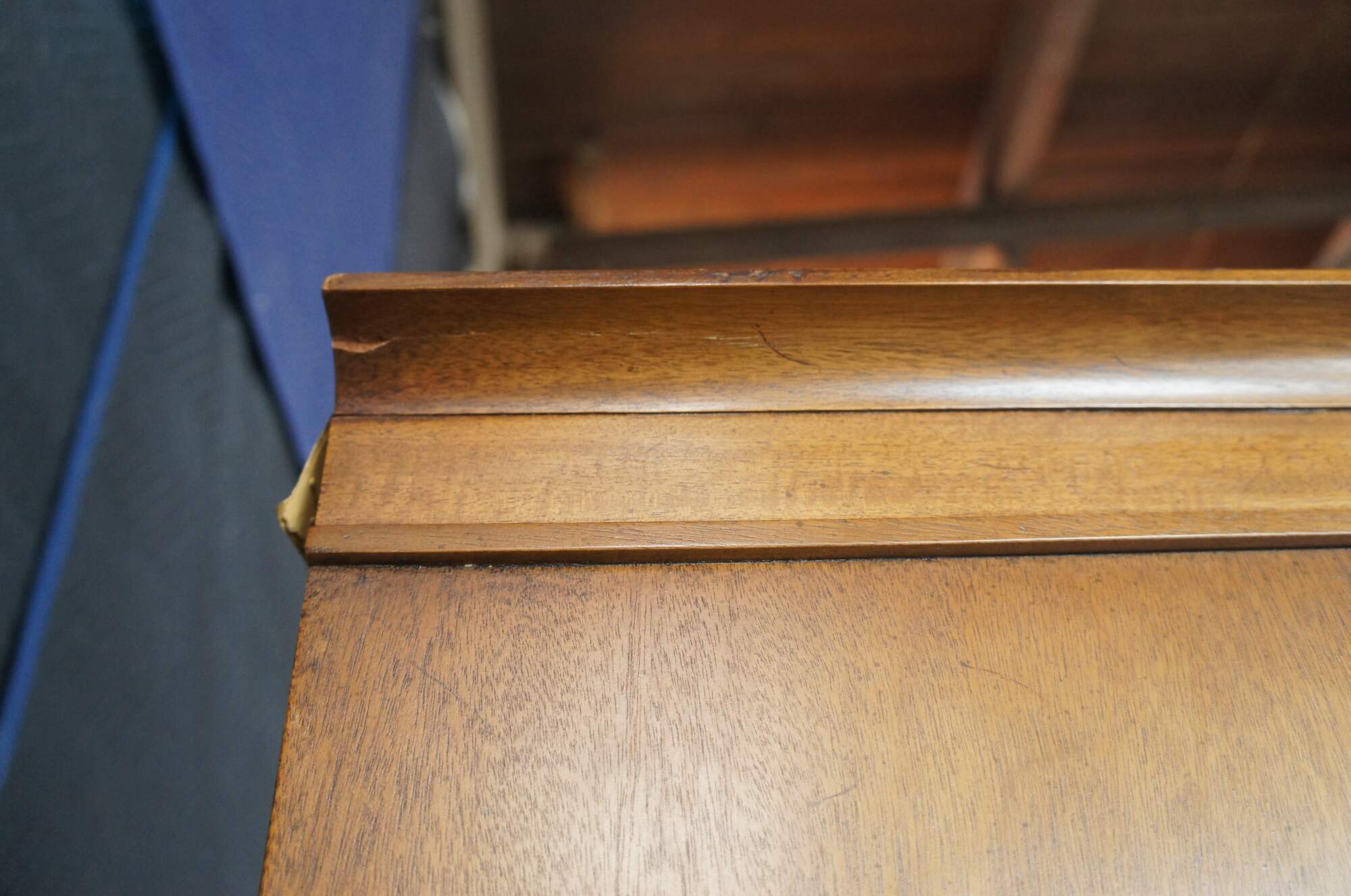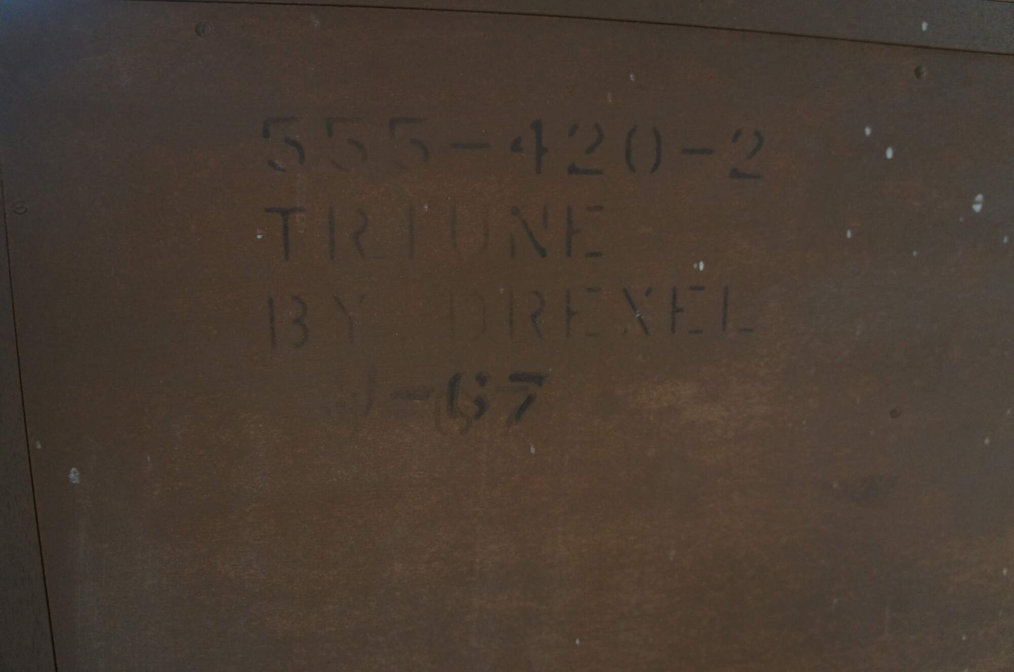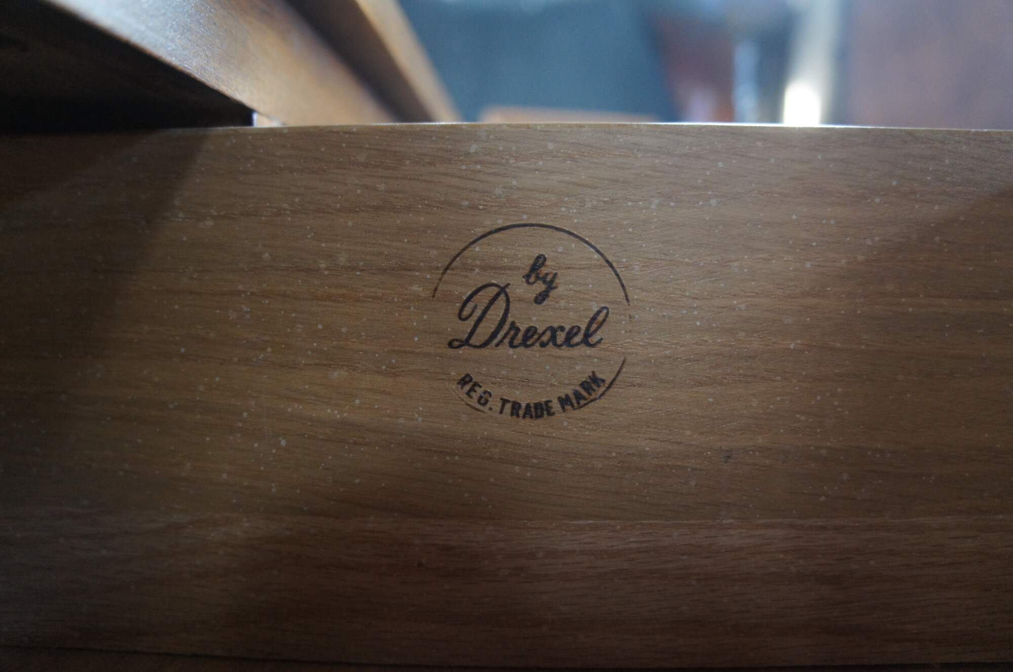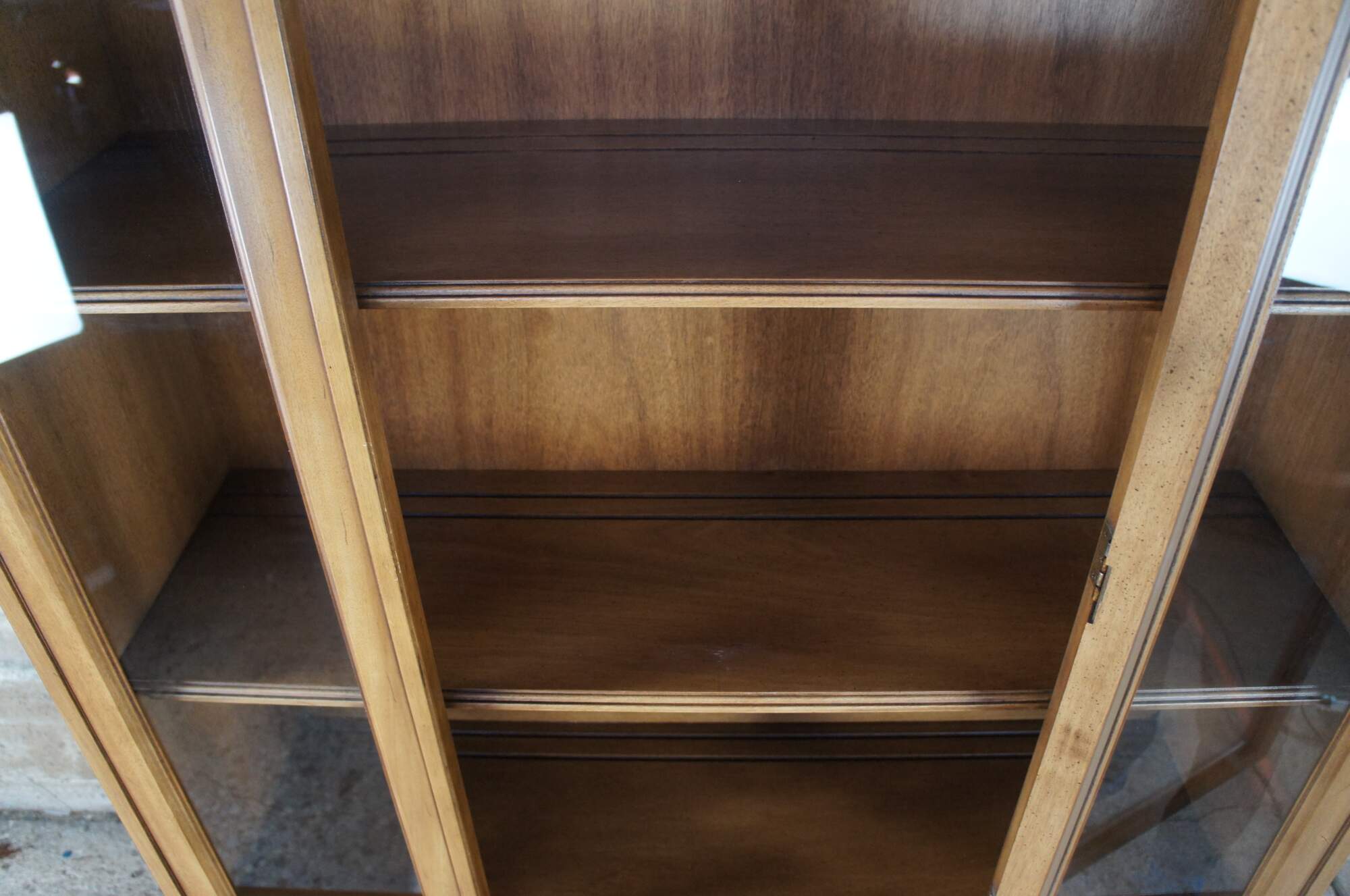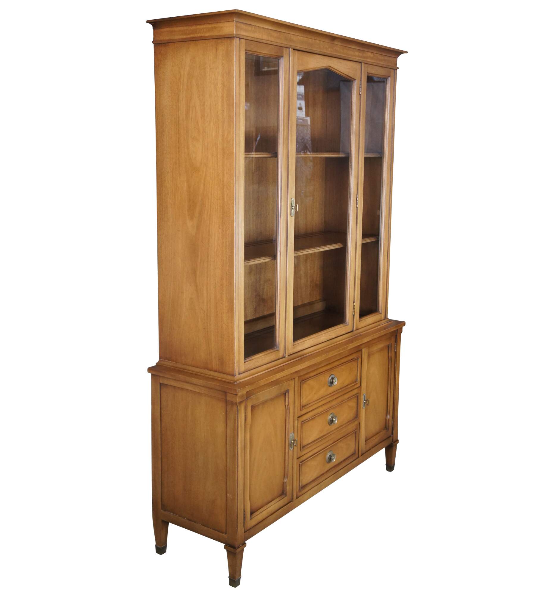 Vintage Drexel Triune china cabinet. Made of mahogany featuring upper curio with two shelves and plate grooves, and a lower cupboard with two doors and three drawers. Circa 1967. 555-420-2.