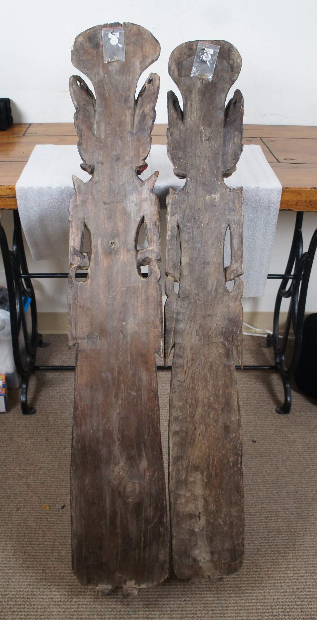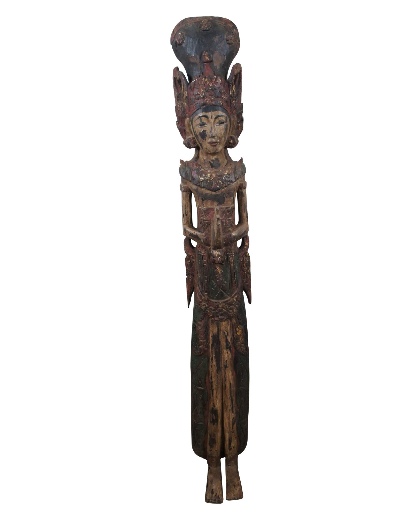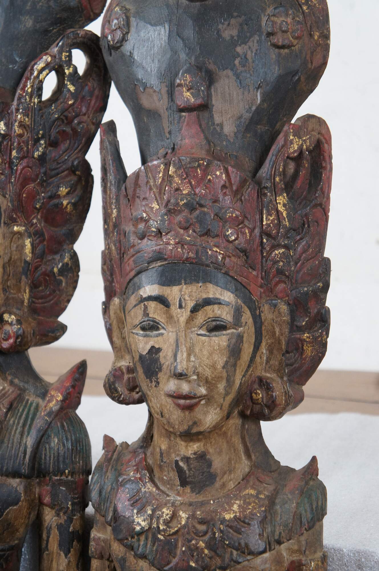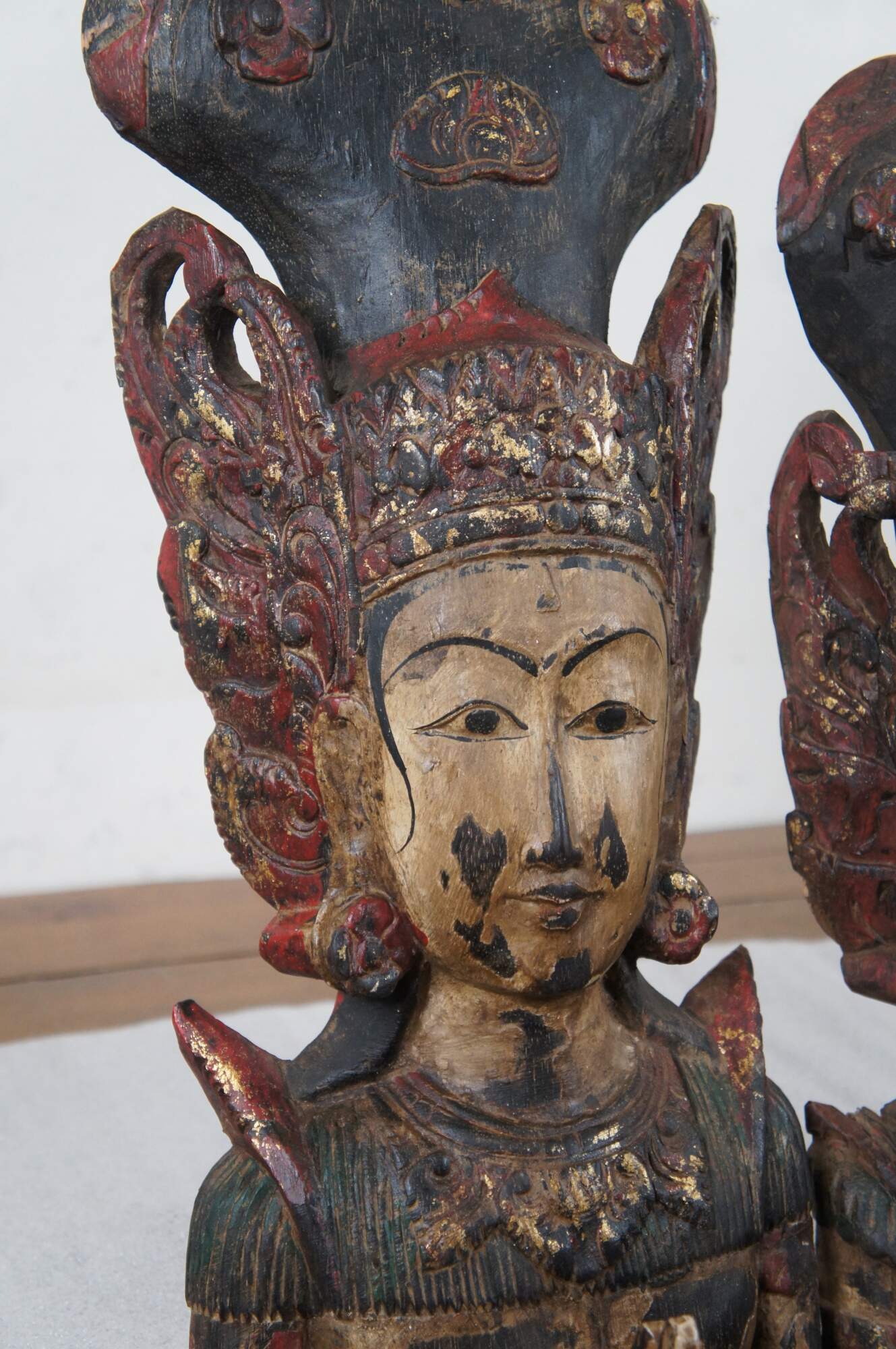 Pair of vintage 20th century carved wall hanging Thai religious deity / angel figures, one male and one female. Hand carved and painted featuring traditional thepphanom / thephanom pose, which is a Thai term referring to a devata performing the Añjali Mudrā praying hand gesture.