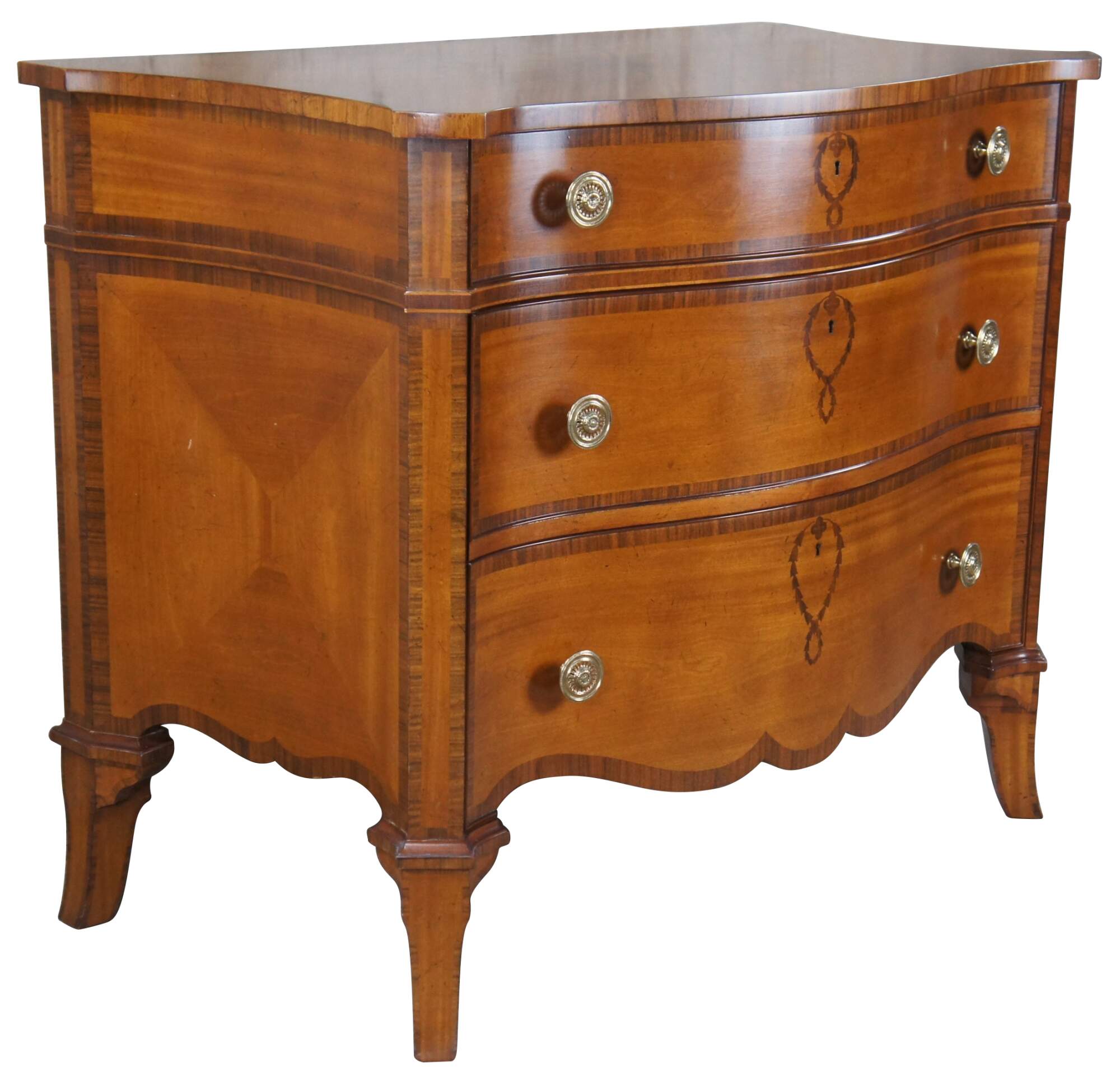 A spectacular English George III style chest of drawers by Baker Furniture. Part of the Stately Homes Collection, circa last quarter 20th century. The Stately Homes Collection encompasses recreations from furniture in palaces and castles of England, Russia and beyond. Made from Satinwood with crossbanded mahogany over a serpentine frame with canted angles. Features three graduated dovetailed drawers. Drawer fronts are centered by a ribboned floral marquetry inlay and flanked by pierced brass drawer pulls. The shapely top has impressive marquetry inlay with medallions and continuous tulips making up the shape of a flower. The case is raised over splayed feet and has a naturally Distressed finish. Marked Baker along the inside of uppermost drawer. Great for use as an entry console or dresser.