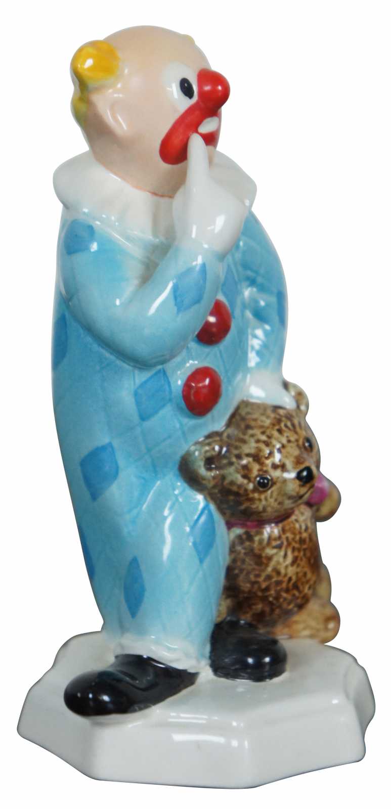 3 Available – Vintage Goebel West Germany ceramic figurine of a blond clown in a blue costume holding a teddy bear.