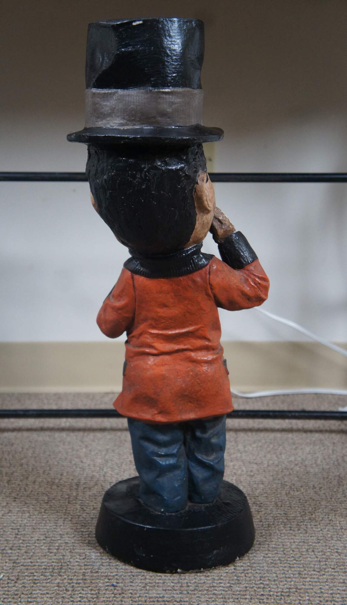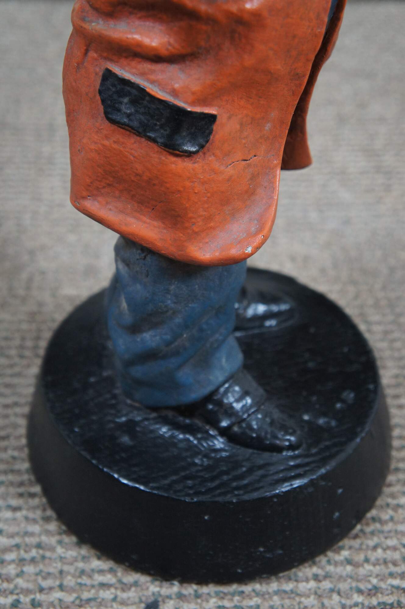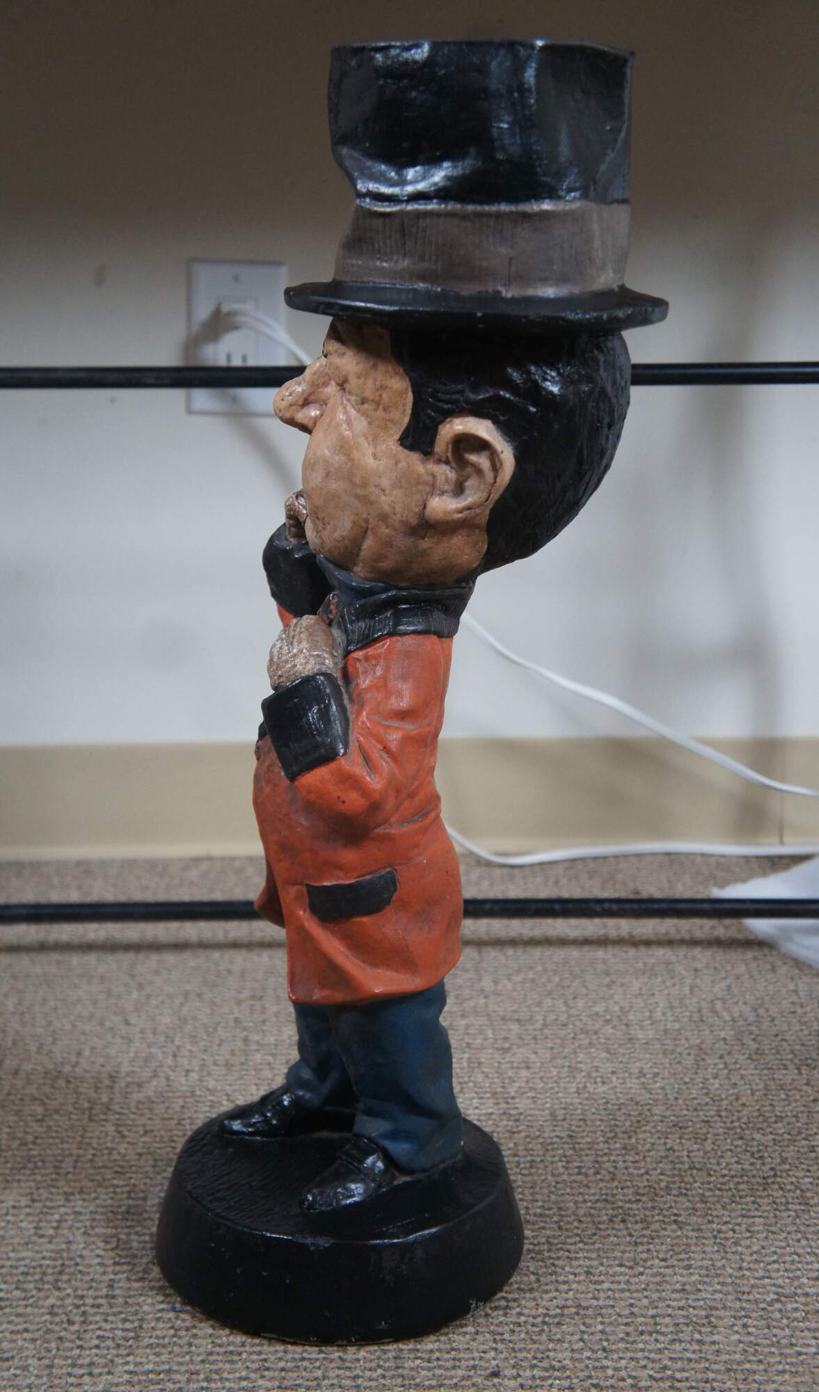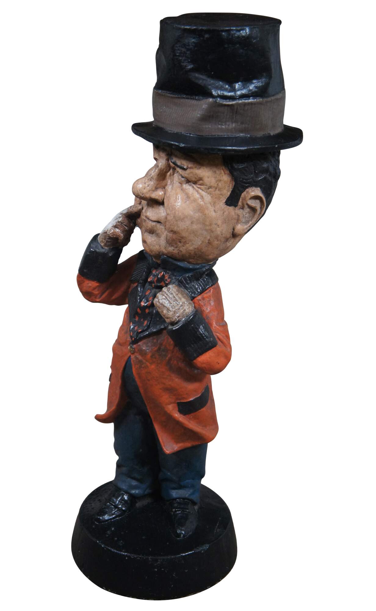 Vintage painted chalkware figurine / statue of W.C. Fields in a red-orange suit with spotted cravat and large top hat.