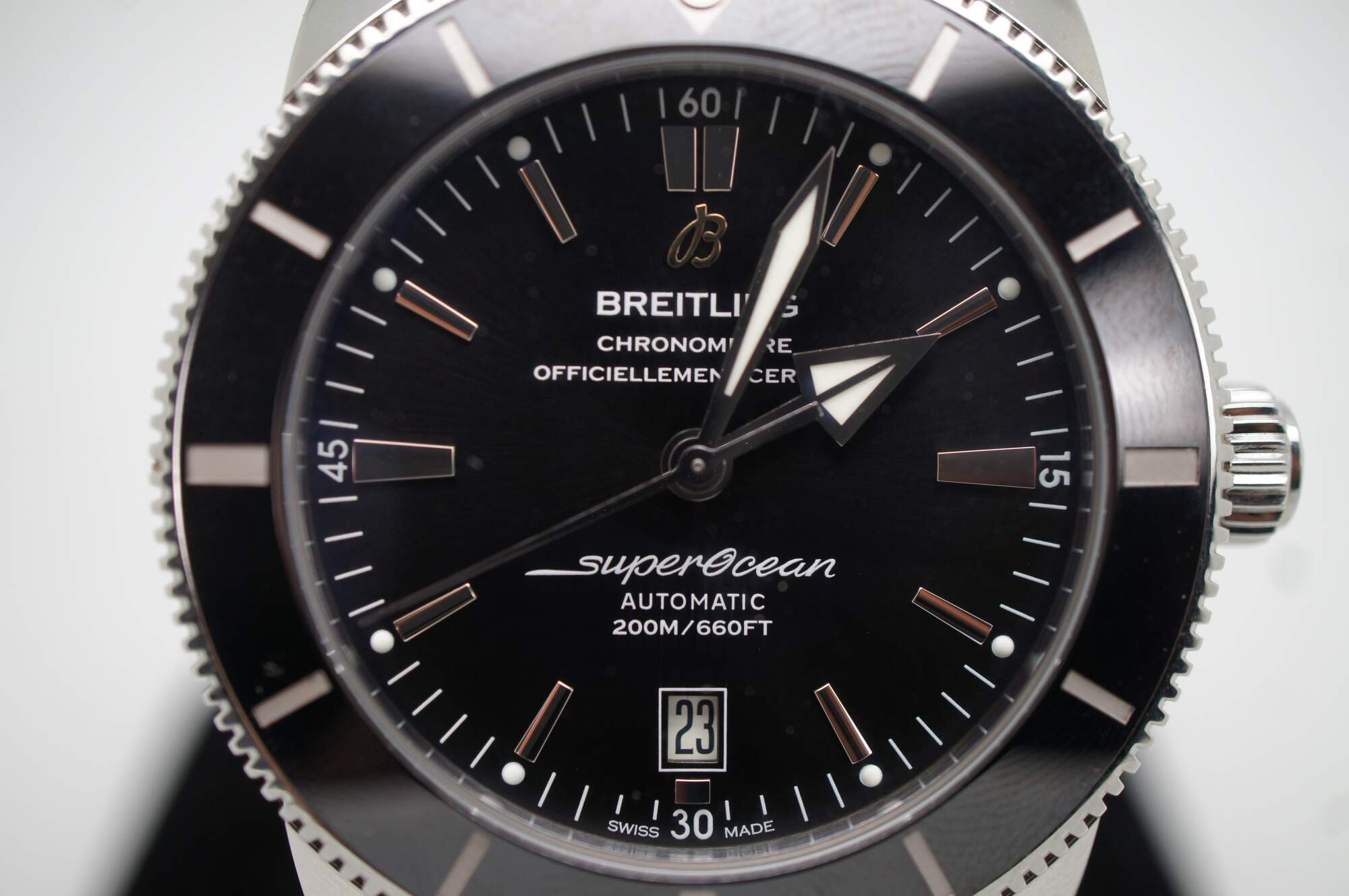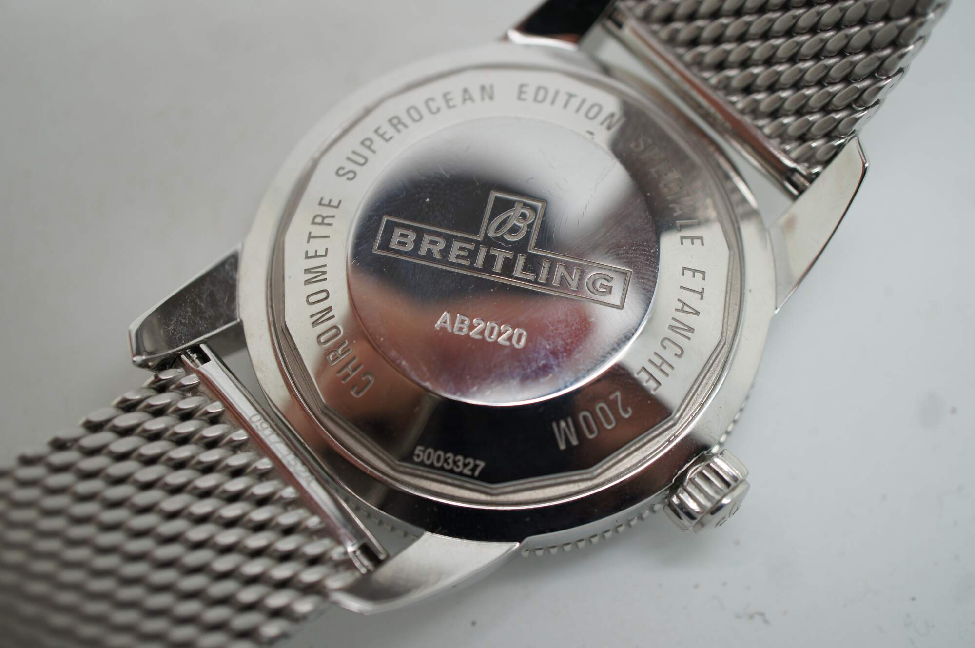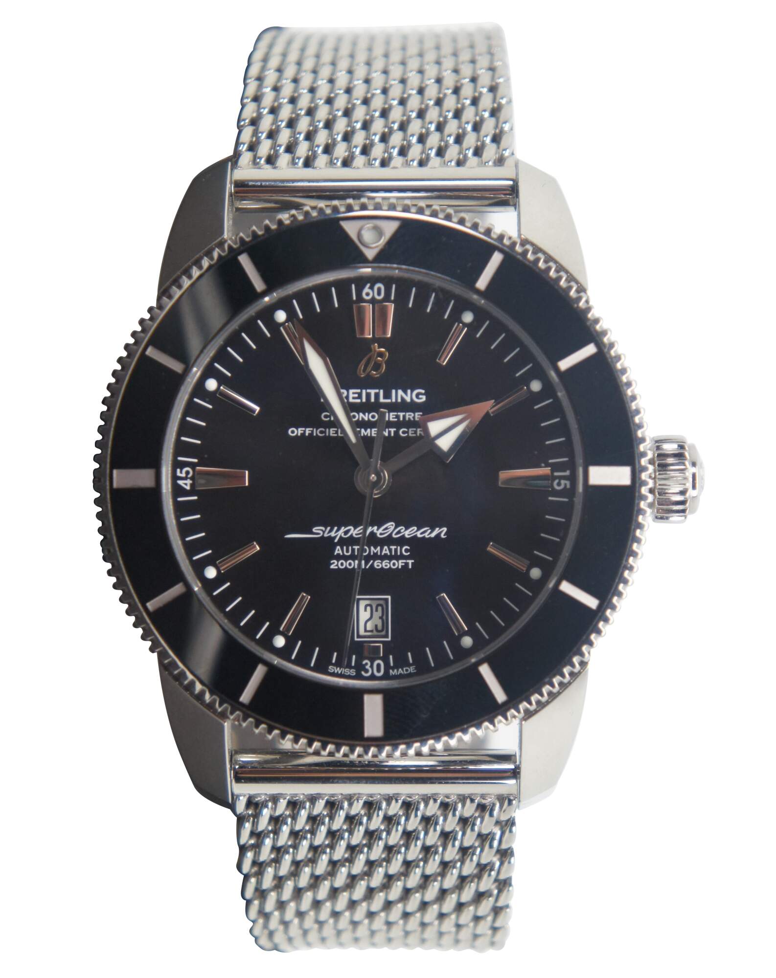 Breitling Superocean Heritage II 46 AB2020 wrist watch with stainless steel mesh band, black ceramic bezel and black sunburst dial, with anti reflective coating on both sides of the sapphire crystal, and Superluminova on hands, hour markers, and triangle on the bezel for visibility in low light. Includes original interior and exterior boxes, plus original receipt, warranty card, and paperwork.