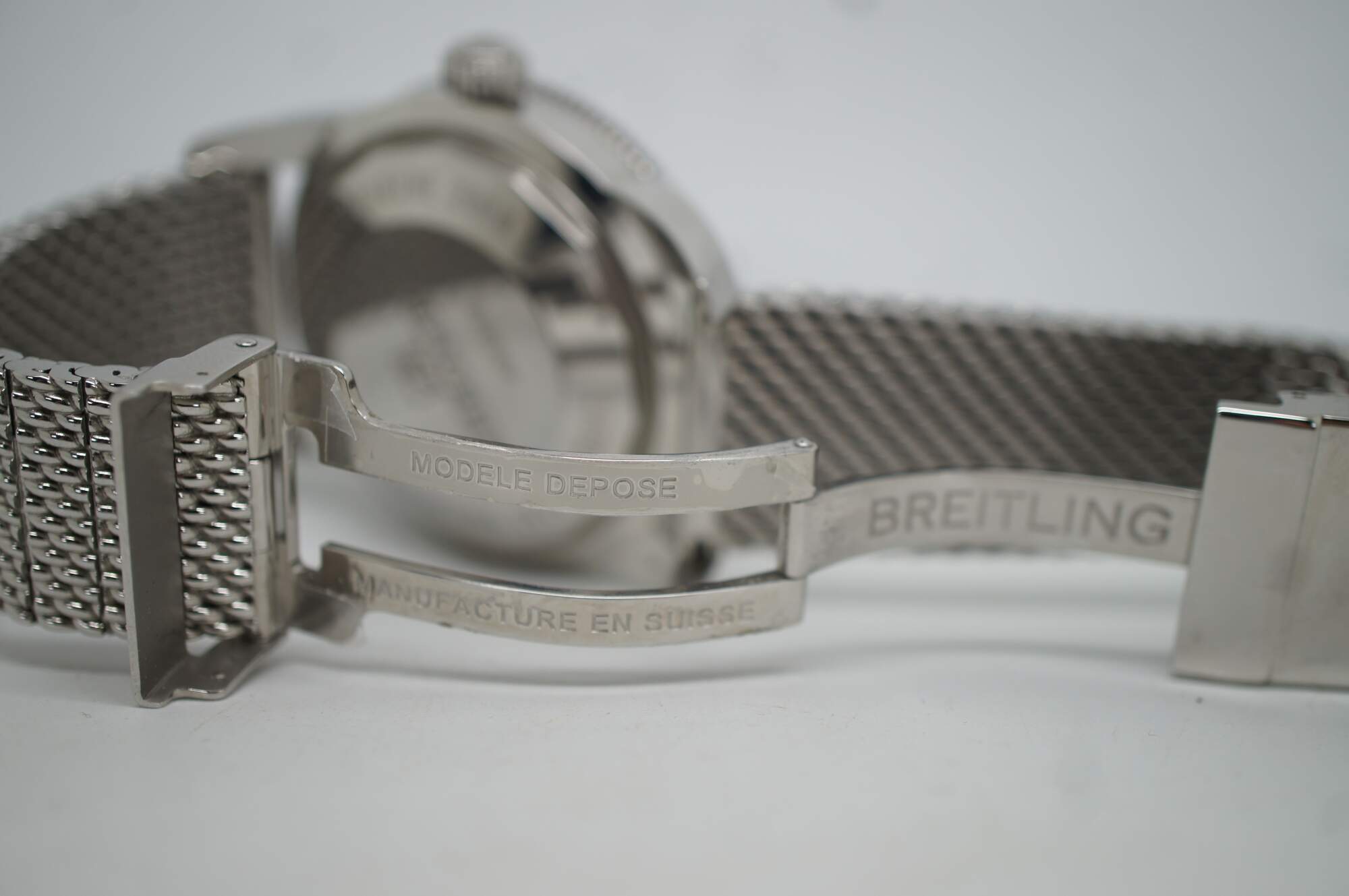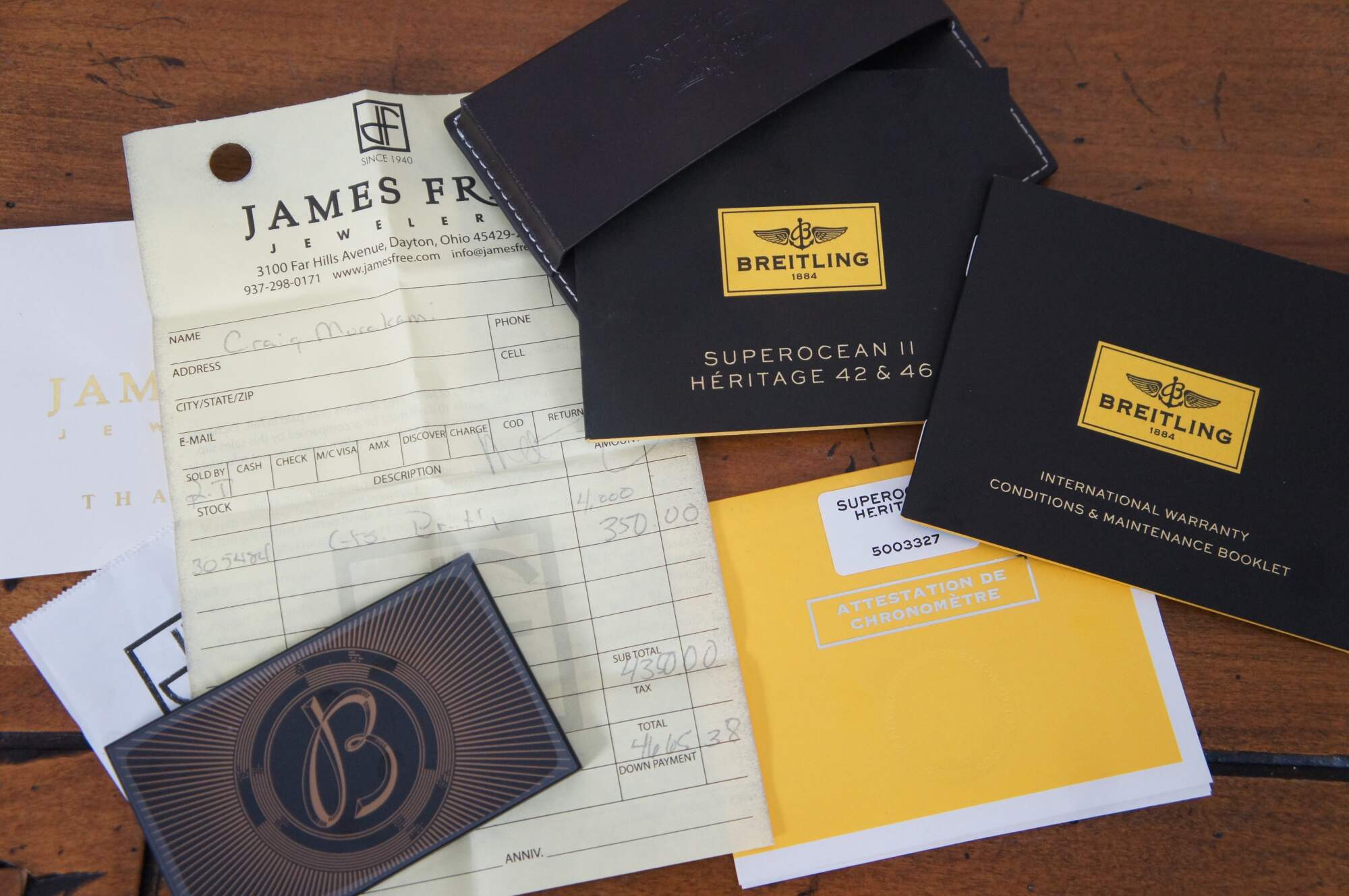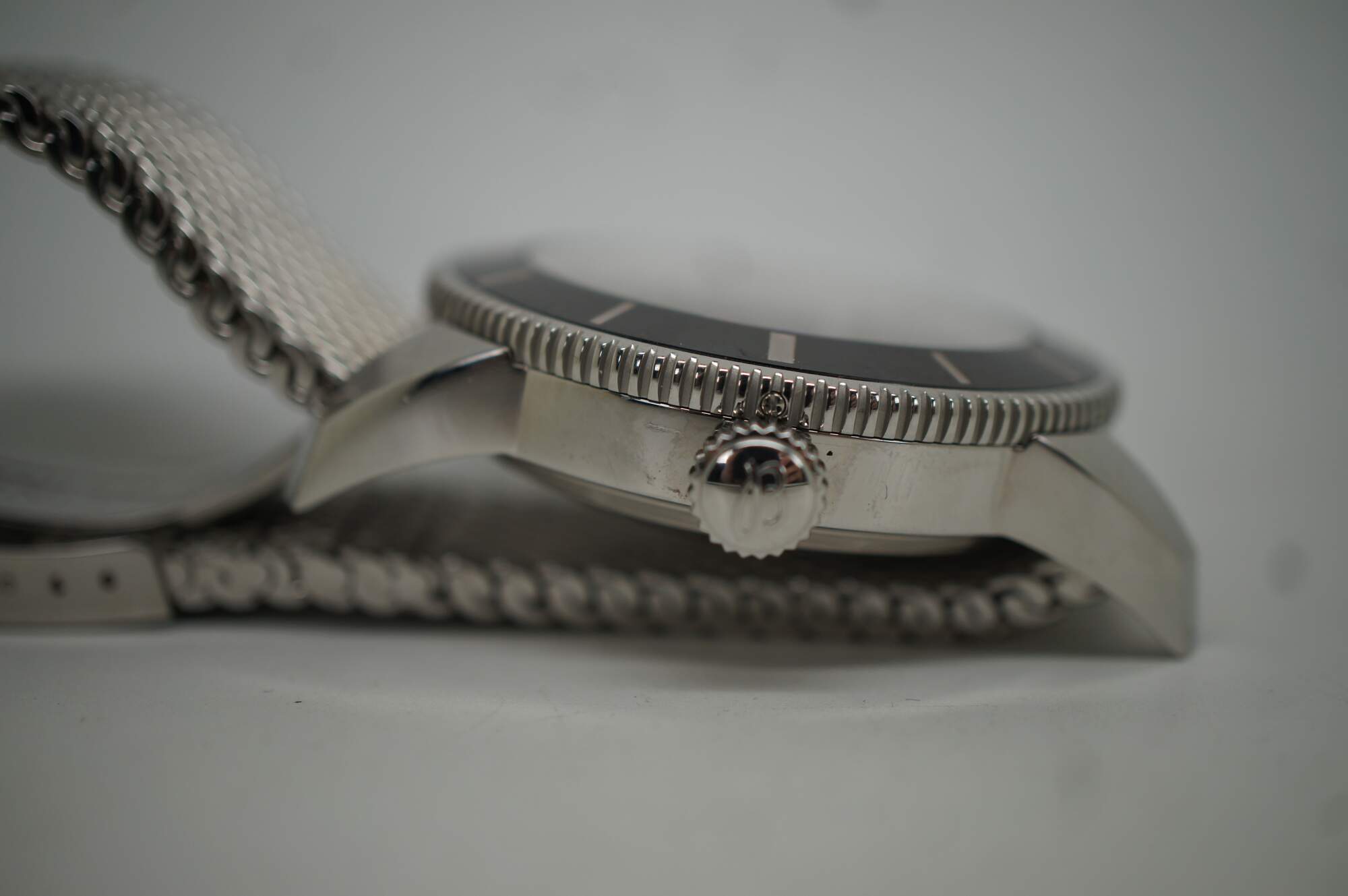 Breitling Superocean Heritage II 46 AB2020 wrist watch with stainless steel mesh band, black ceramic bezel and black sunburst dial, with anti reflective coating on both sides of the sapphire crystal, and Superluminova on hands, hour markers, and triangle on the bezel for visibility in low light. Includes original interior and exterior boxes, plus original receipt, warranty card, and paperwork.