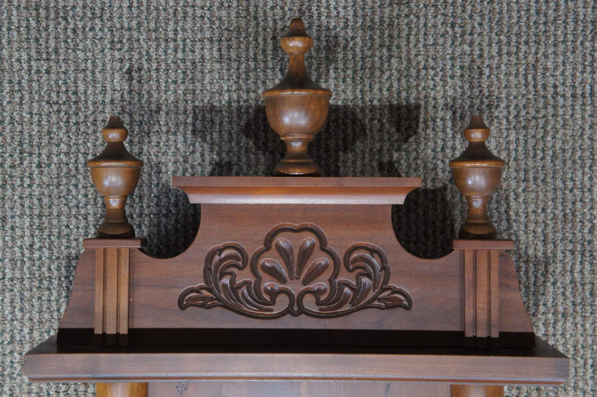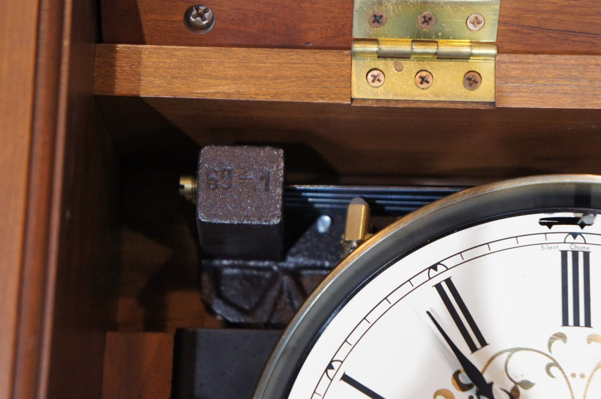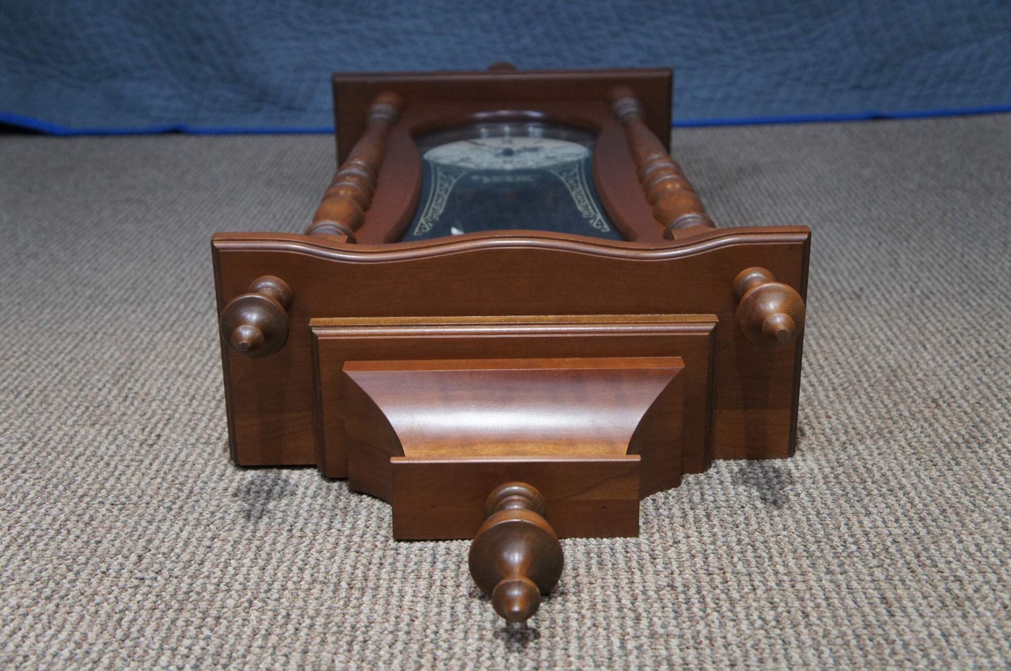 Vintage Ezee-Set #725 wall clock by Ansonia Clock Company. Case features spindle columns and urn shaped finials, carved scallop/floral detail on the pediment, molded grapes on the brass pendulum, and a painted glass front with the words “Lord, through this hour – Be thou our guide – So, by thy power – No foot shall slide.” Cleaned and adjusted, overhauled, new click spring, and new suspension spring – 2015.