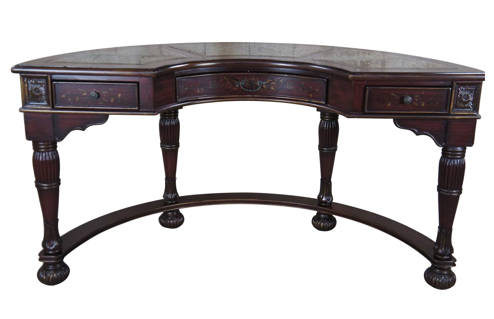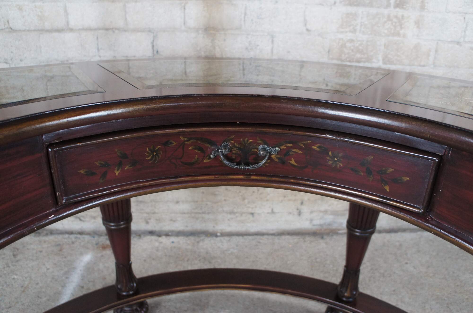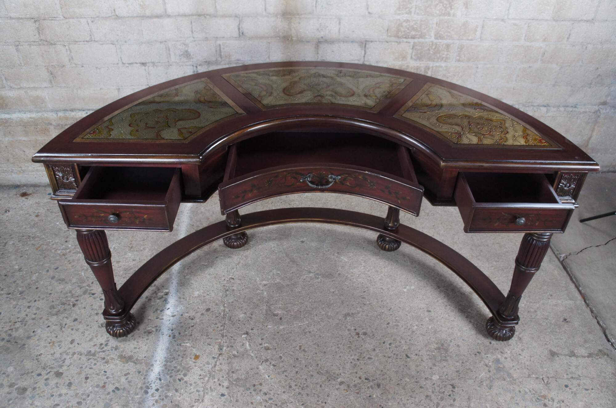 Vintage demilune writing or library desk featuring half round form with scrolled acanthus accents, three inset bevelled glass panels and three drawers.