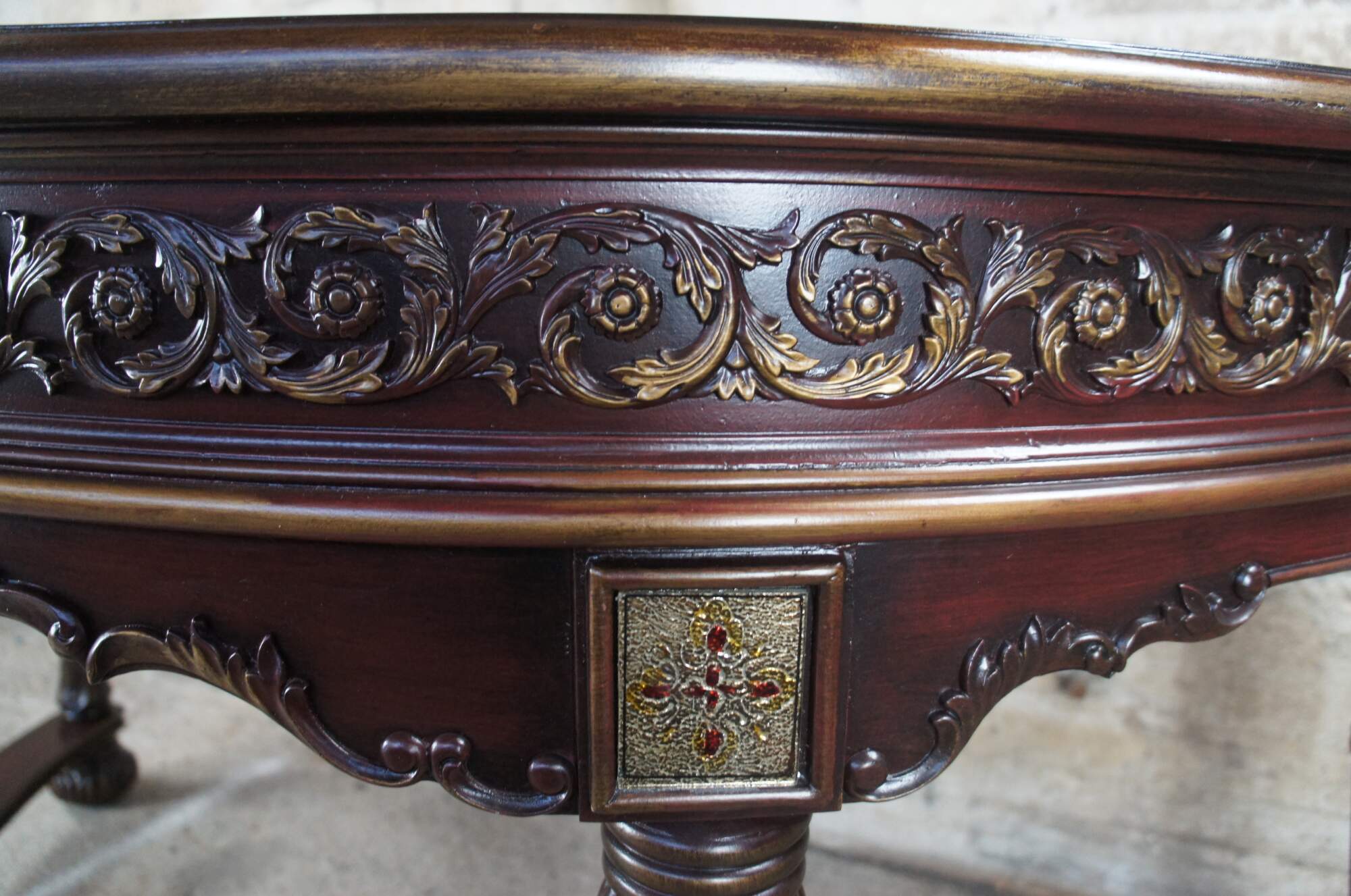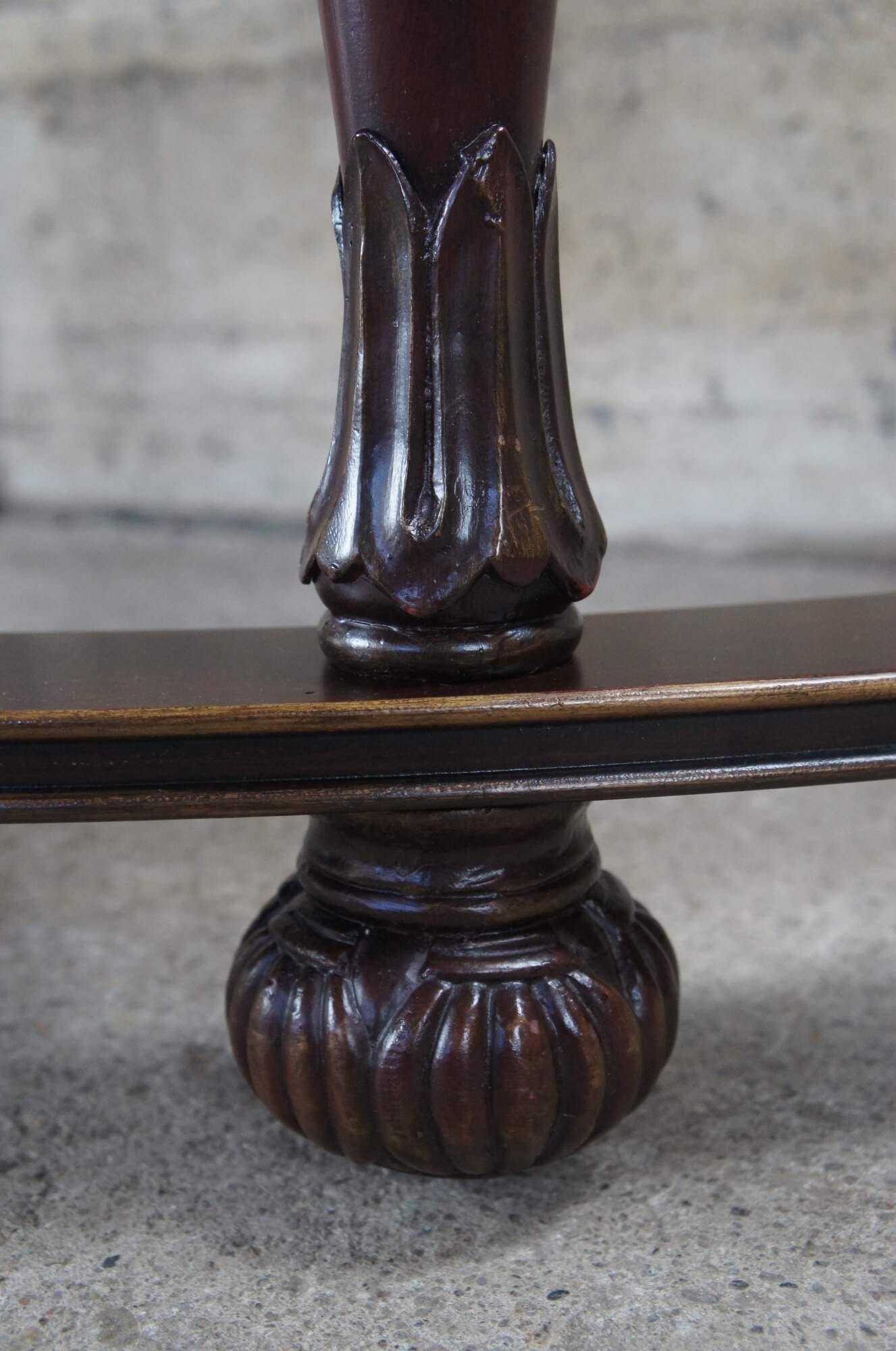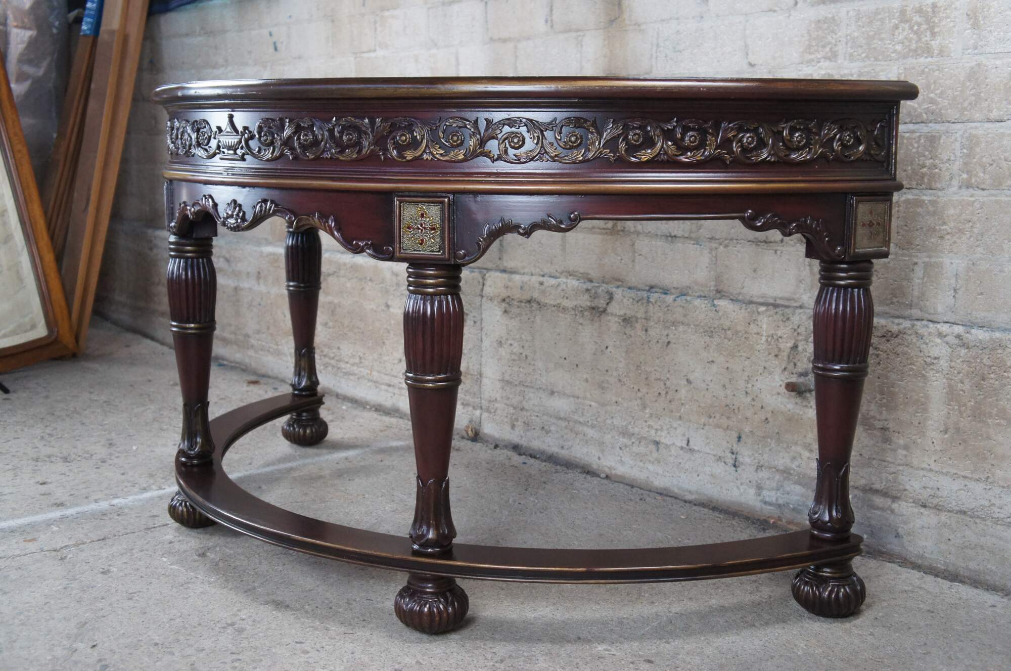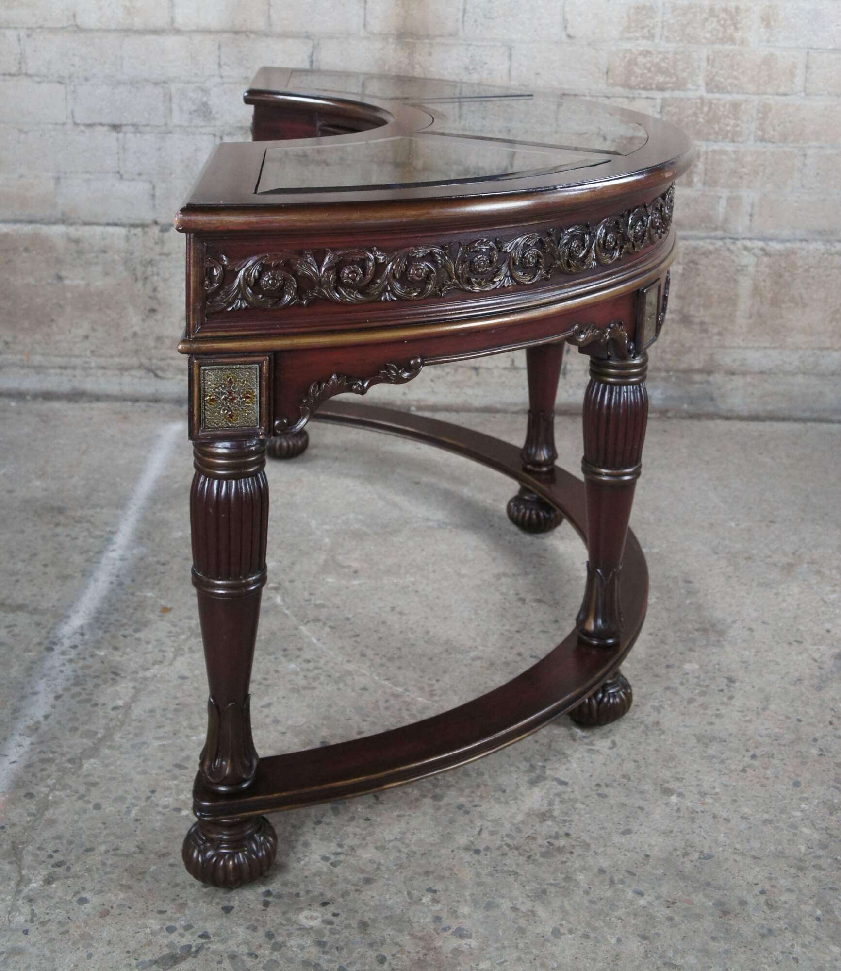 Vintage demilune writing or library desk featuring half round form with scrolled acanthus accents, three inset bevelled glass panels and three drawers.