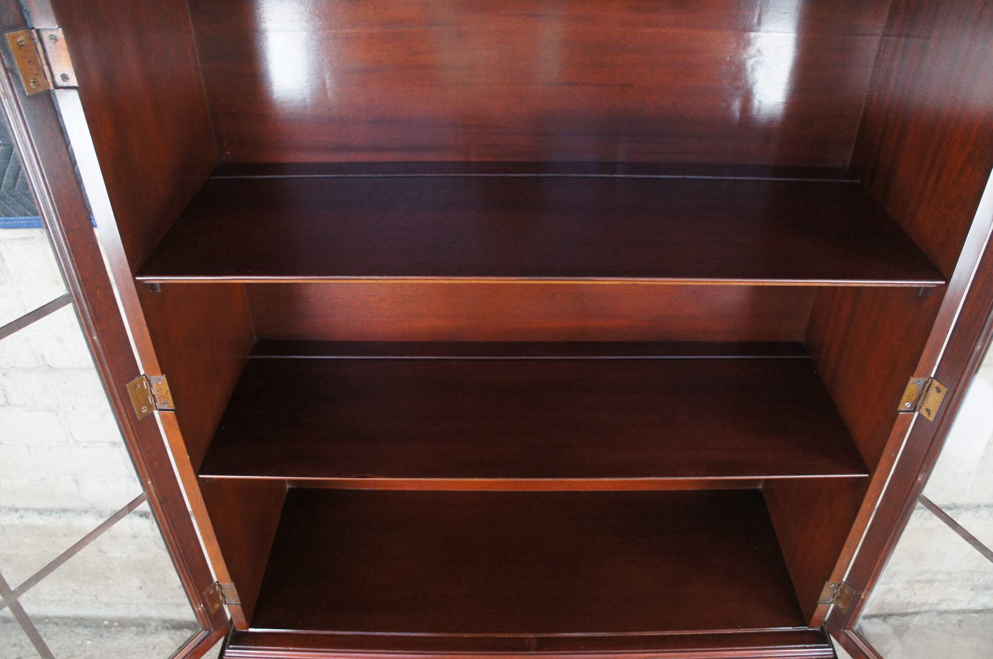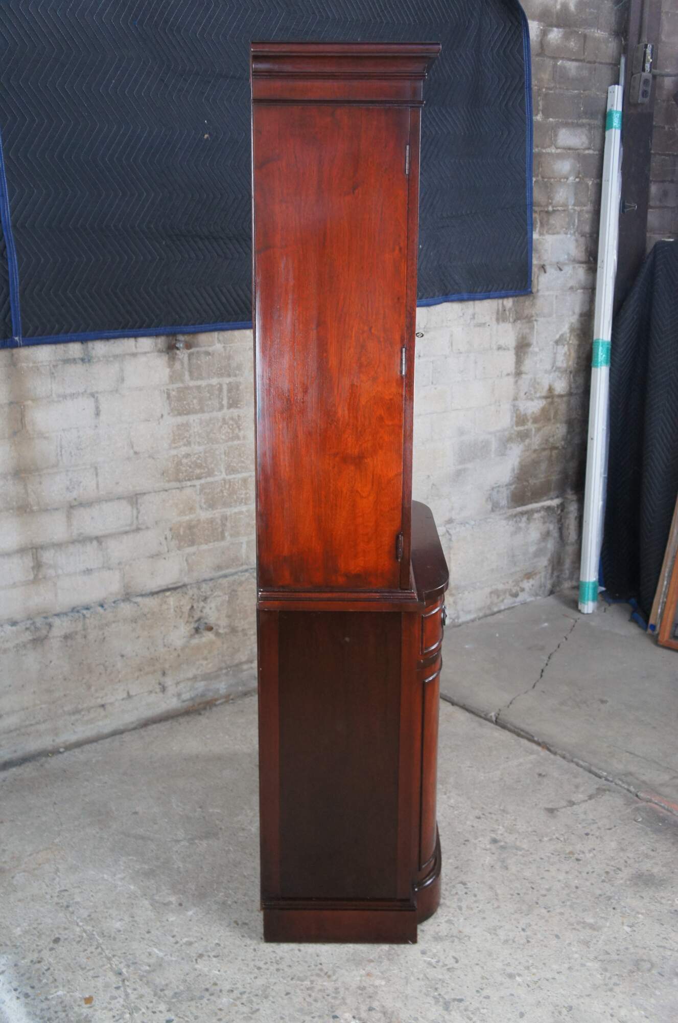 Vintage Drexel Georgian Style Bowfront china cabinet or cupboard, circa 1940s. Made of genuine mahogany featuring three upper shelves with plate grooves, over one drawer, and a lower cabinet. Lower cabinet and drawer fronts have a rich crotch / flame mahogany. No 4081.