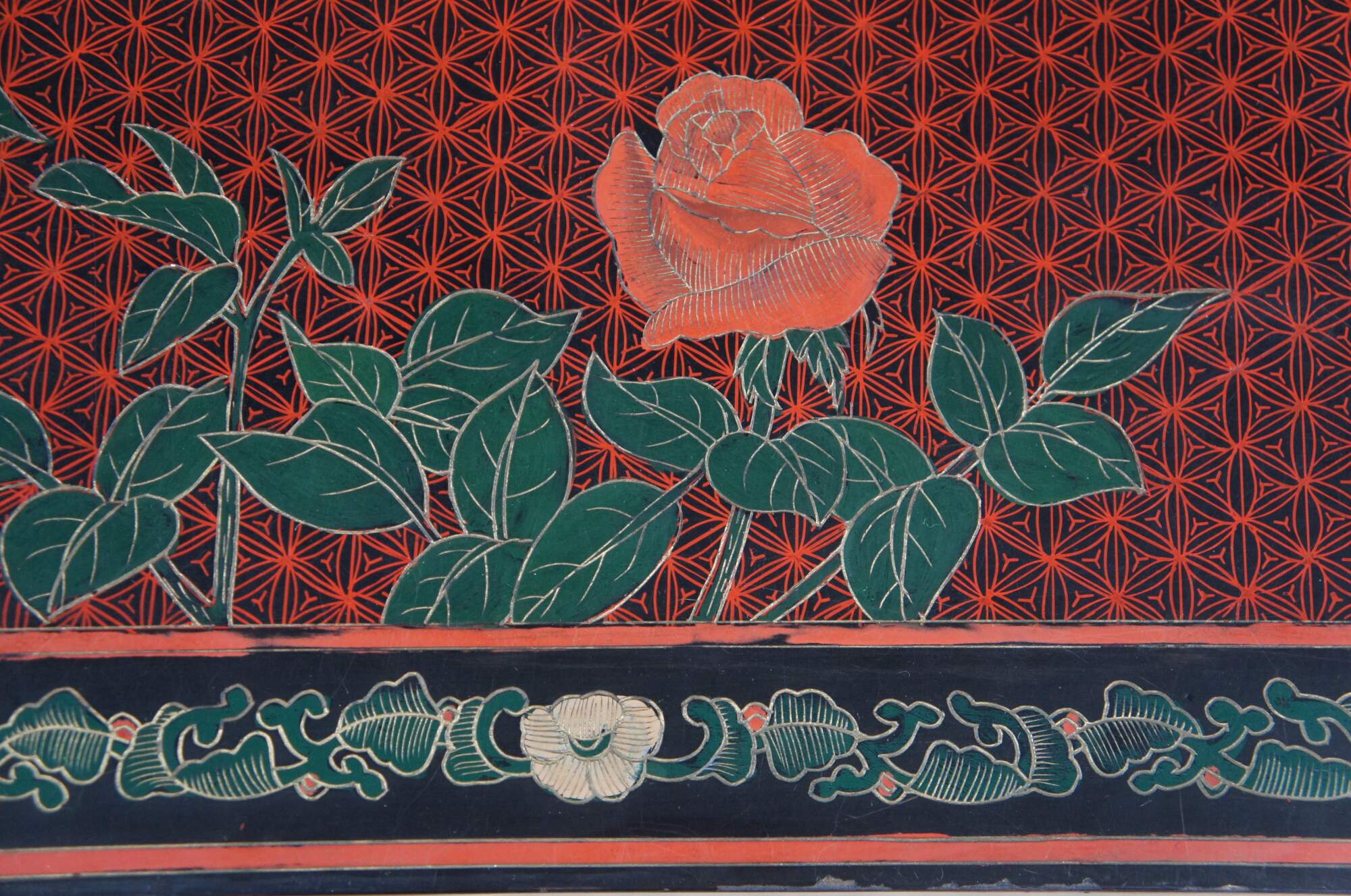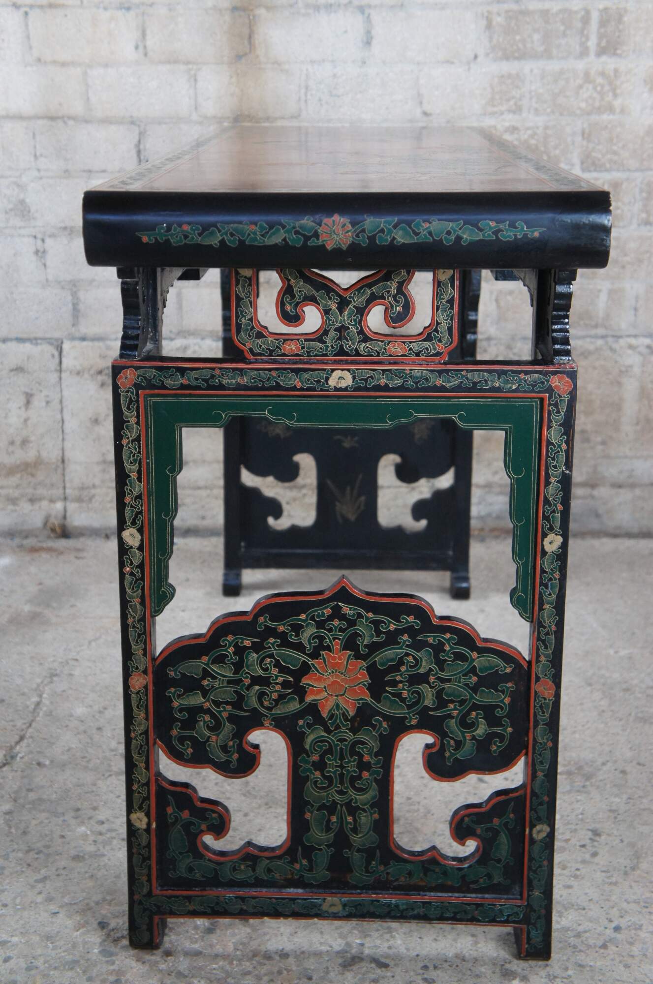 Vintage Jinlong Ming style altar console table featuring reticulated accents with a floral rose bamboo and bird scene with black lacquered field and vibrant greens and reds.