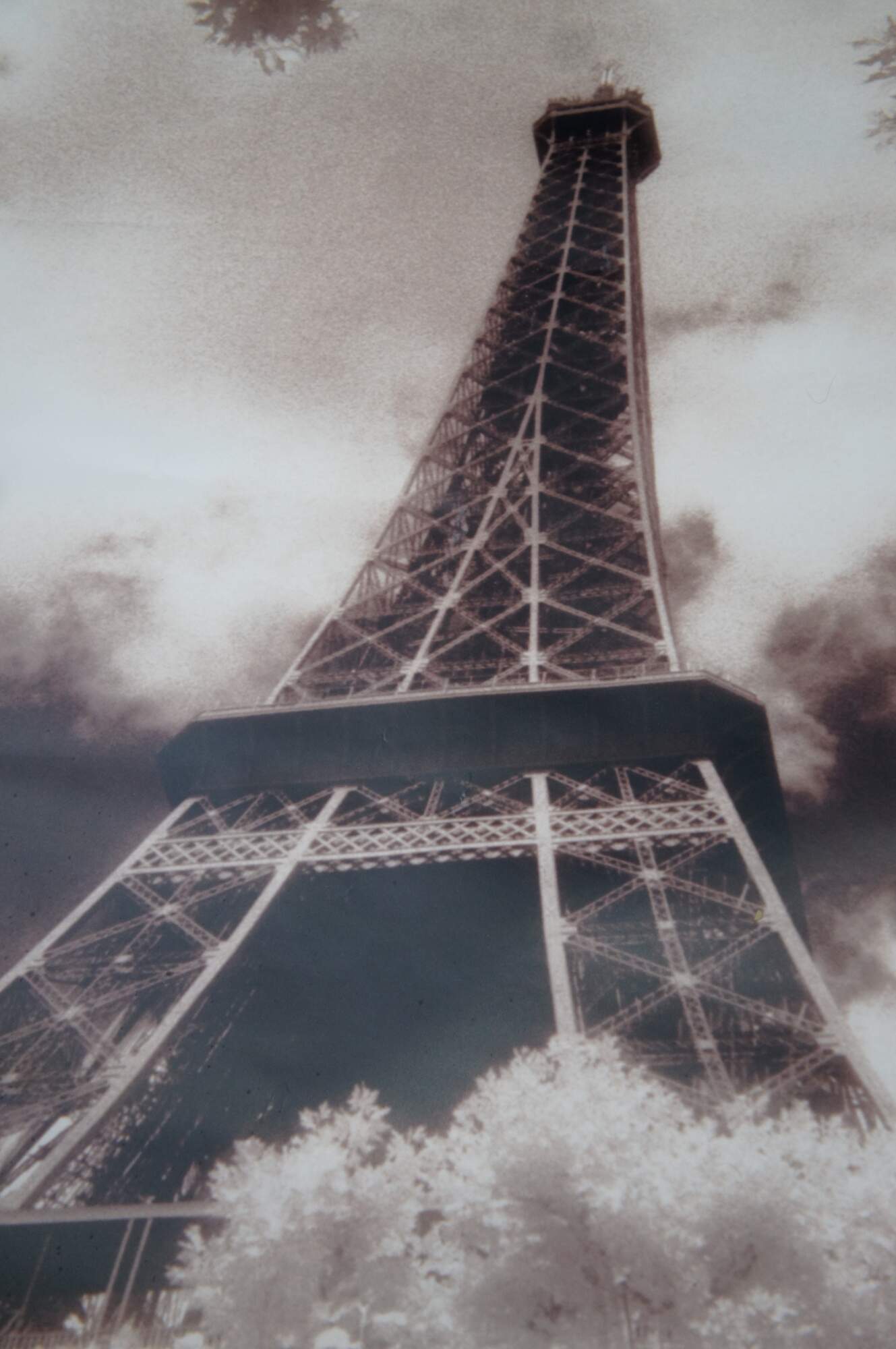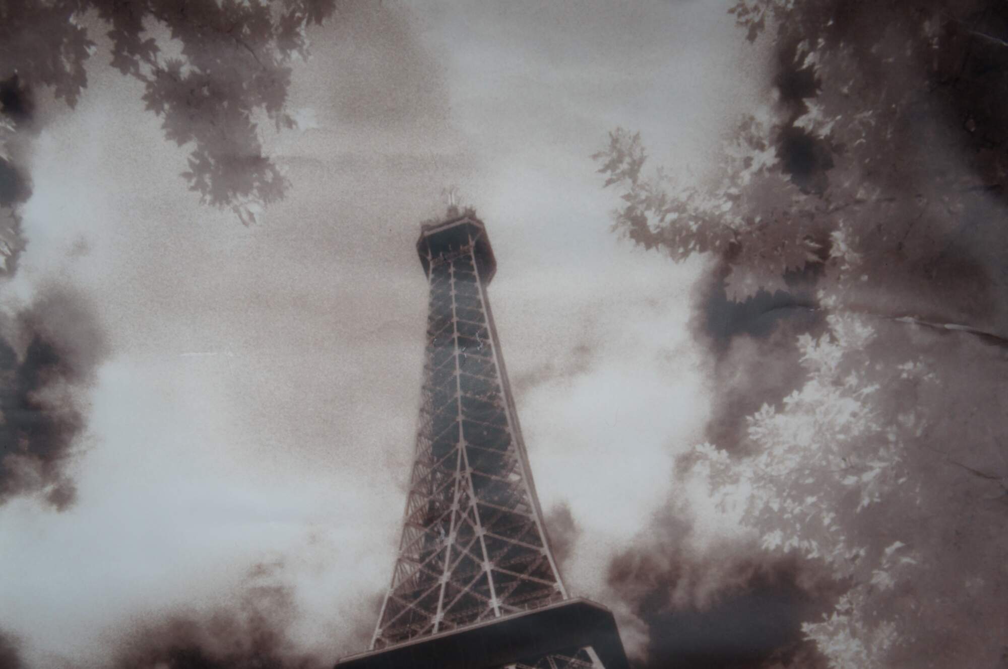 Huge sepia toned poster of the Eiffel Tower, looking up through the trees of the Champ de Mars, By Jon Arnold. Printed on Fujicolor Crystal Archive Paper by Fujifilm.