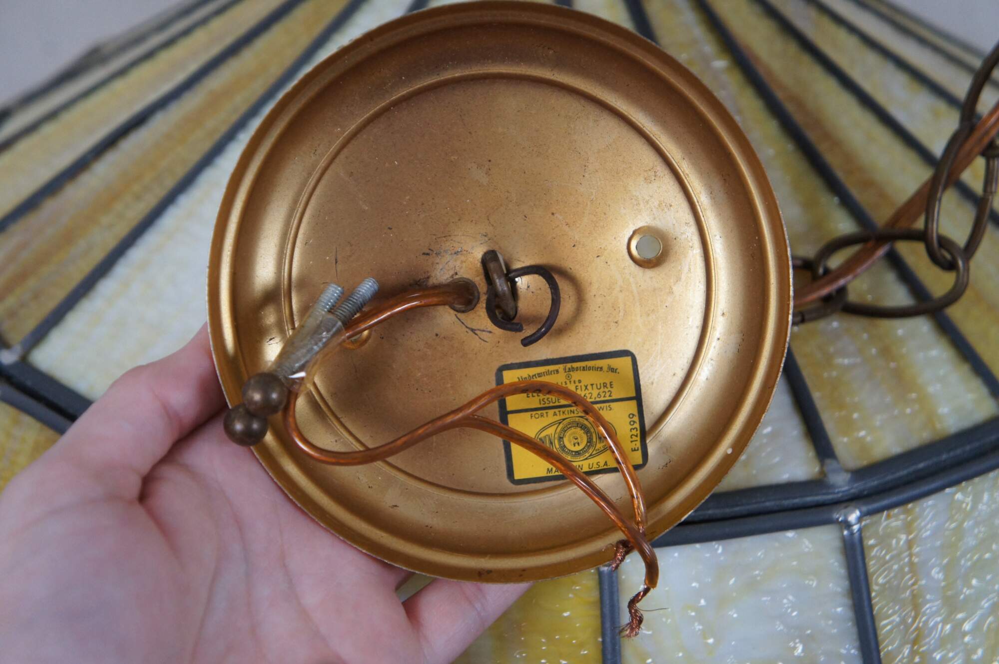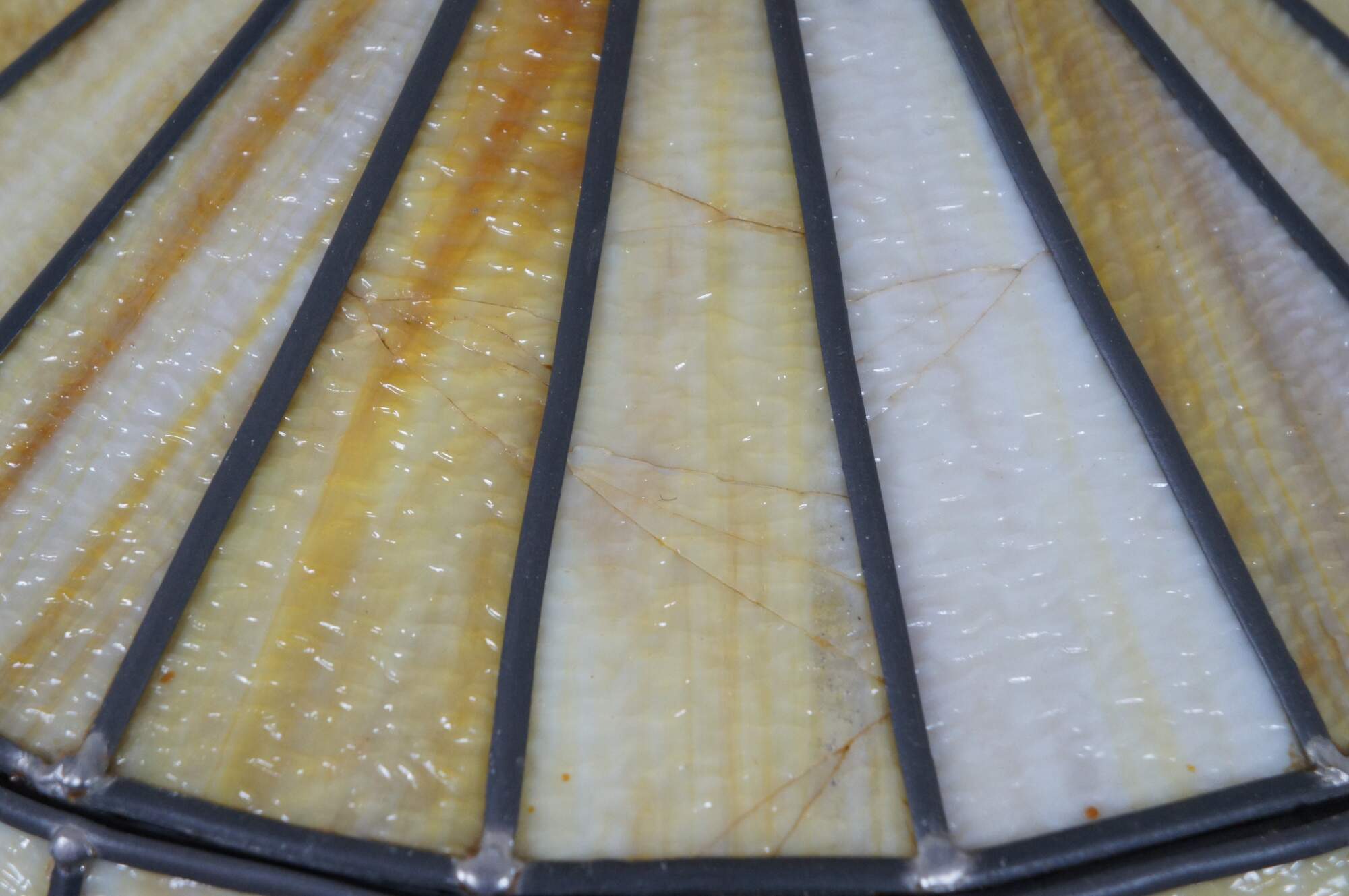 Vintage Tiffany style swag / pendant light / chandelier crafted of leaded yellow and cream slag glass panels with a band of amber stained glass above the scalloped lower edge.