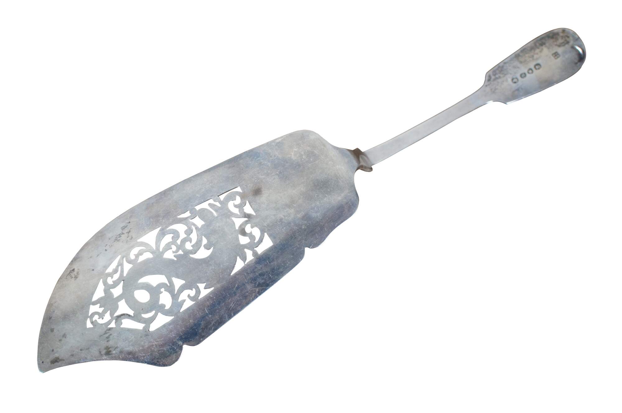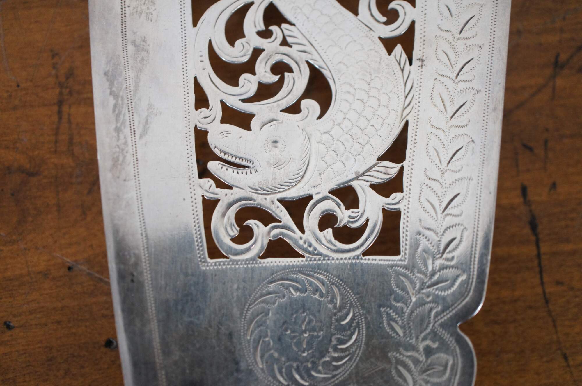 Antique English Victorian sterling silver fish / cake server featuring a tipped handle, etched leaf motif, and pierced foliate and dolphin / fish design; made in 1846 by Joseph II & Albert Savory of London. Handle monogrammed with the initials LC.