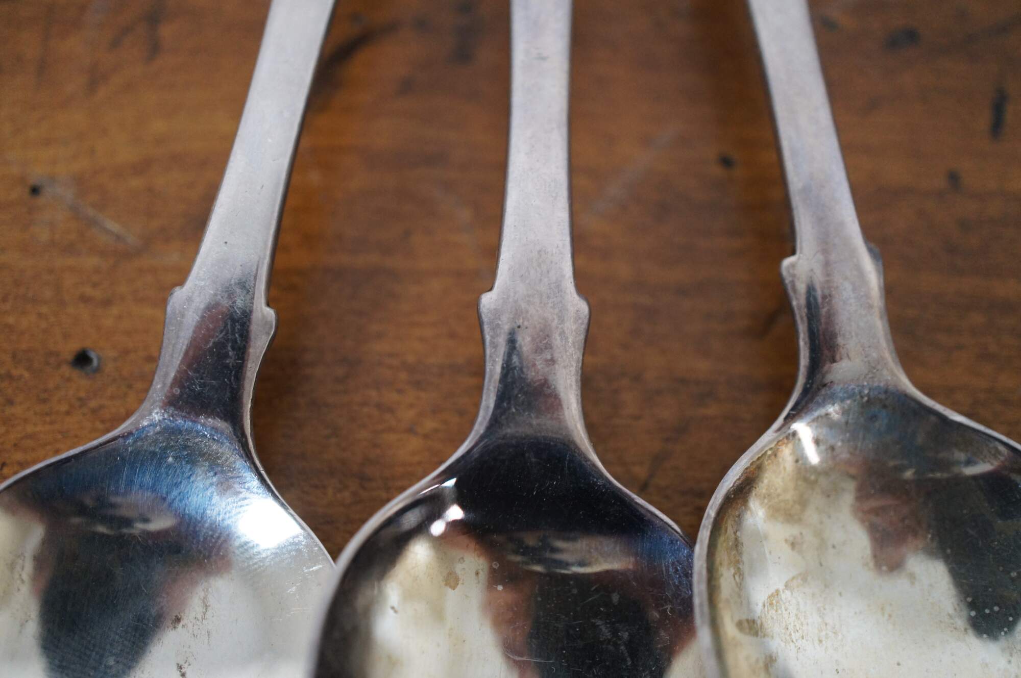 Set of three antique early 19th century sterling silver teaspoons with tipped fiddle shaped handles, engraved with the head of a sea serpent or dragon; made in 1821 by William Bateman I of London.