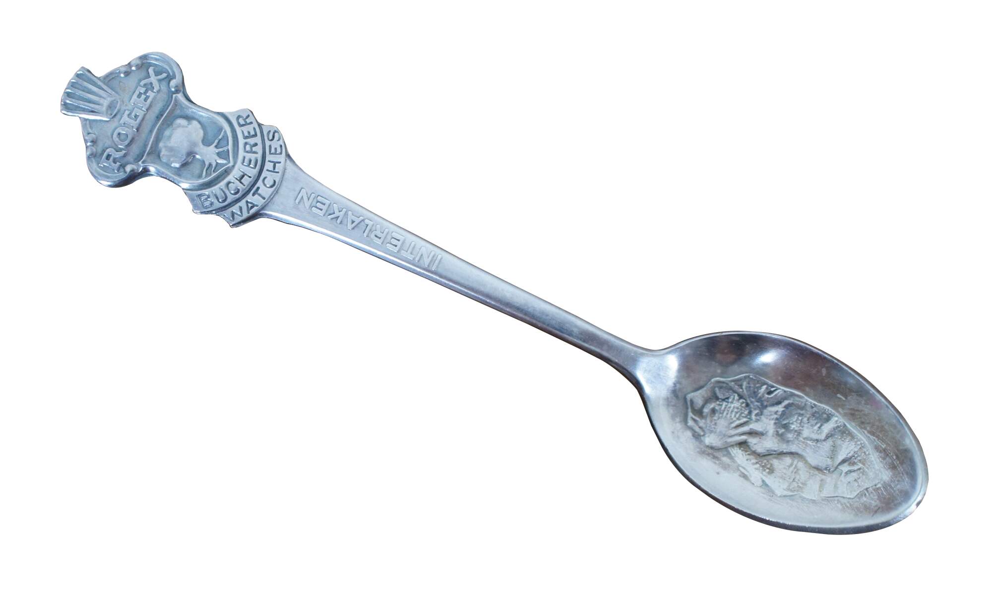 Vintage Rolex Bucherer Watches Interlaken silver plate souvenir spoon with molded moutain landscape in the bowl. Marked B 100 12 on handle.
