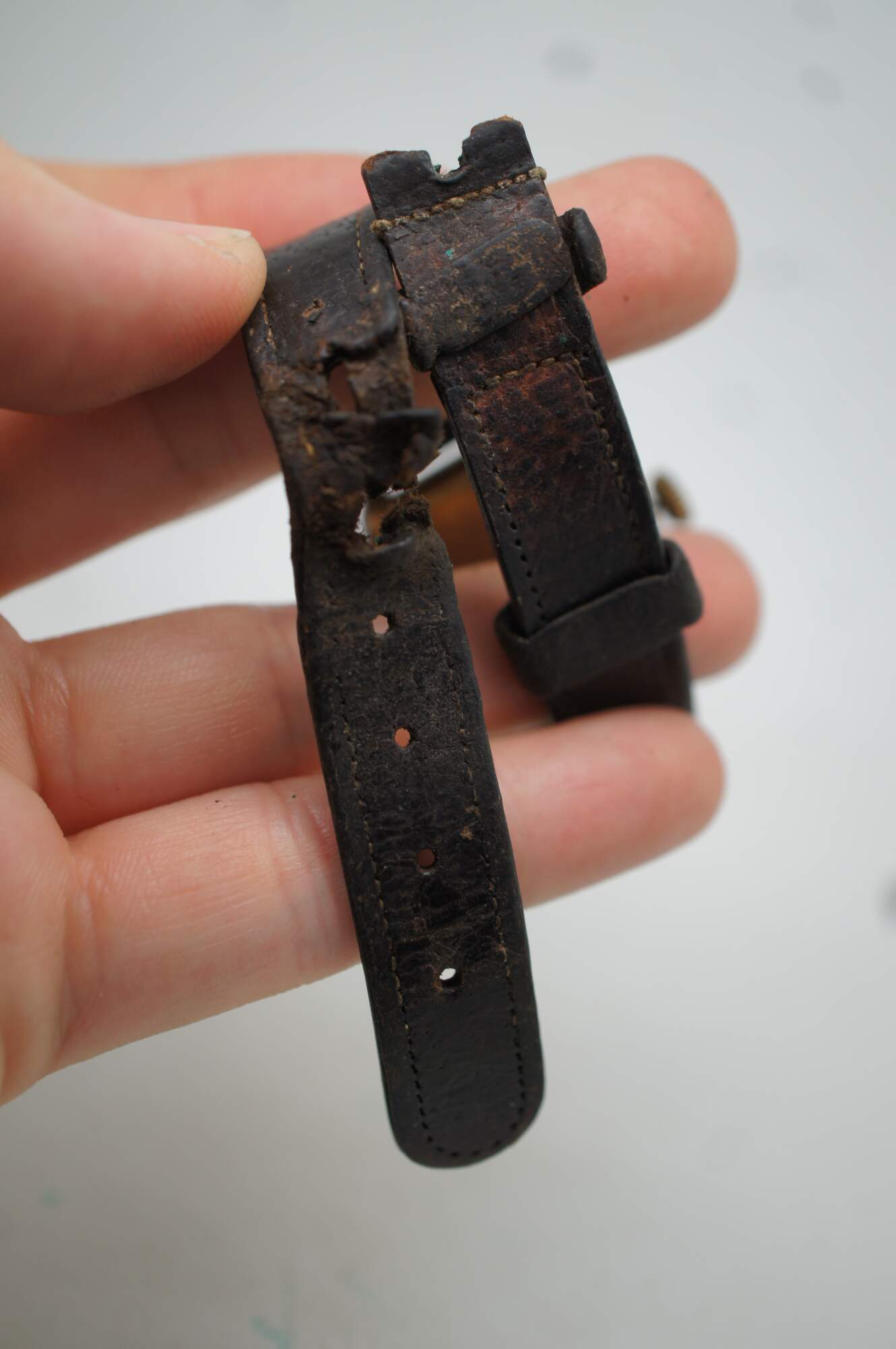 Fair Condition - Moderate wear to leather; no buckle; tarnish/oxidation/discoloration, not tested.