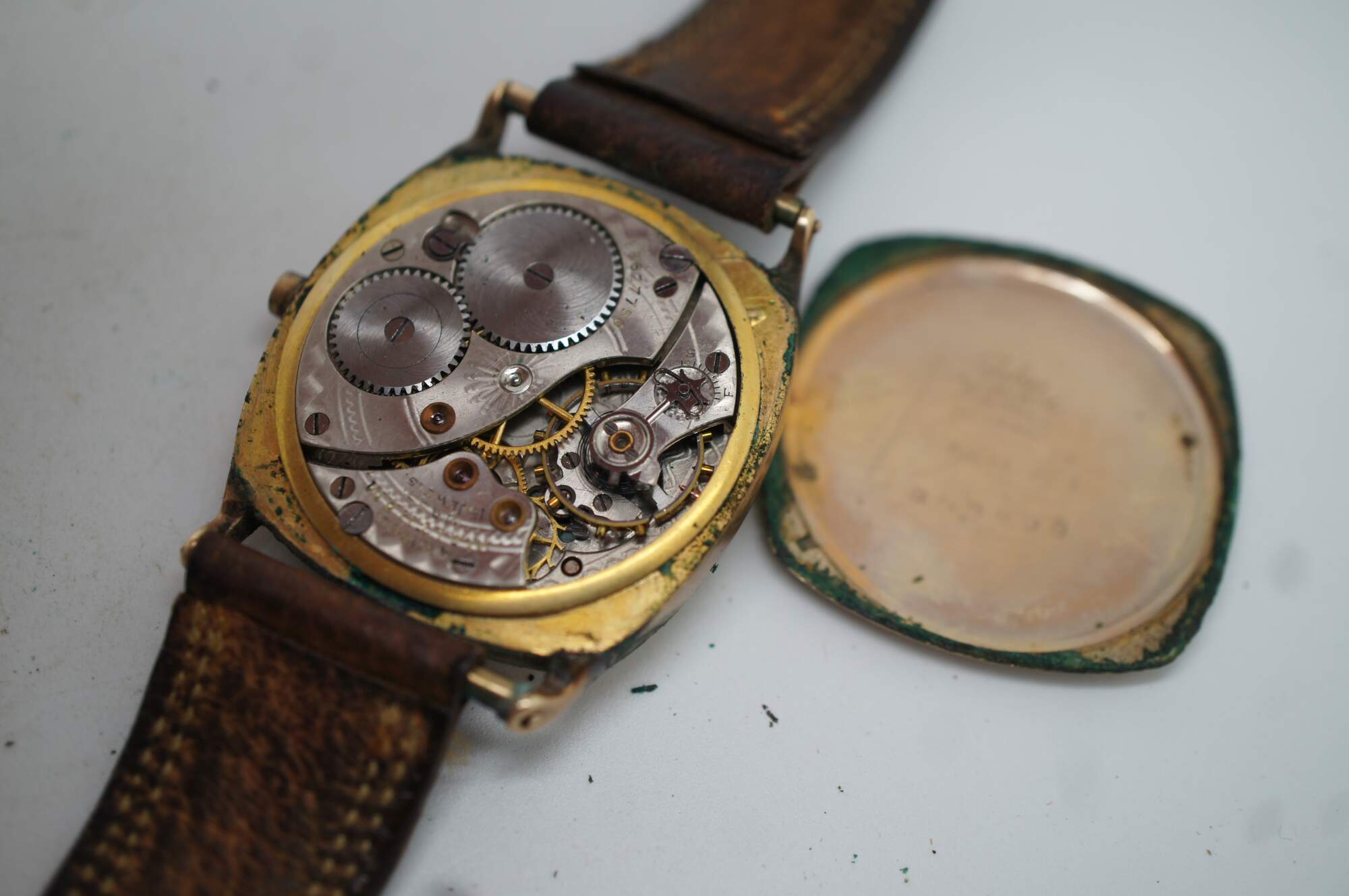 Antique (produced circa 1914) gold toned wrist watch by the American Waltham Watch Co of Waltham, Massachusetts - 15 Jewels, works numbered 19627750. Case by Fahys Montauk, numbered 368998. Grade No. 165, 15 jewels, 0s. Brown leather band.