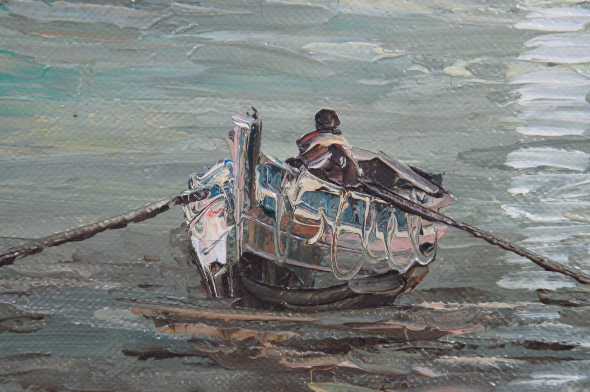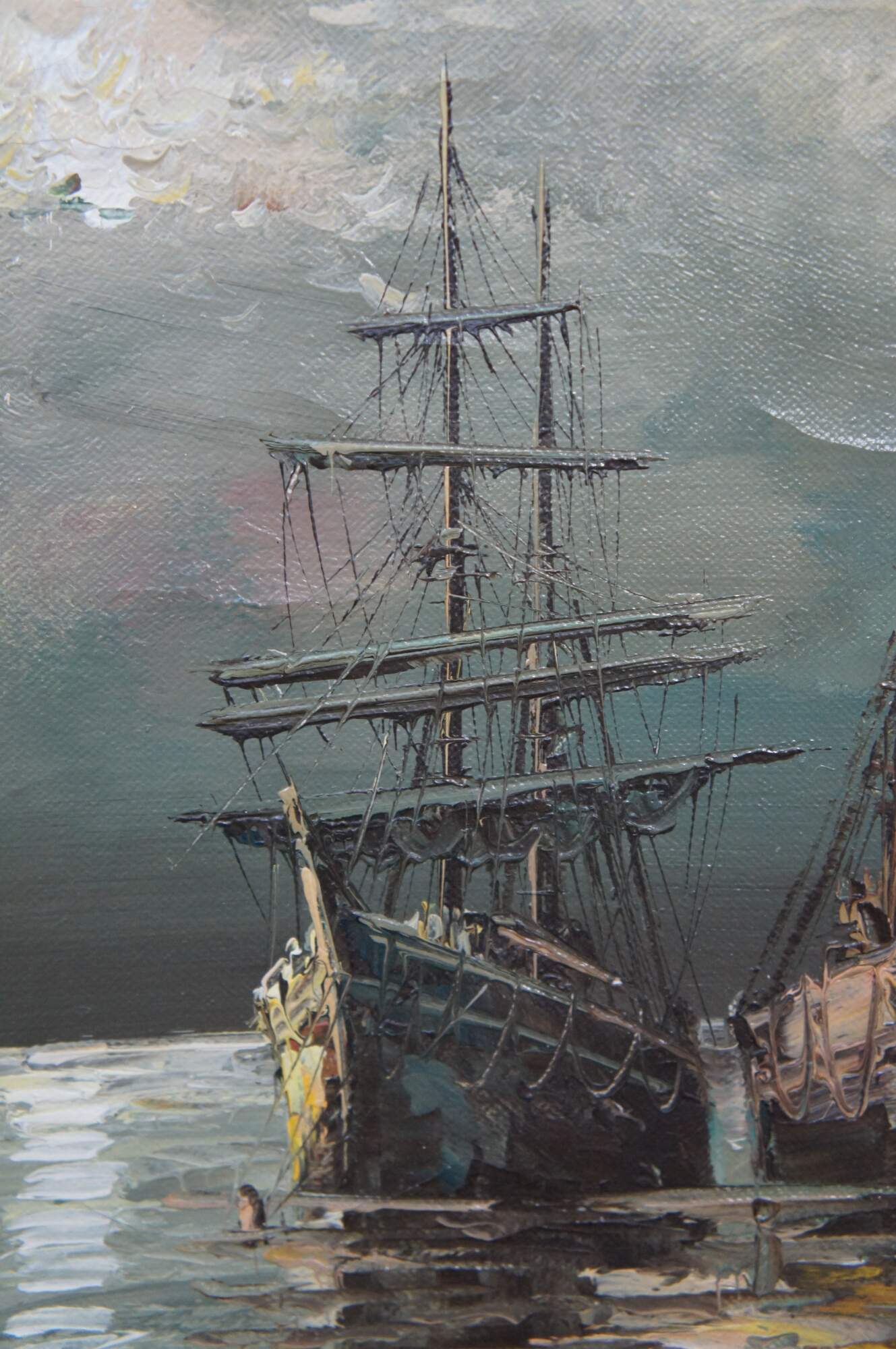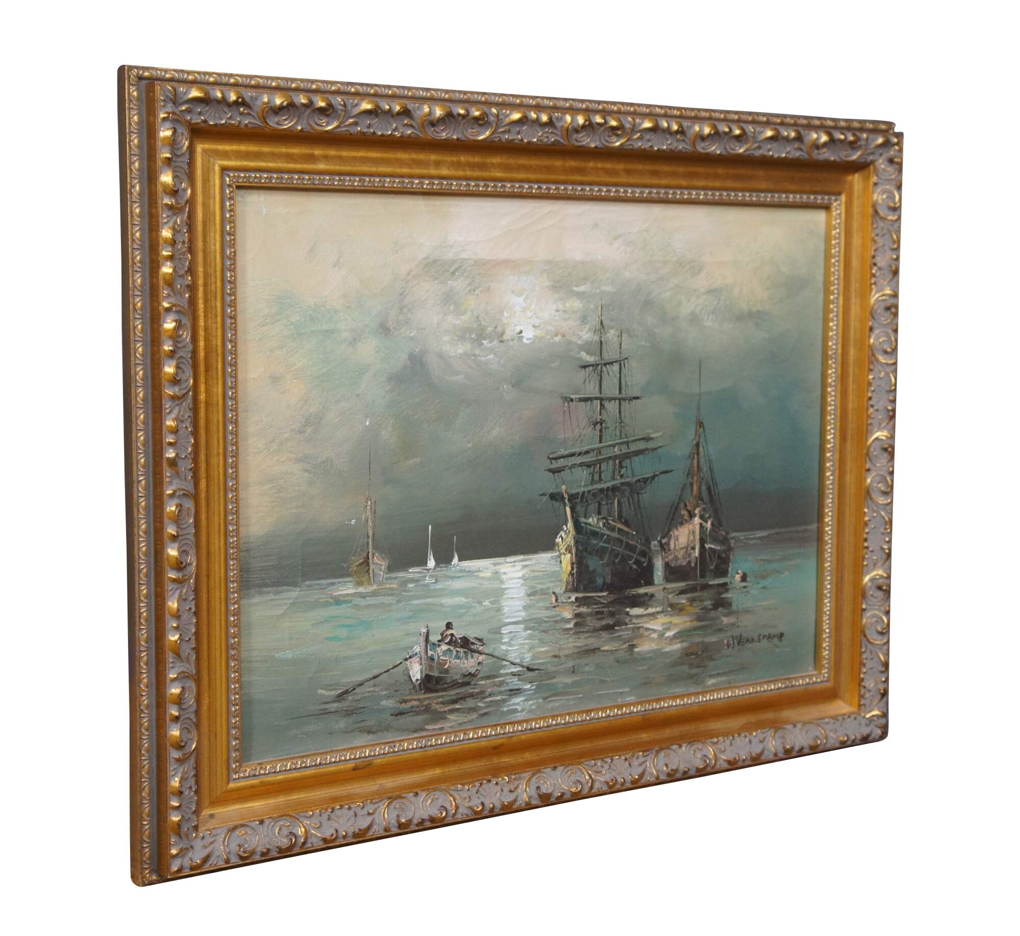 Late 20th century expressionist seascape showing several masted sailing ships and a row boat / dinghy, by W. Venneramp / Vannerkamp.