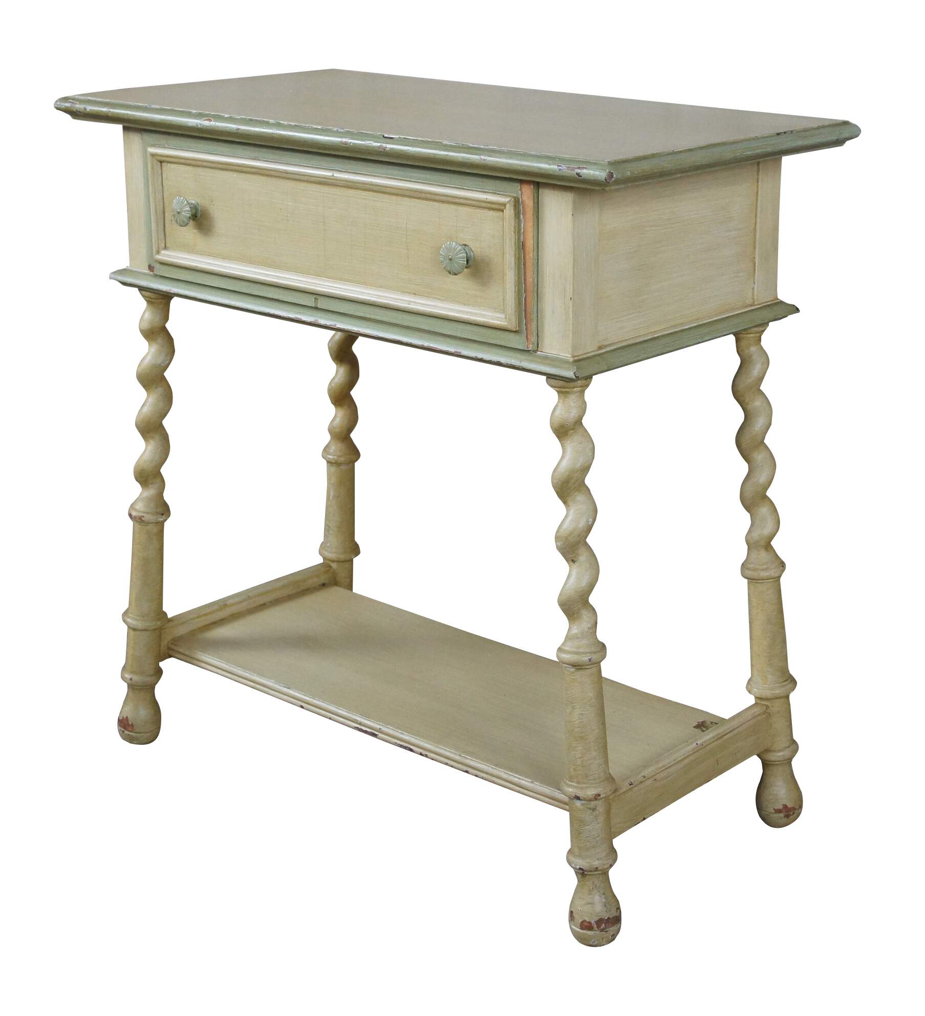 Distressing and wear commensurate with age. Paint chipping throughout. Some missing veneer along drawer front.