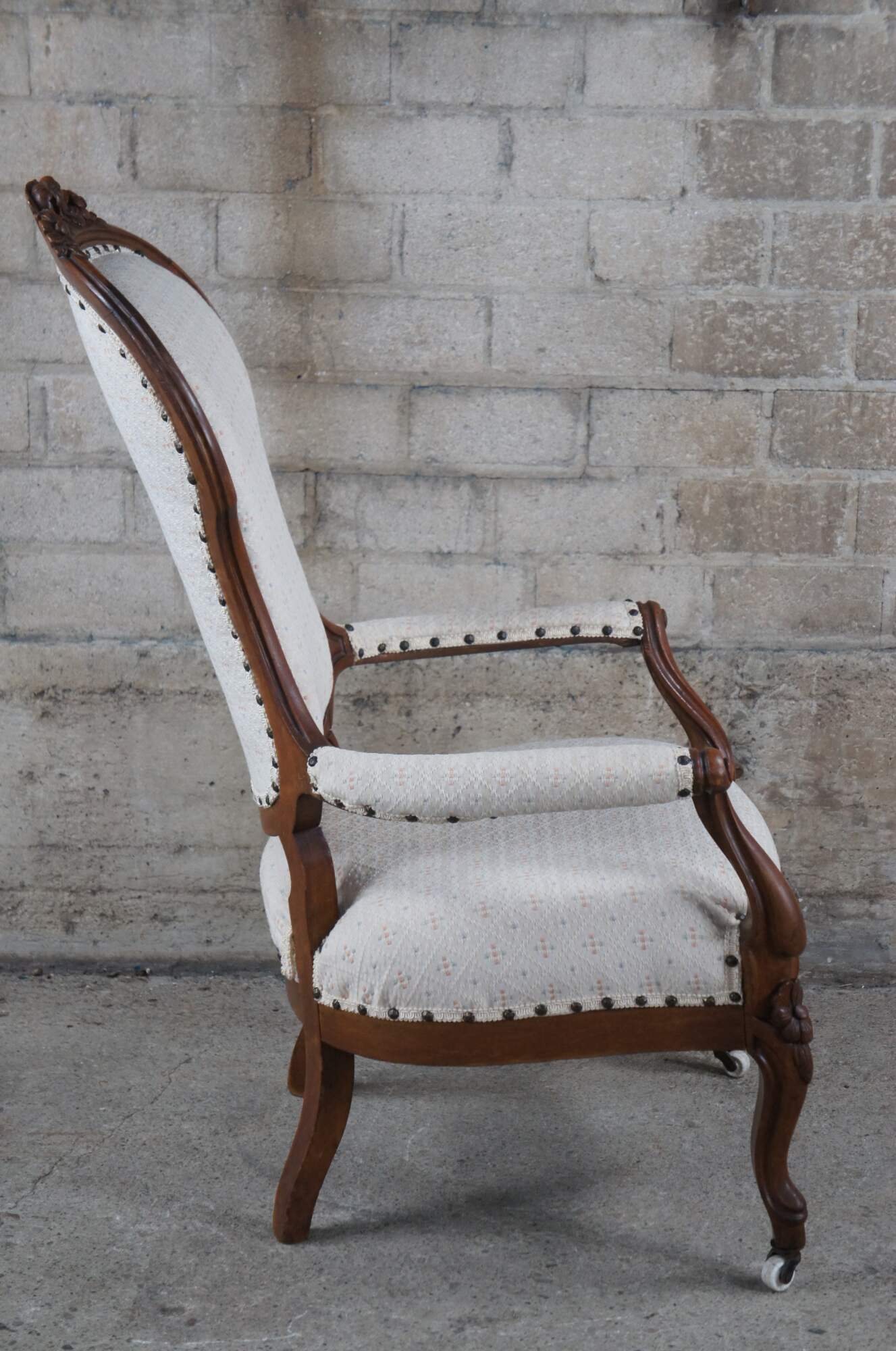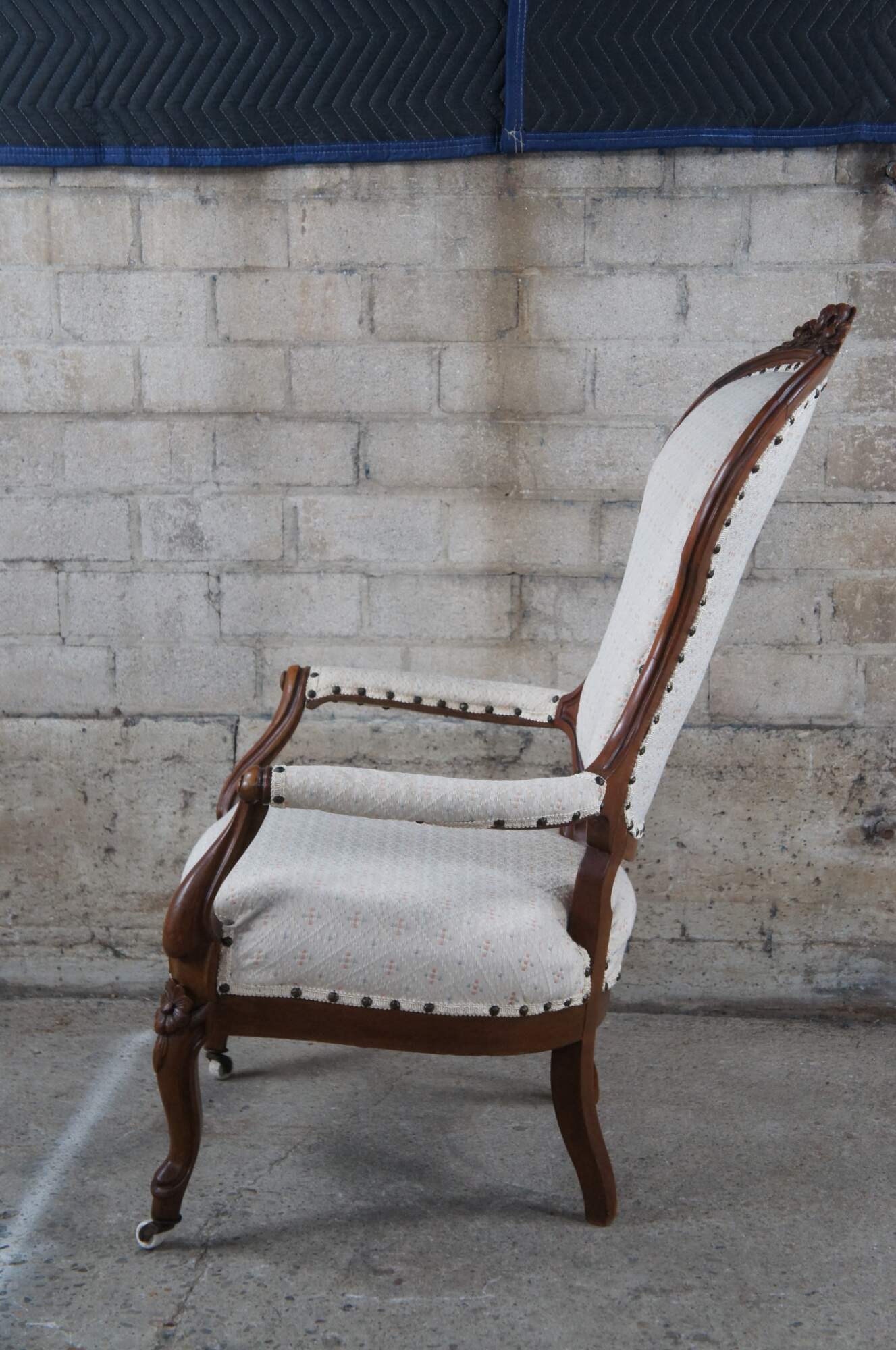 A lovely Victorian era spoon back arm chair. Made from walnut with flared and scrolled upholstered arms. Features daisy, rose and leaf carvings. The chair is raised over cabriole legs along the front with casters. Upholstery is white with a diamond pattern accented by a muted red and blue pattern at the center. Nail head trim is used over the cording throughout.