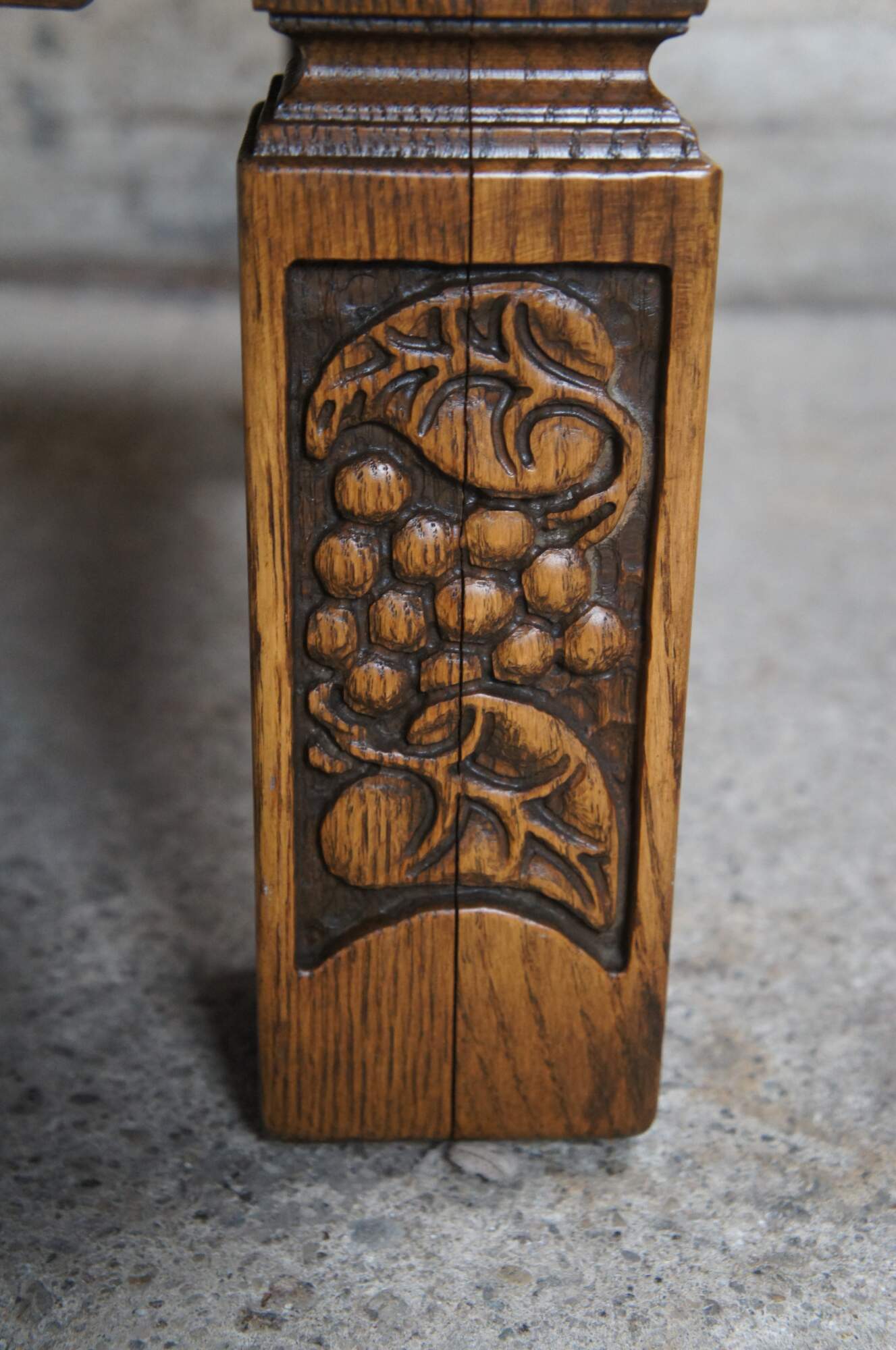 Time honored Norse designs are captured forever in centuries old oak, carefully selected and slowly seasoned to produce the glowing deep finish that suggest generations of use. Hand carving in historical Northland patterns carry the conviction of the work of authentic master a thousand years in the past.