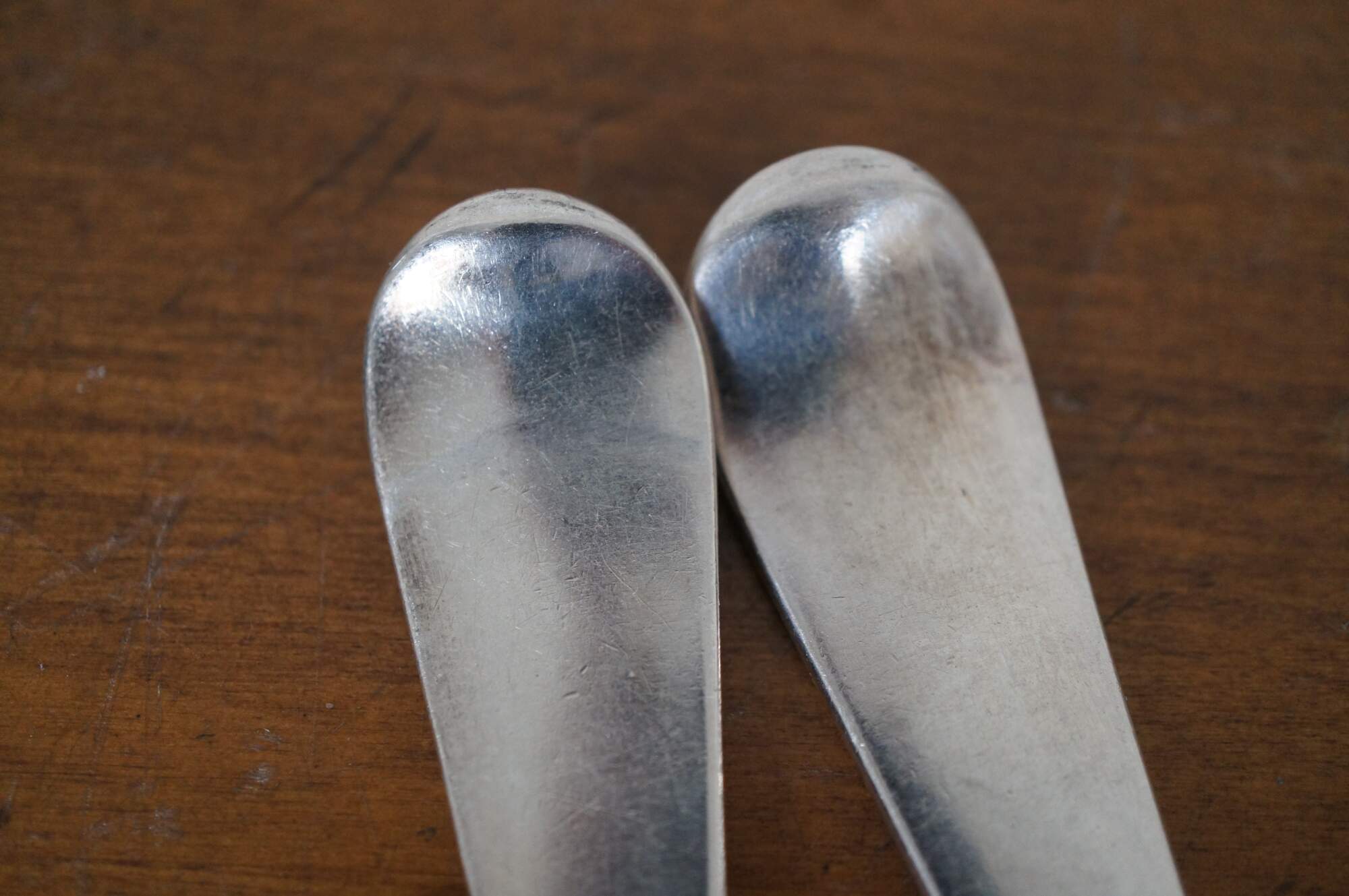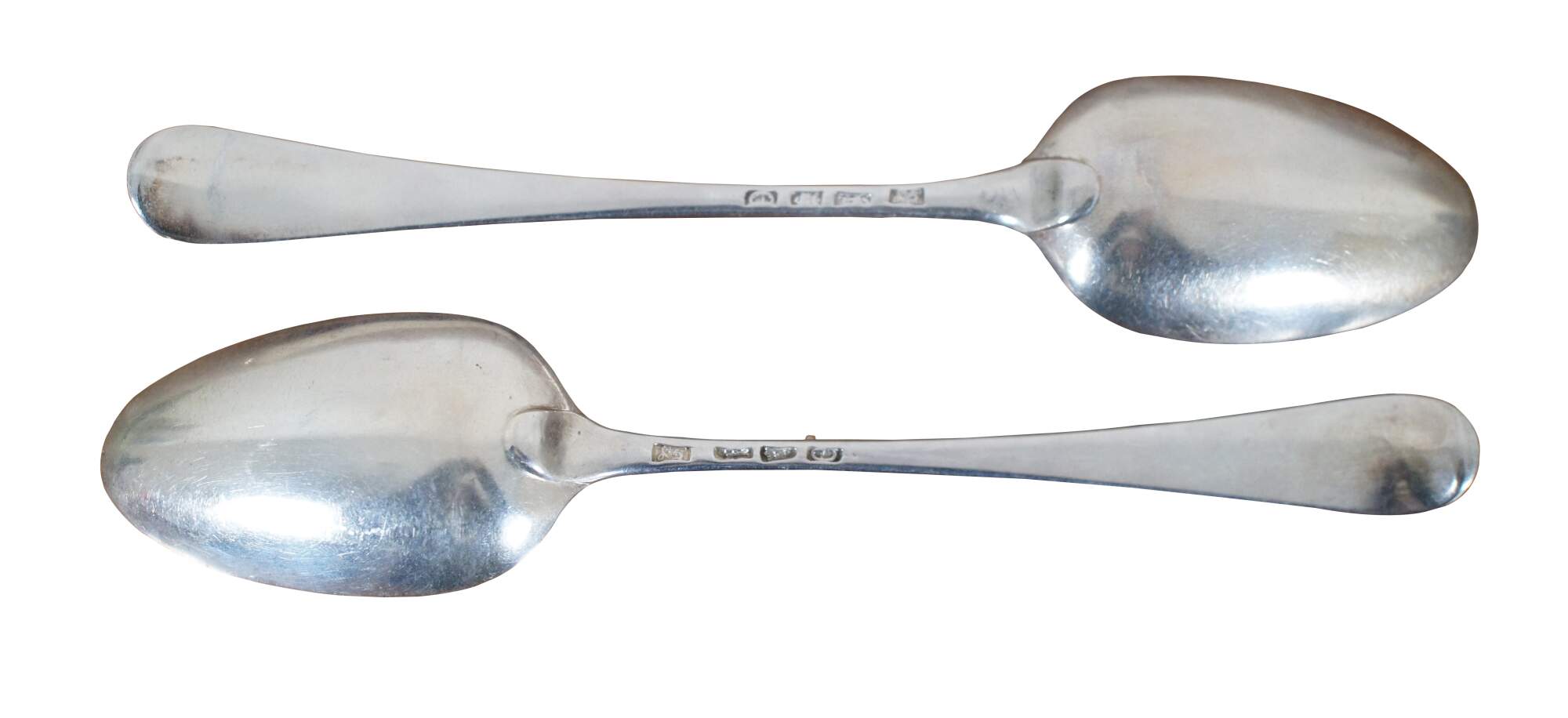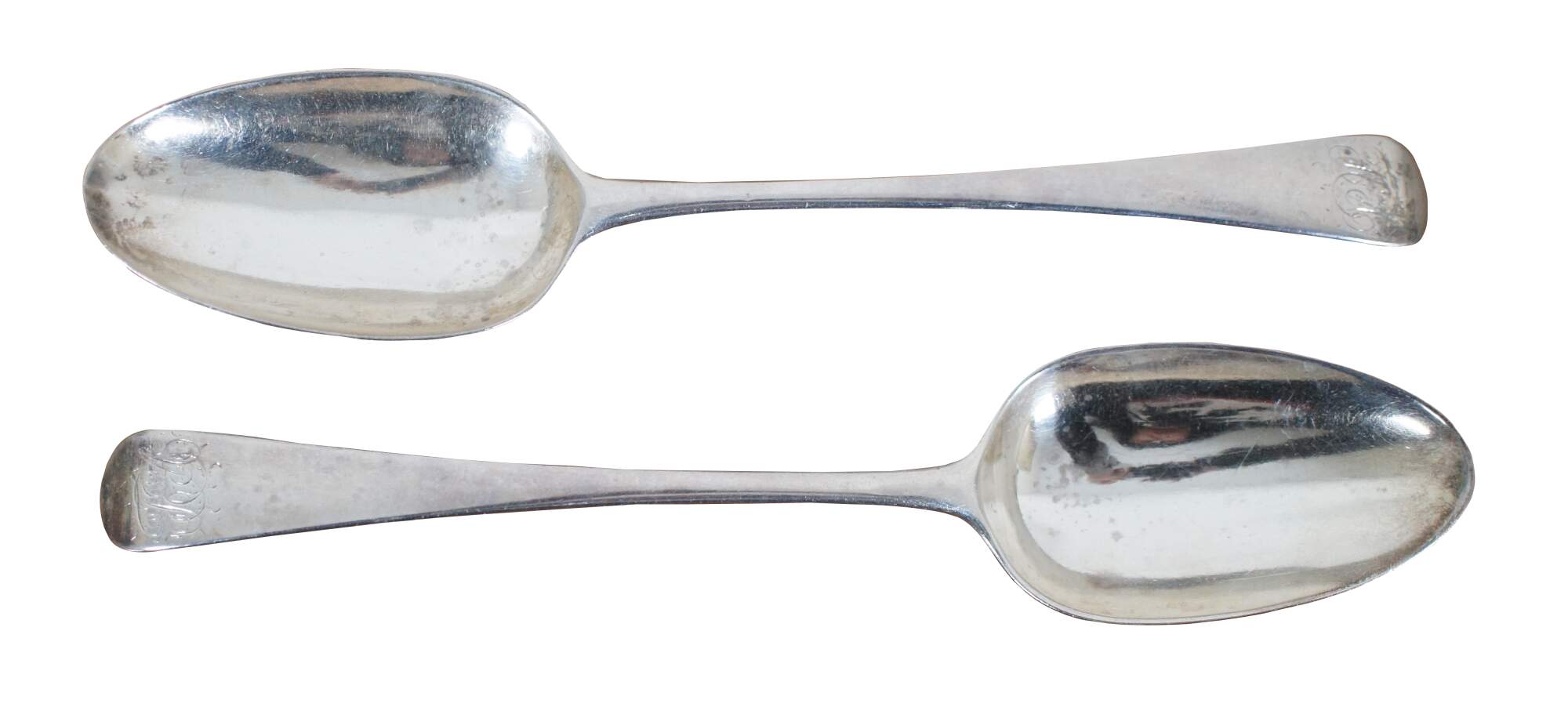 Pair of large heavy antique late 18th century Georgian sterling silver serving spoons with tipped handles, monogrammed with the initials TA. Made in 1780 by George Smith III of London England.