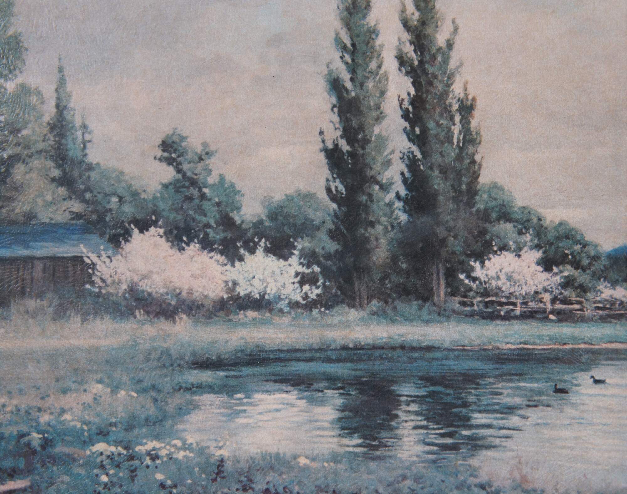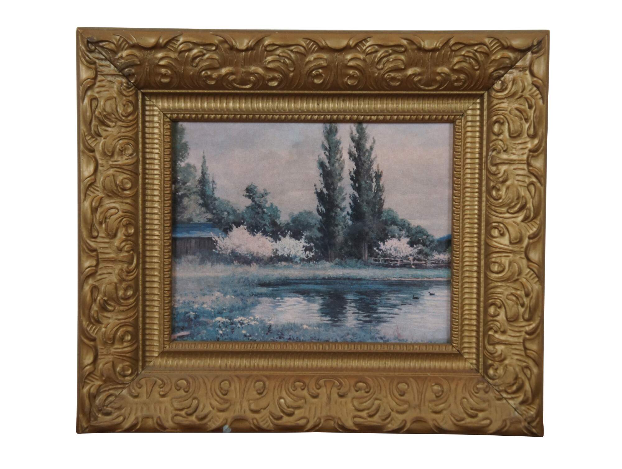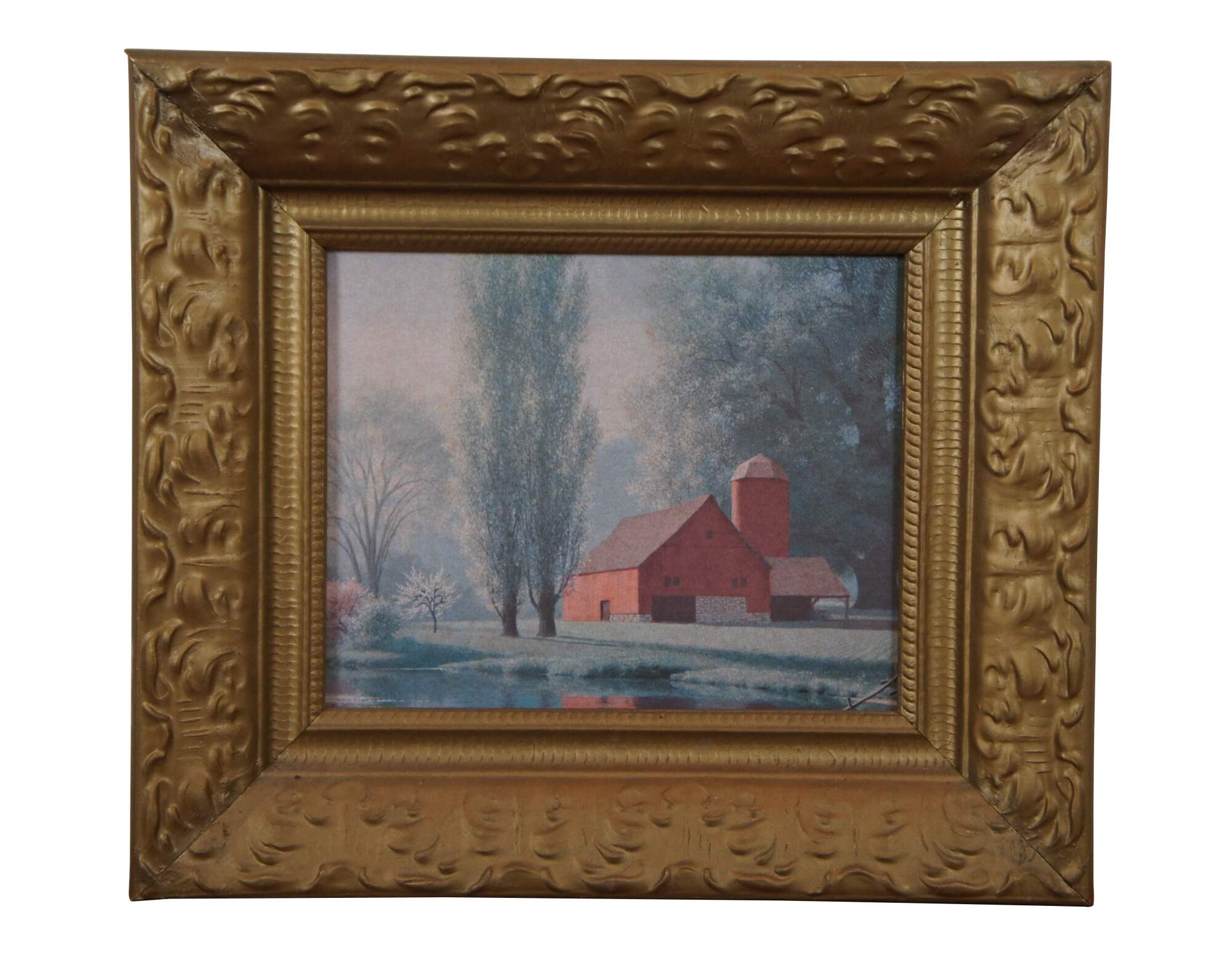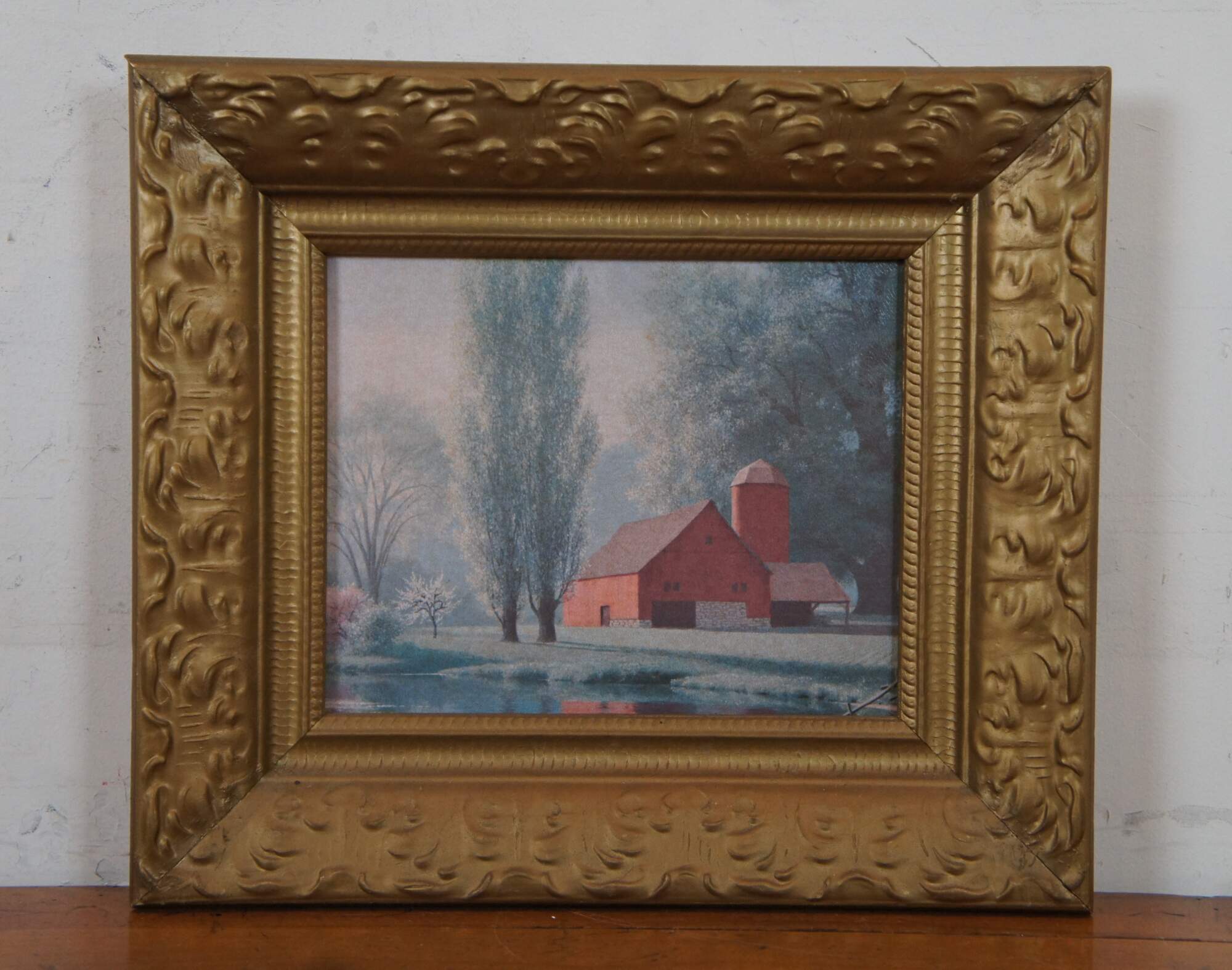 Pair of mid 20th century framed prints on board, enhanced with a textured varnish to mimic brush strokes. Barn landscape - Paul Detlefsen’s “Spring Morn.” Lake and pines landscape - Robert Wood’s “Spring Eternal.” Includes ornate antique gold painted frames.