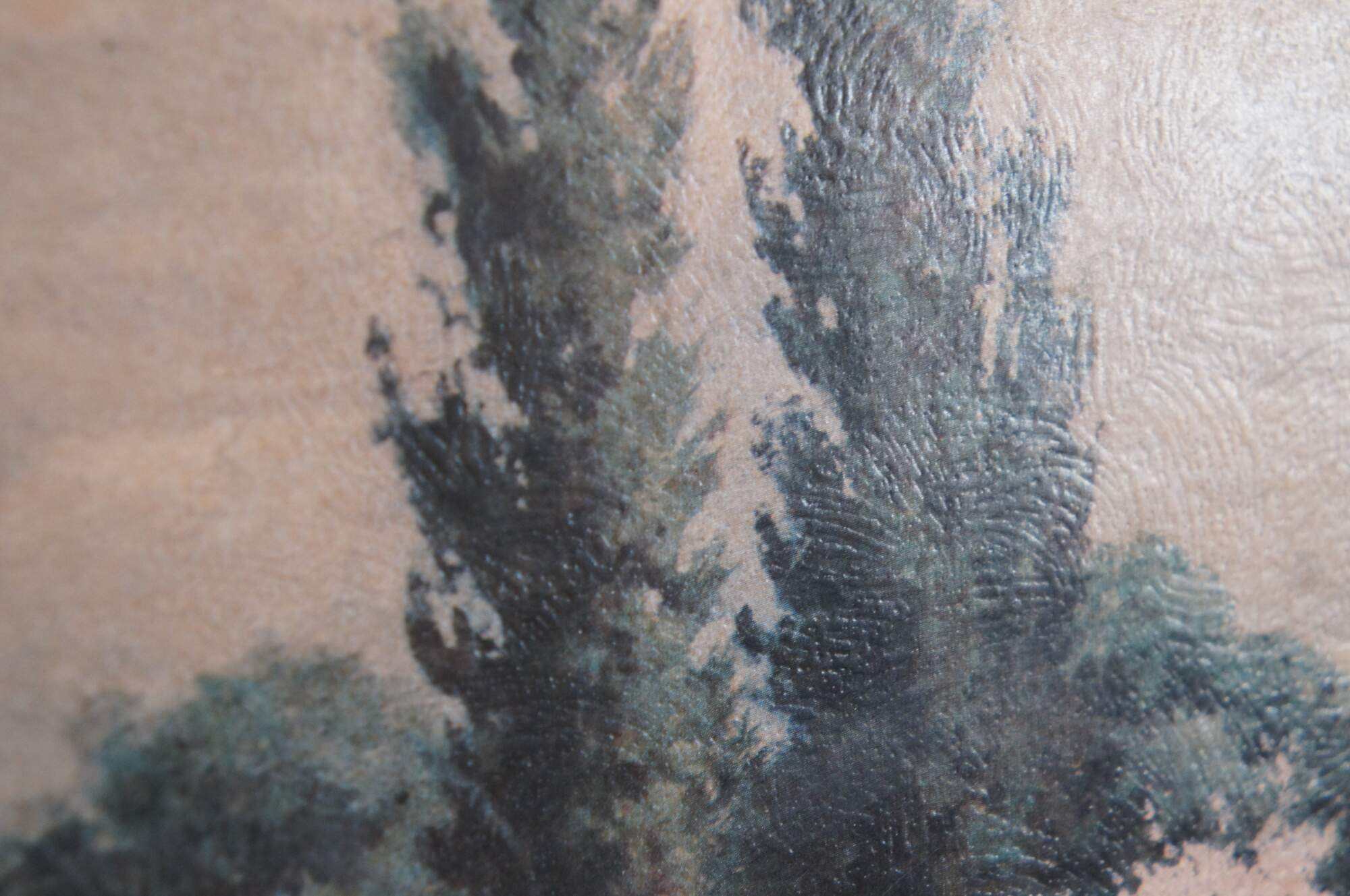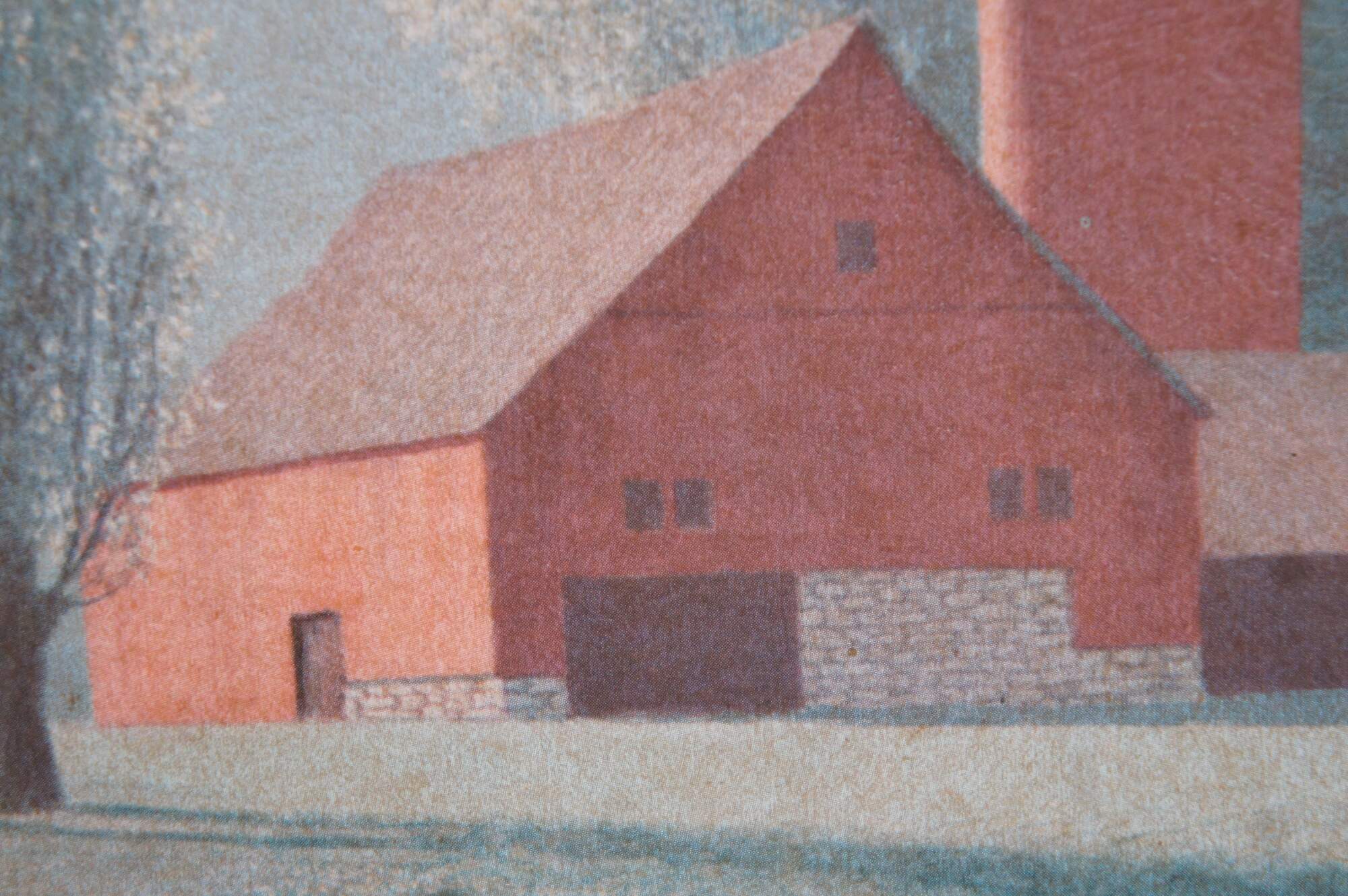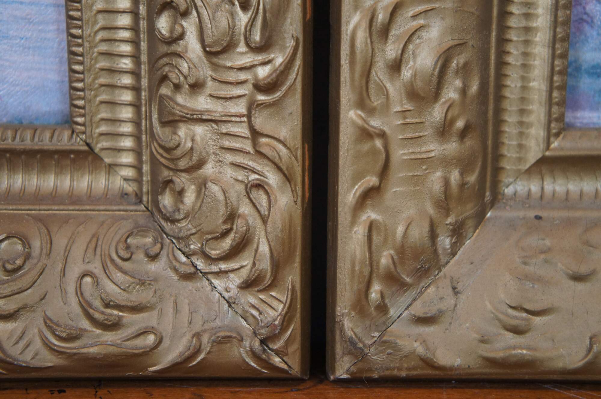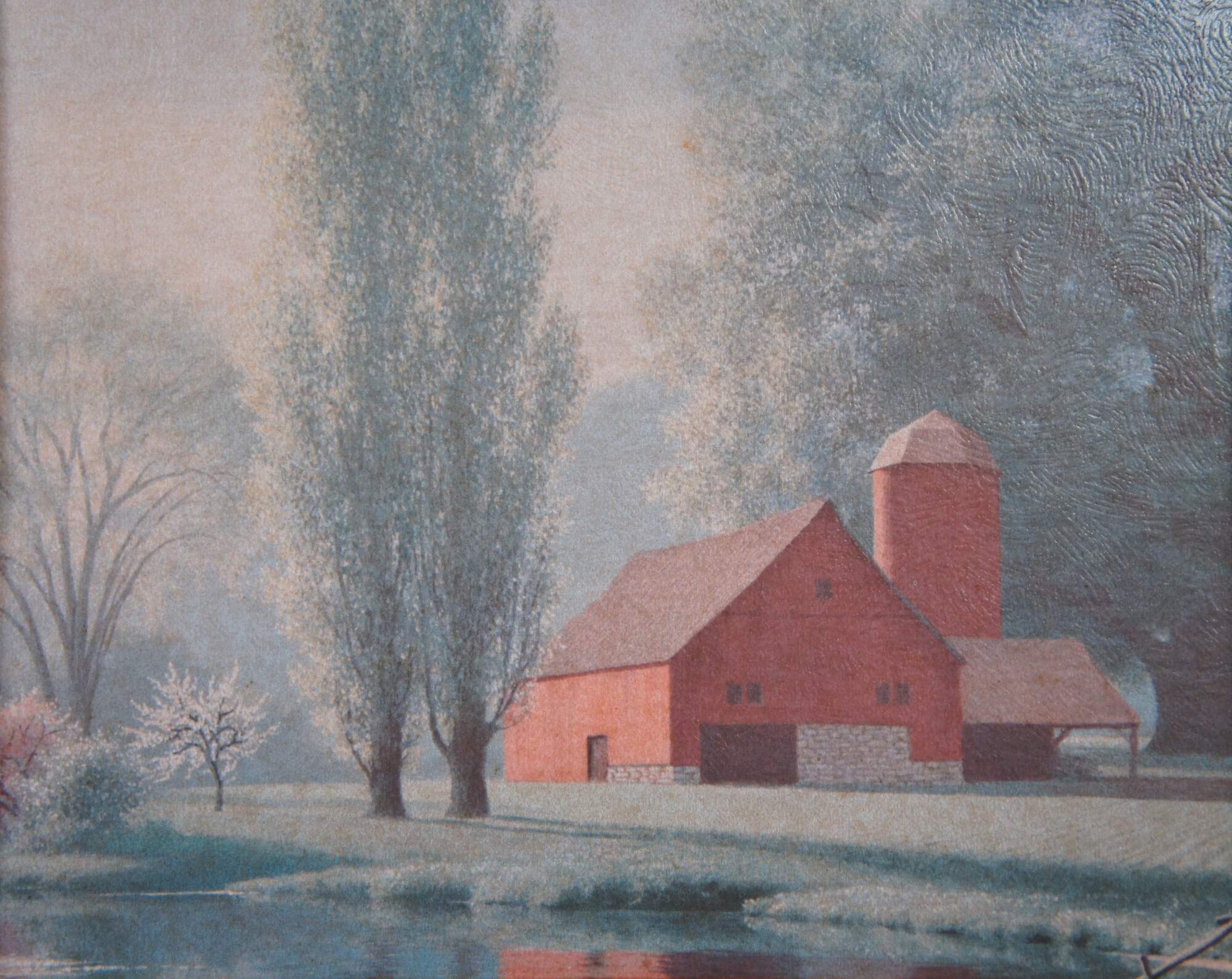 Pair of mid 20th century framed prints on board, enhanced with a textured varnish to mimic brush strokes. Barn landscape - Paul Detlefsen’s “Spring Morn.” Lake and pines landscape - Robert Wood’s “Spring Eternal.” Includes ornate antique gold painted frames.