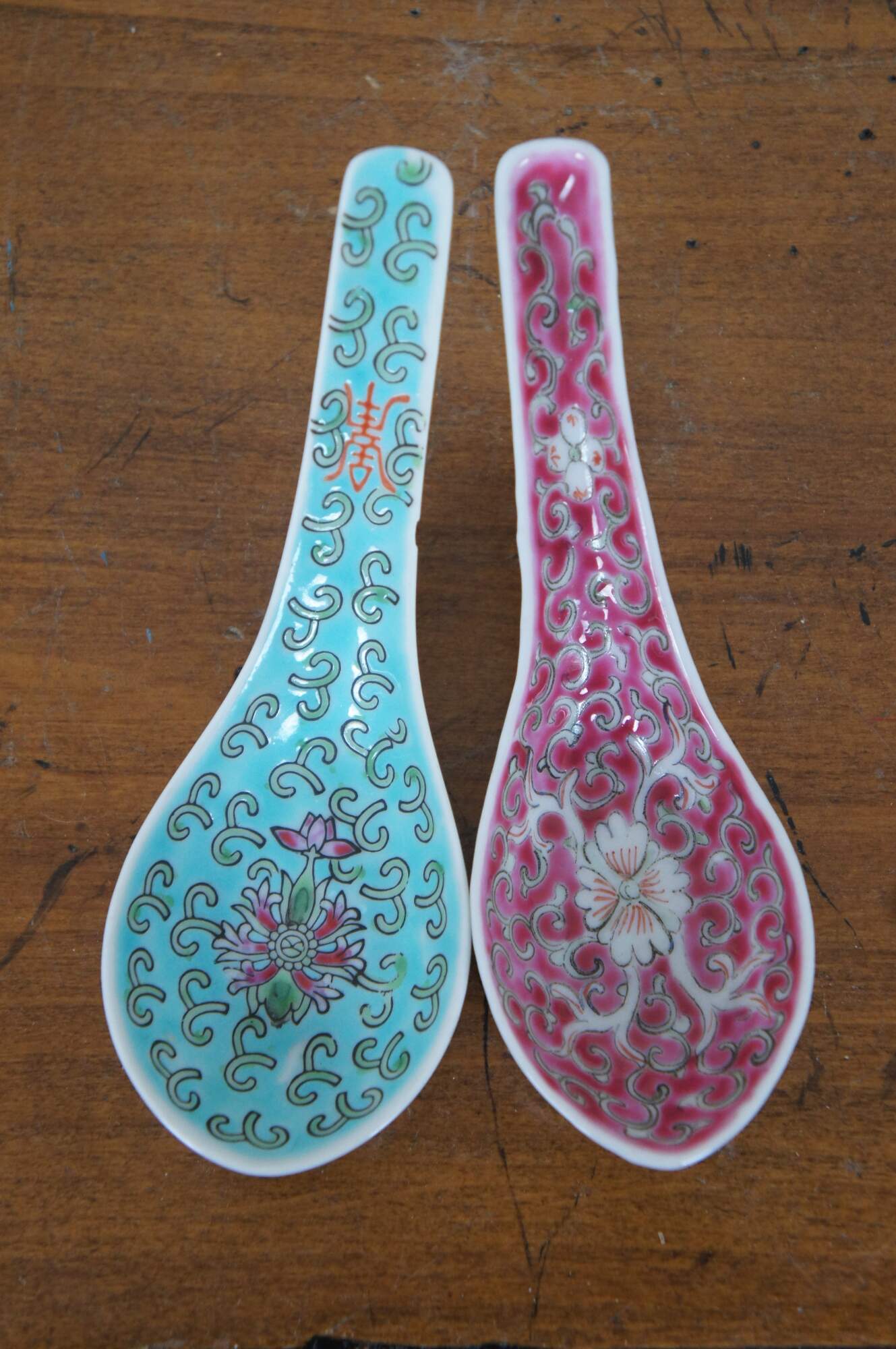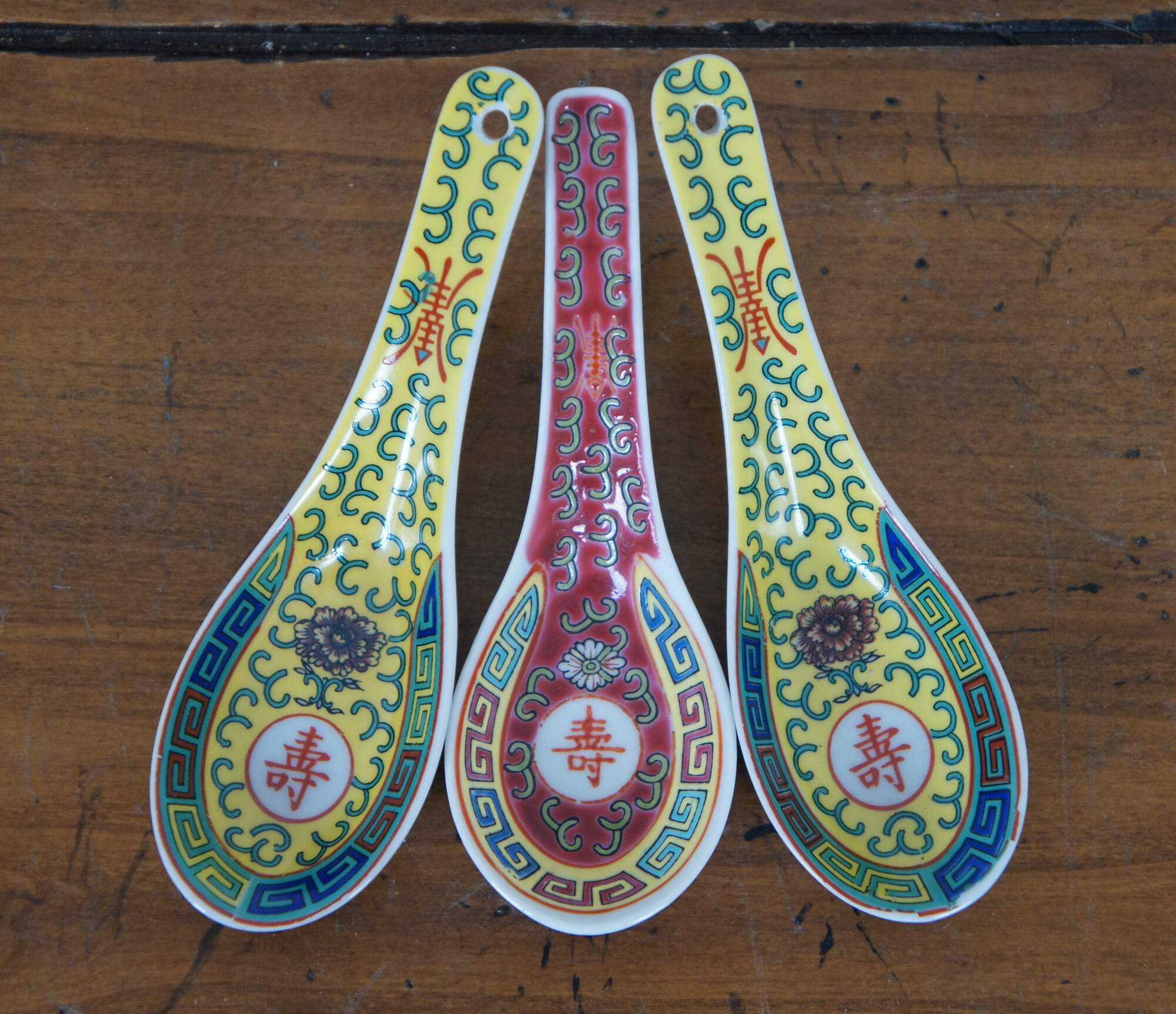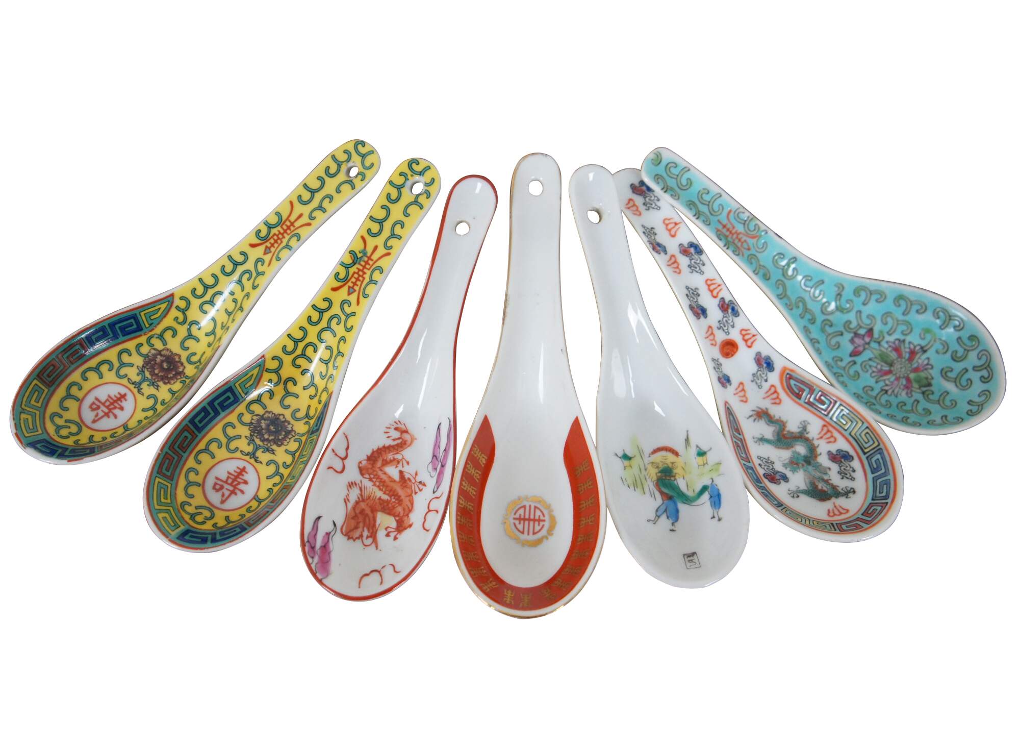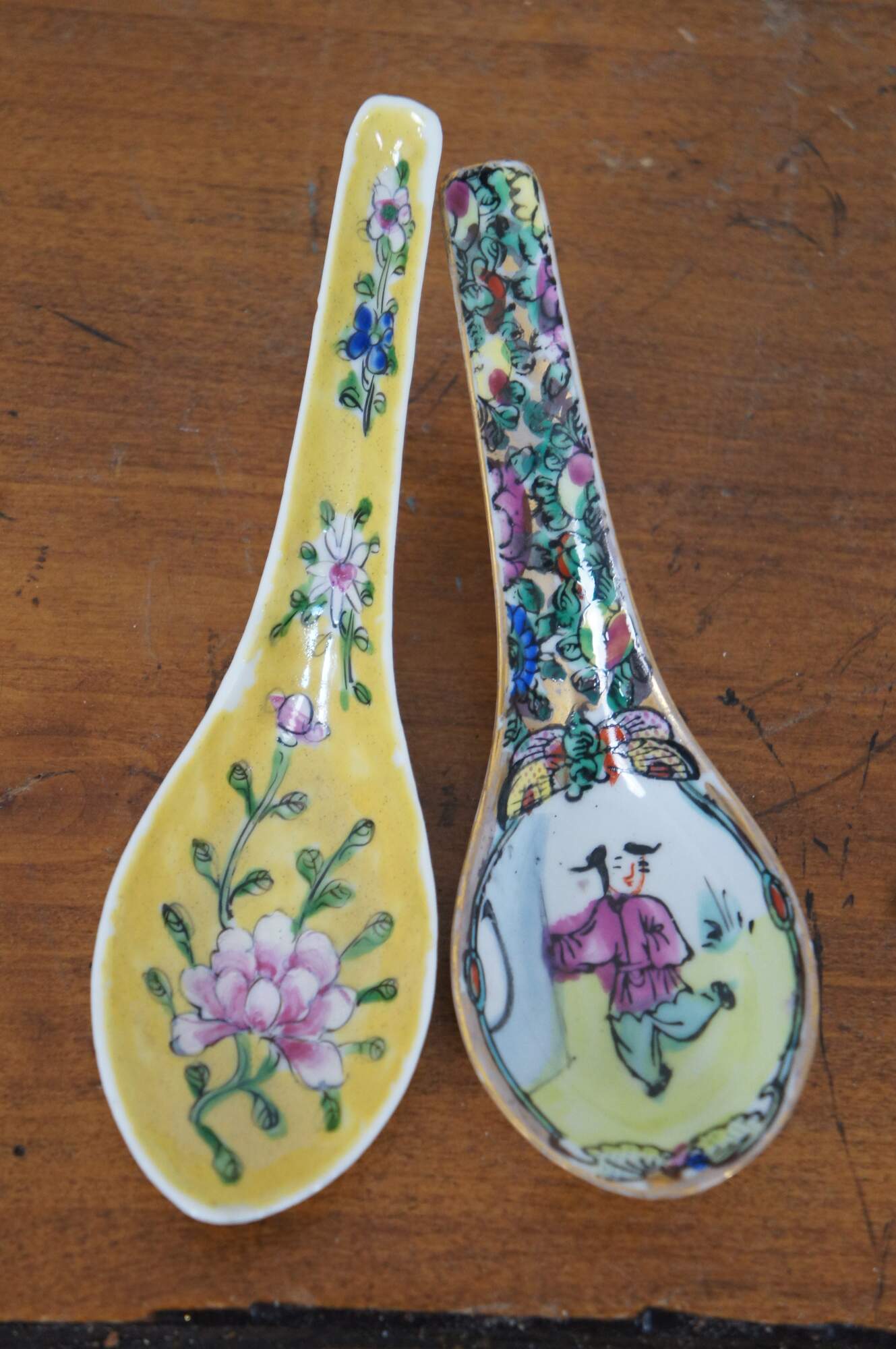 Lot of fifteen assorted Chinese and Japanese porcelain soup spoons in a wide variety of patterns and colors.
