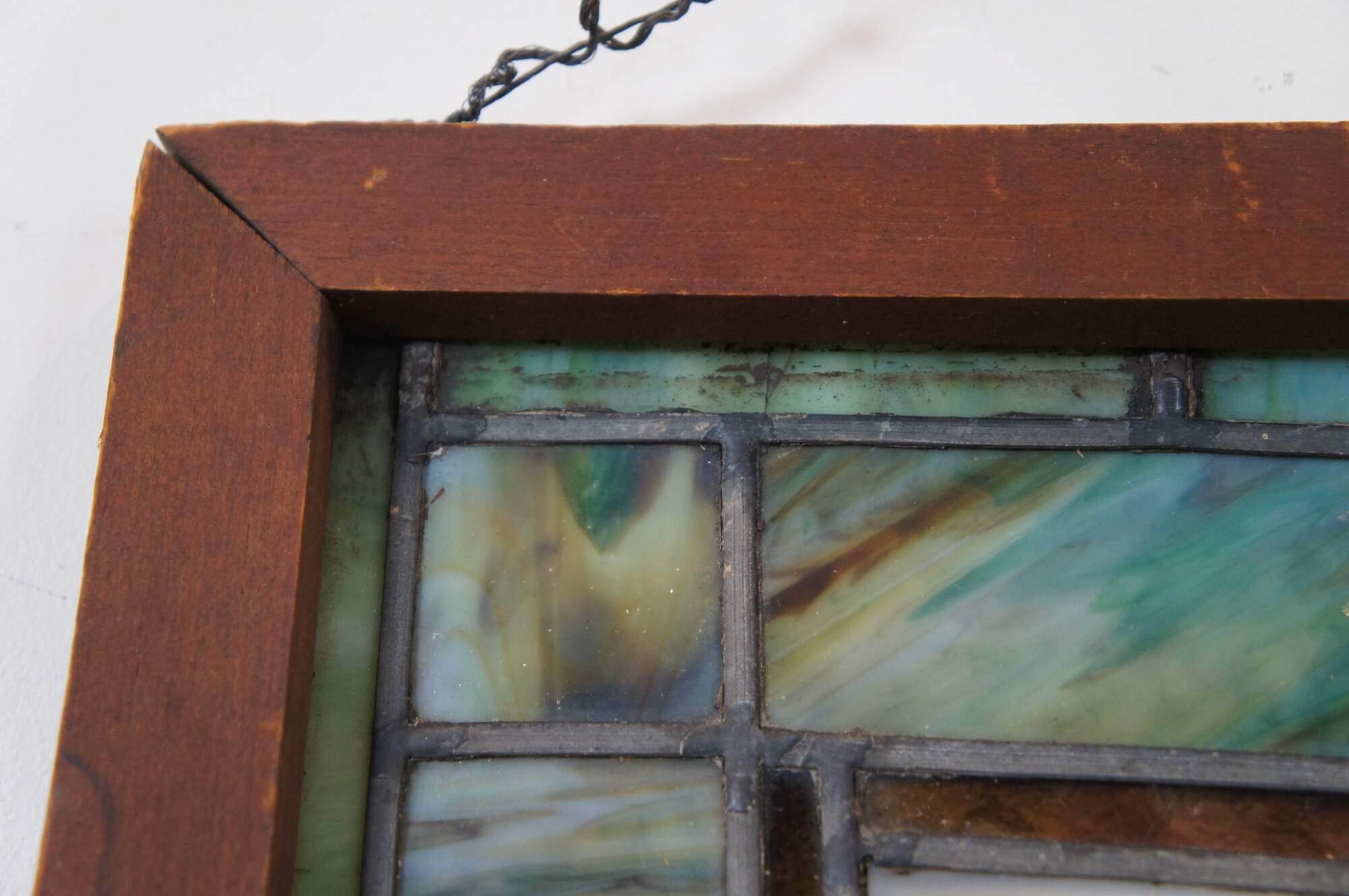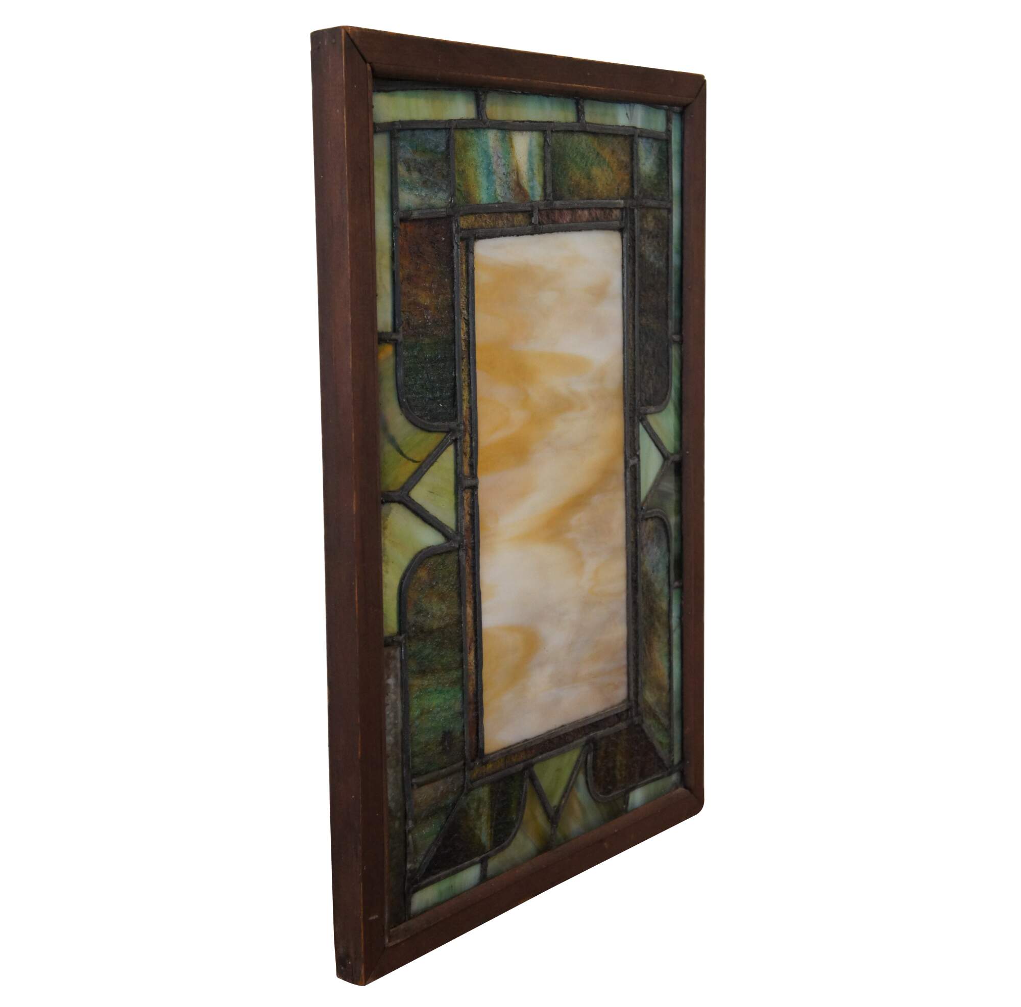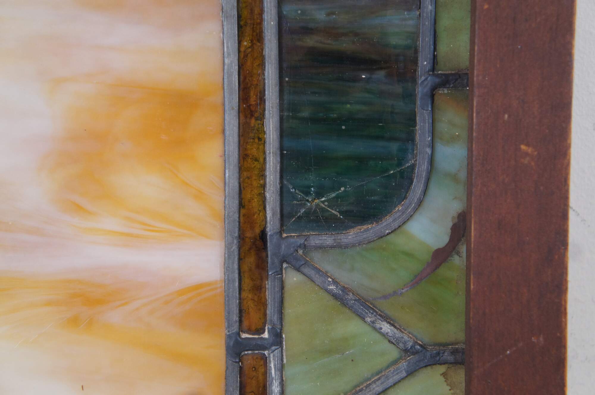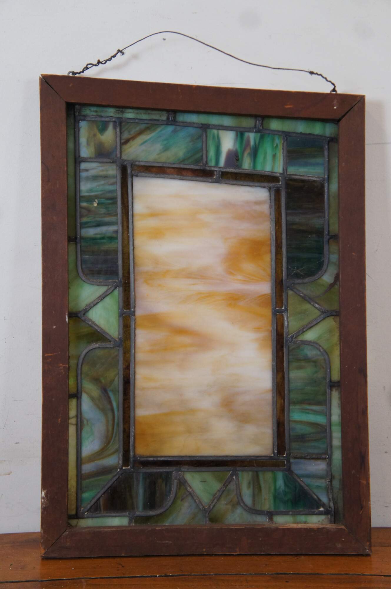 Antique reclaimed leaded stained glass / slag glass window, featuring shades of olive and green around an amber and cream colored center.