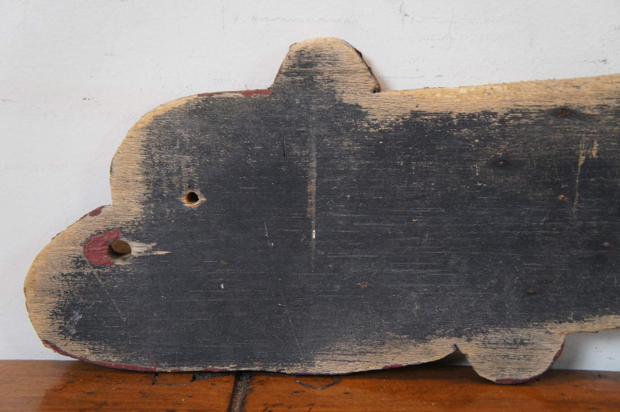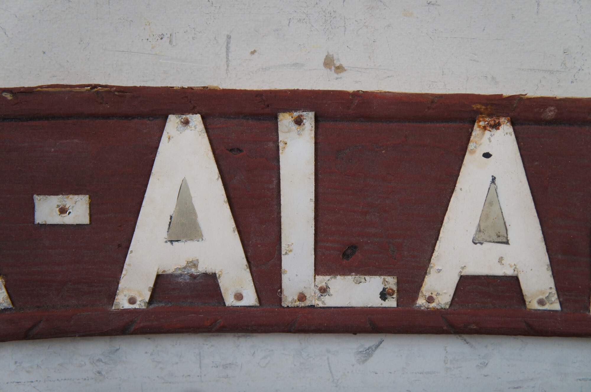 Vintage folk art carved wood advertising sign with white metal lettering for Villa-Atlantis, featuring a slightly curved form tipped with the heads of dragons, sea serpents or eagles / gryphons.