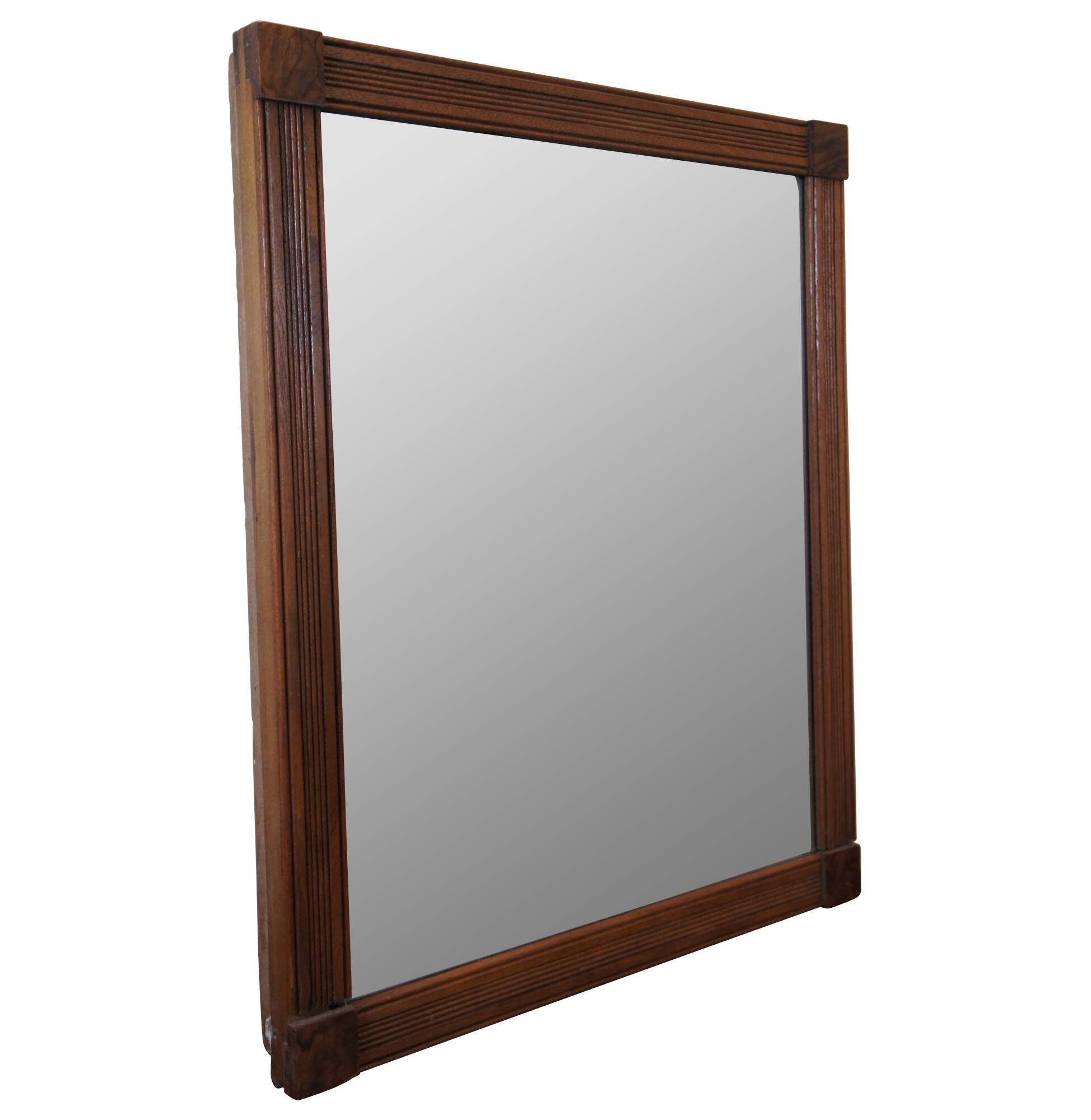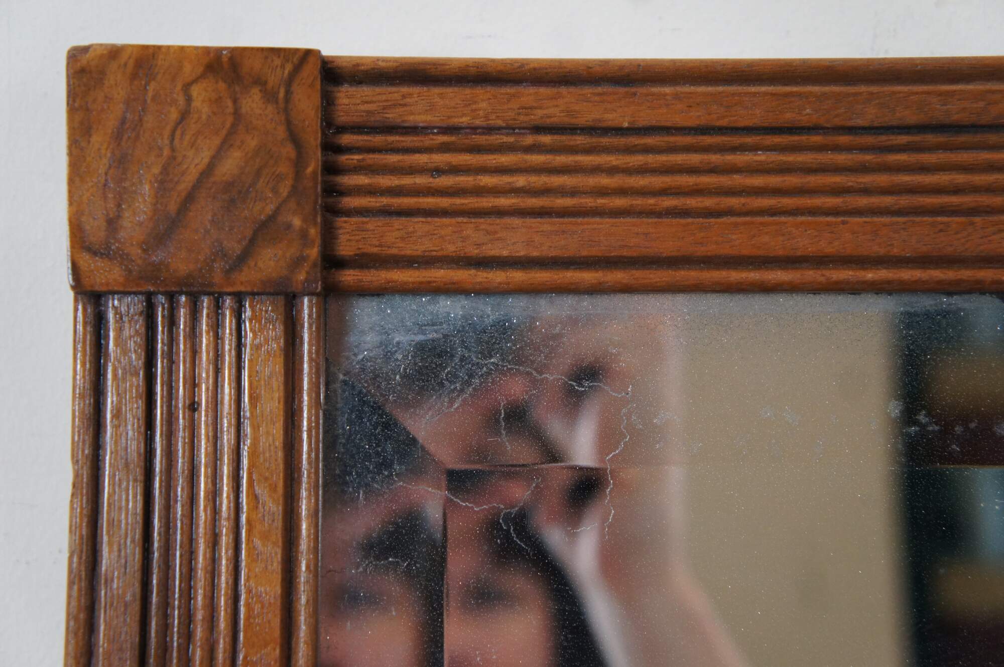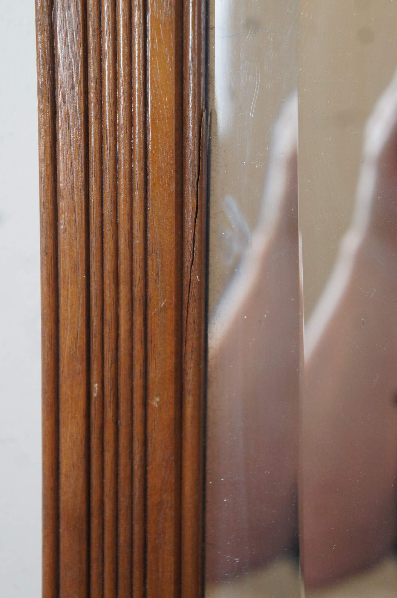 Antique heavy oak frame mirror featuring carved fluted or grooved design with beveled glass.