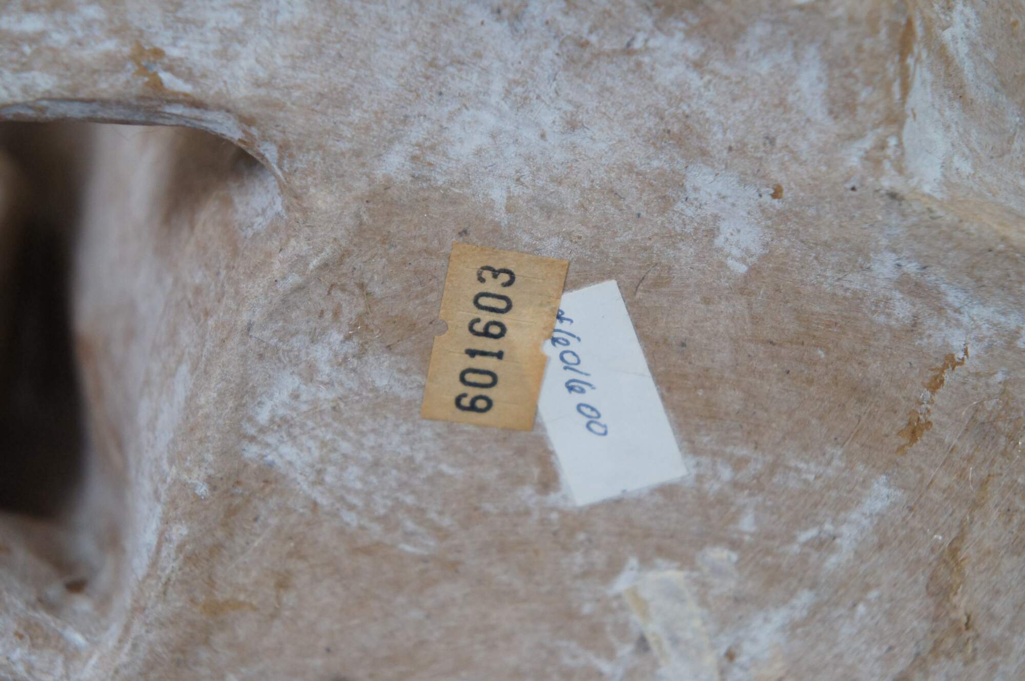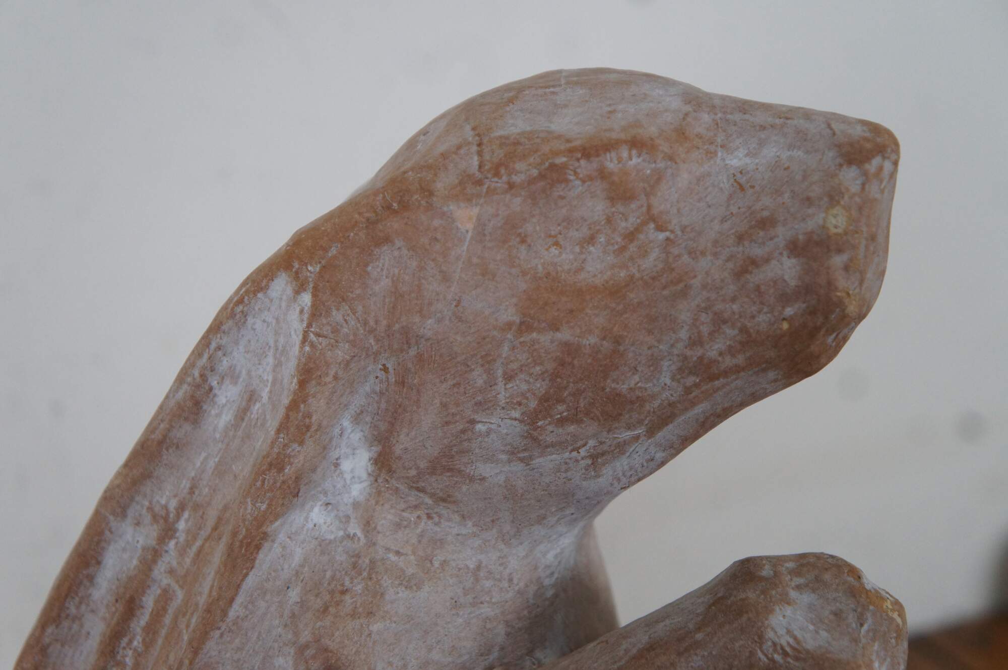 Pair of vintage paper mache rabbit sculptures, one laying and one standing, in light brown with brushed white distressing.
