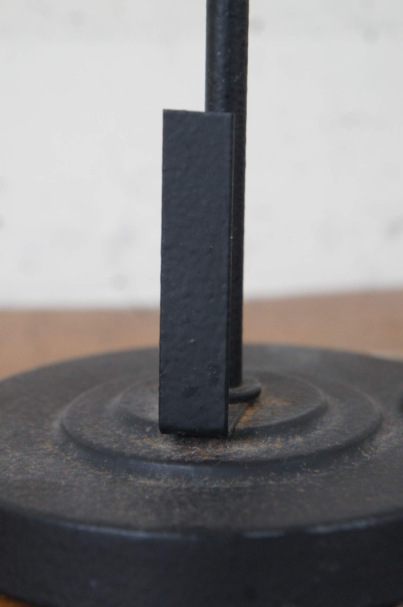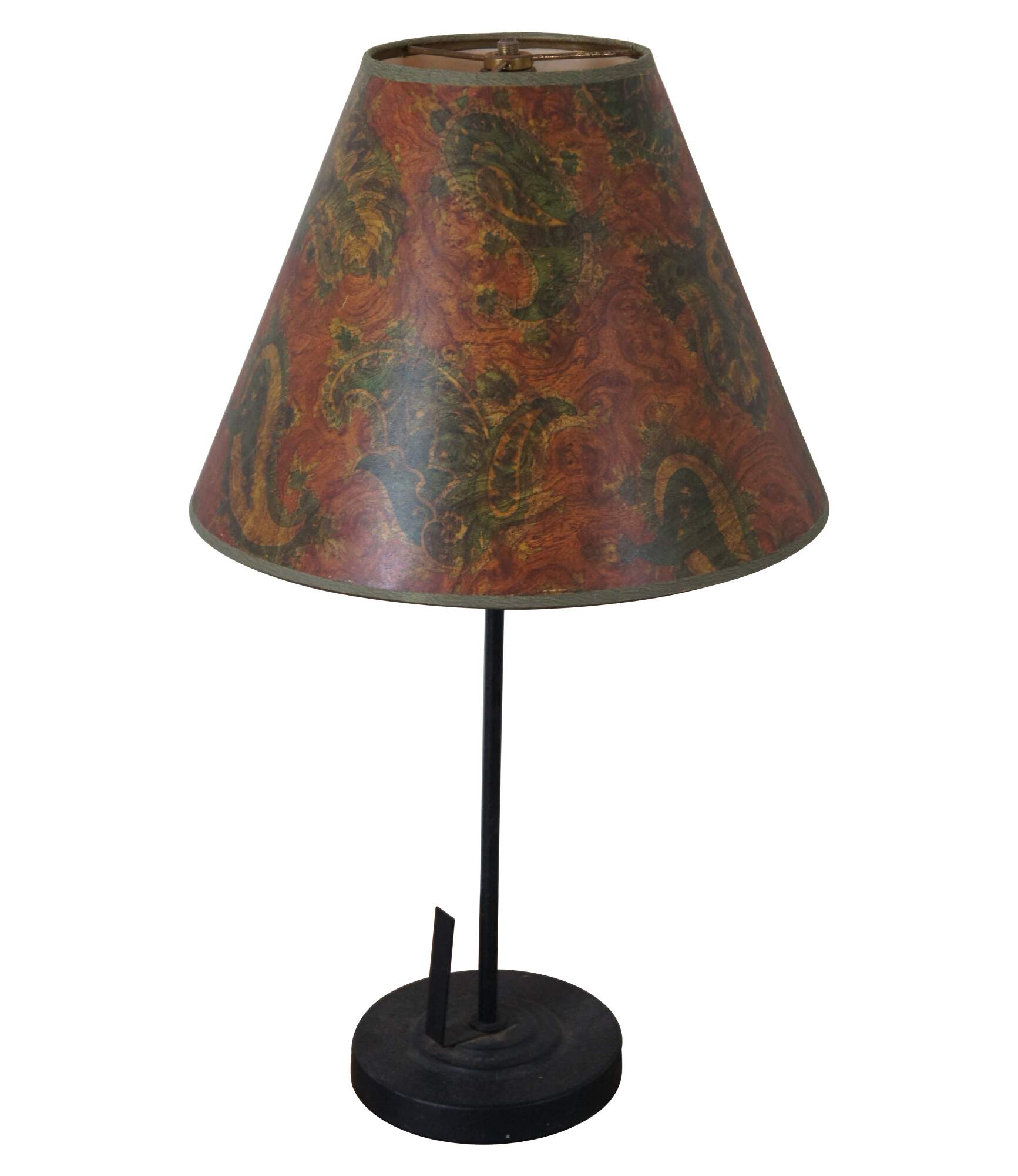 Slender black metal table lamp with circular base and protruding tab, paired with an orange and green paisley paper shade.