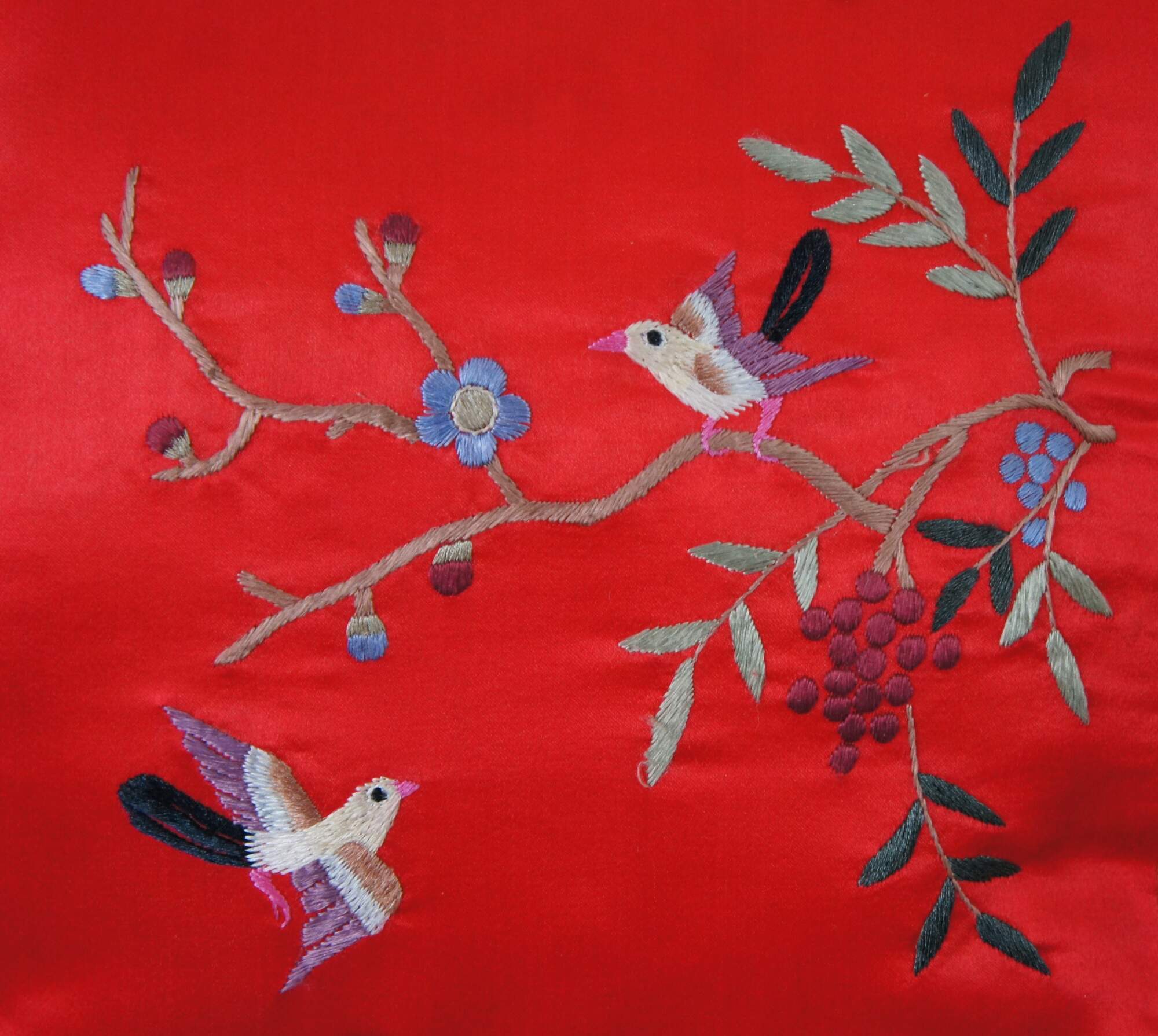 Set of three fiber filled throw pillows with red silk cases, embroidered with flowers, birds and butterflies, framed in beige brocade, crafted by the Dun Huang company of Beijing, China.