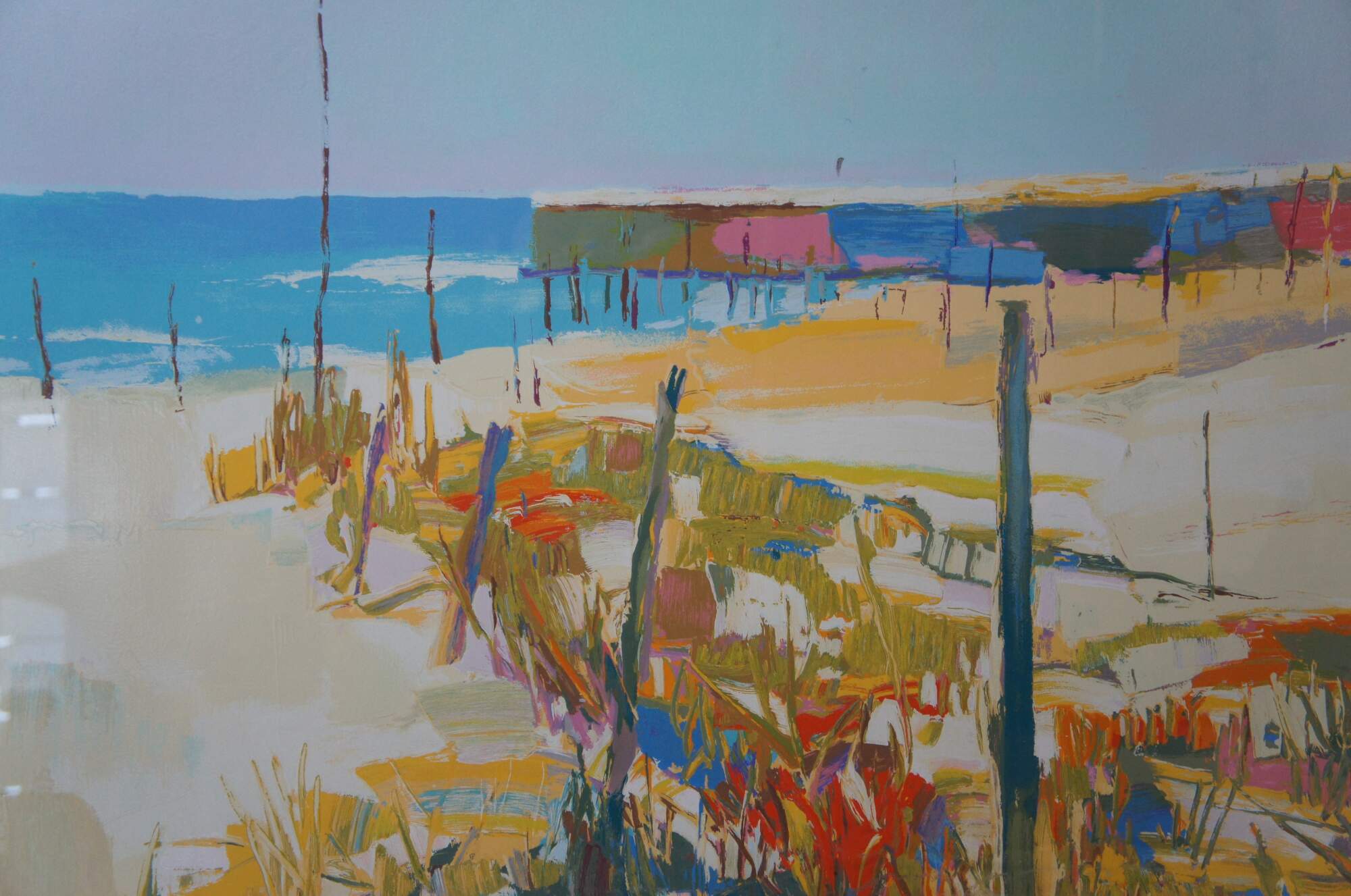 Vintage 1970s limited edition serigraph print by Nicola Simbari, showing a figure of a couple laying at the beach with boats and water in the background; pencil signed and numbered 126/300. “Nicola Simbari is a painter of semi-abstract impressionist works. He is a colorist who favors brilliant tones, richly layered with a palette knife. Simbari paints to convey light and energy and provide new definition through intensity of vision and technique.