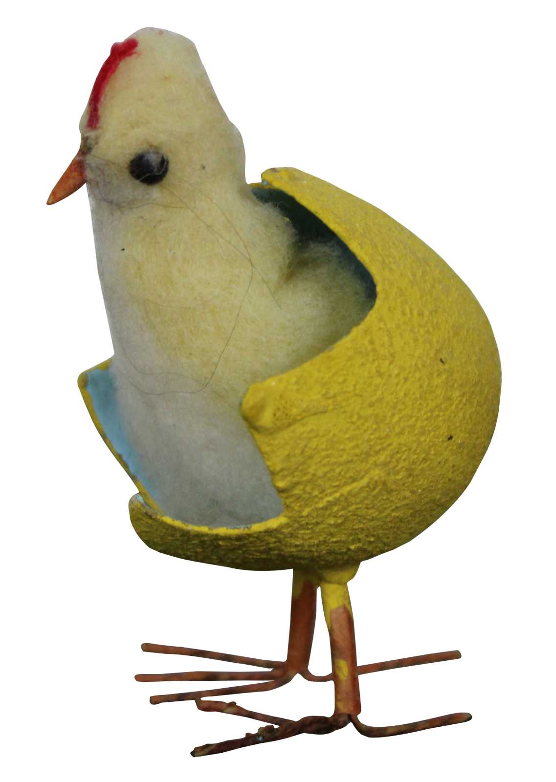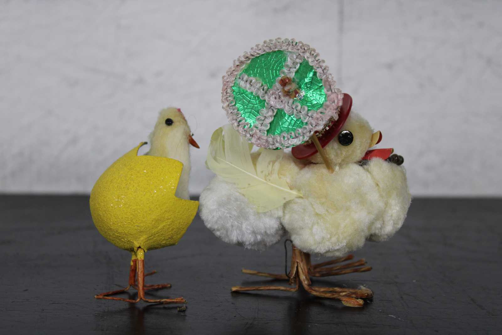 Pair of vintage chenille pompom chicks, one dressed in a red hat with an umbrella, one stuck in a yellow Easter egg.