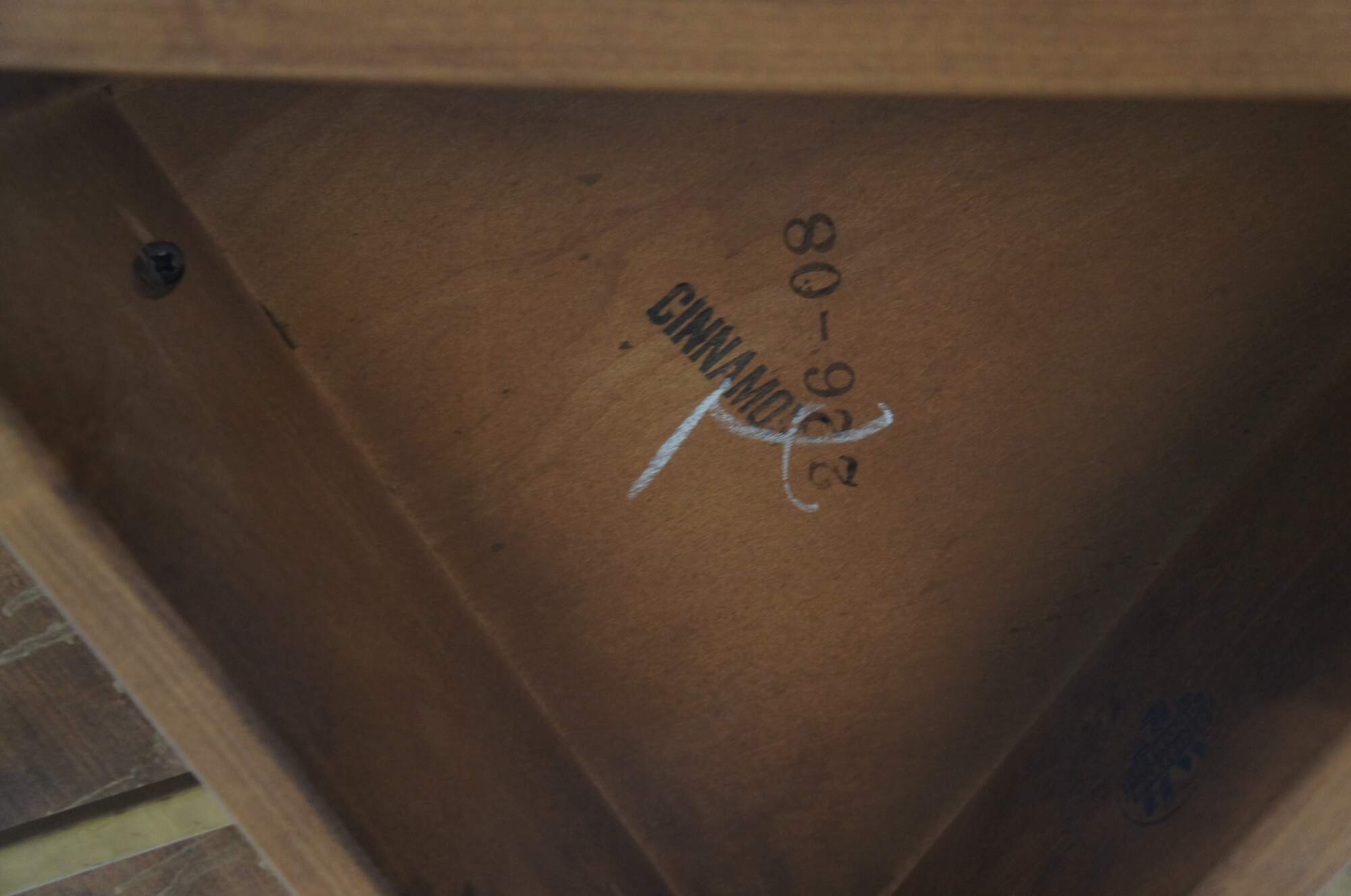 Heywood Wakefield cloverleaf side table 226-08, cinnamon finish. Made from maple with a triangular form over turned spindle legs and bun feet connected by stretchers.