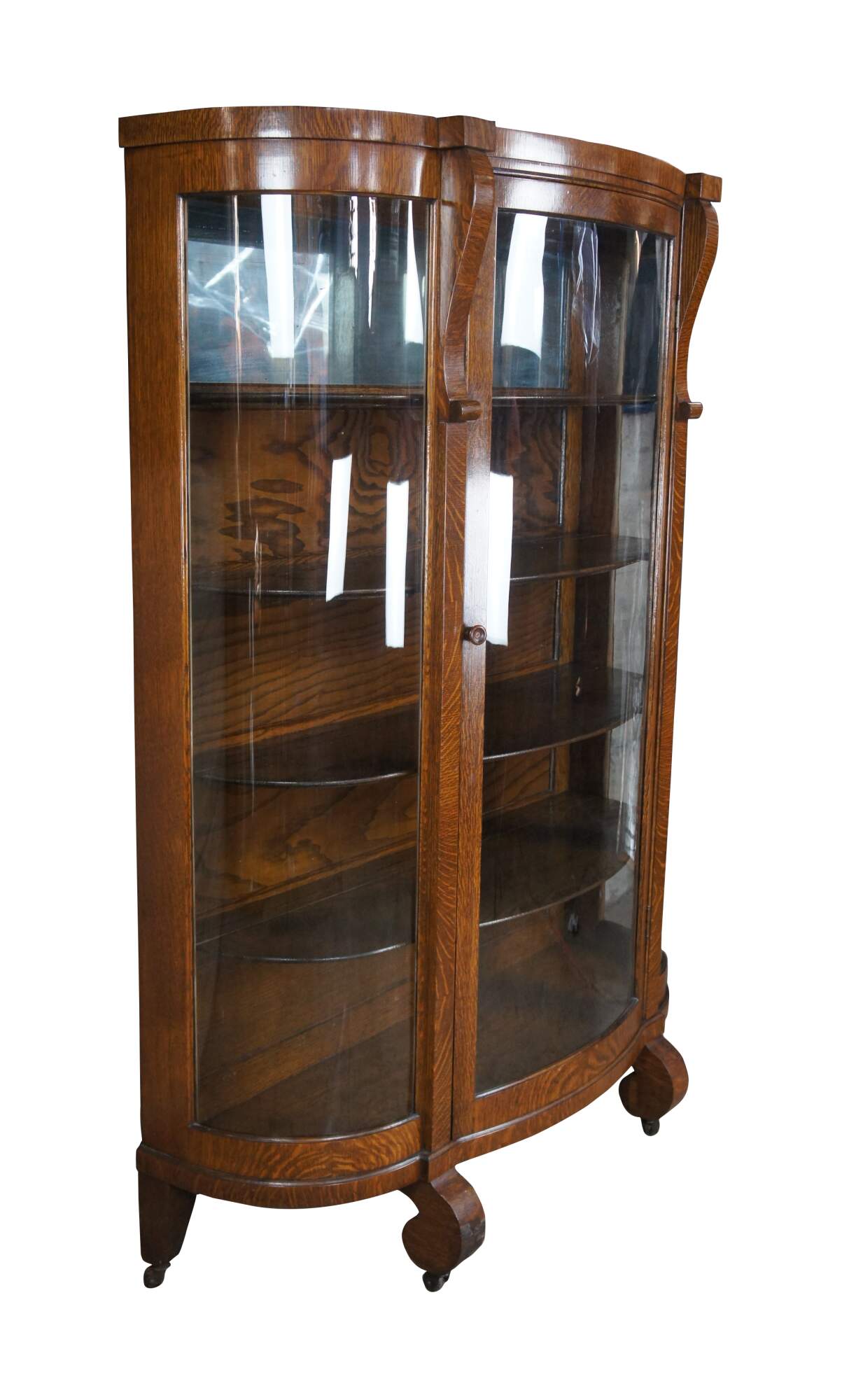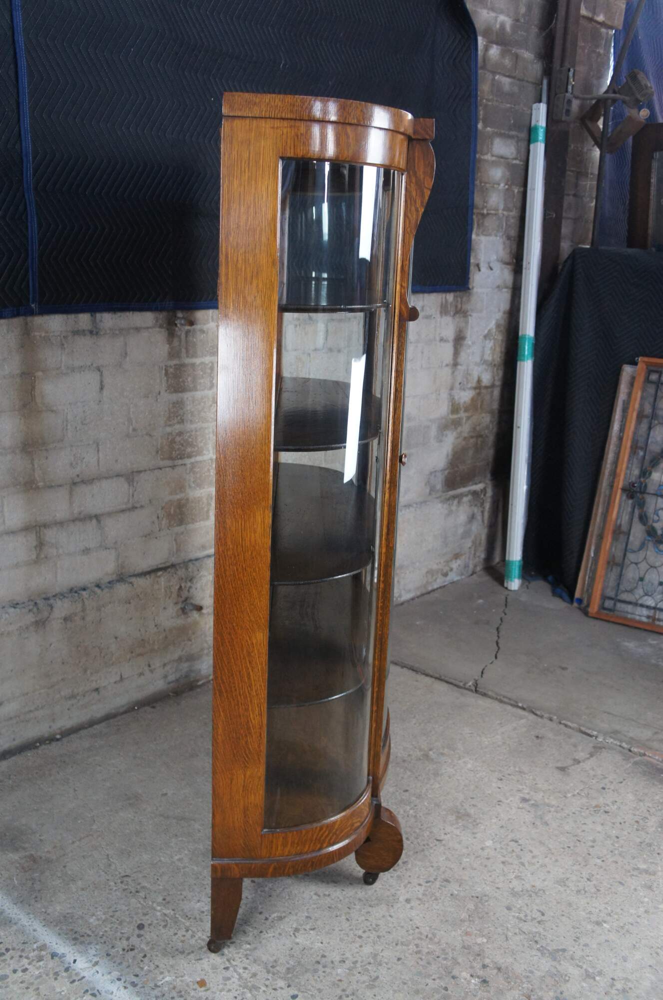 Antique Victorian Era American Empire demilune curved glass curio cabinet. Made from quartersawn oak with scrolled accents along the front leading to scrolled feet over casters.. Includes four shelves with plate groves and a mirror along the top.