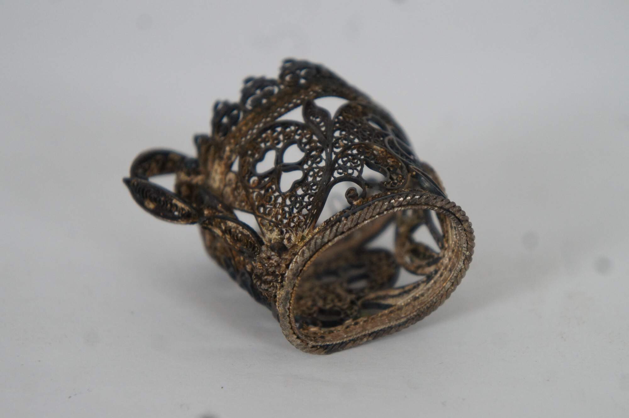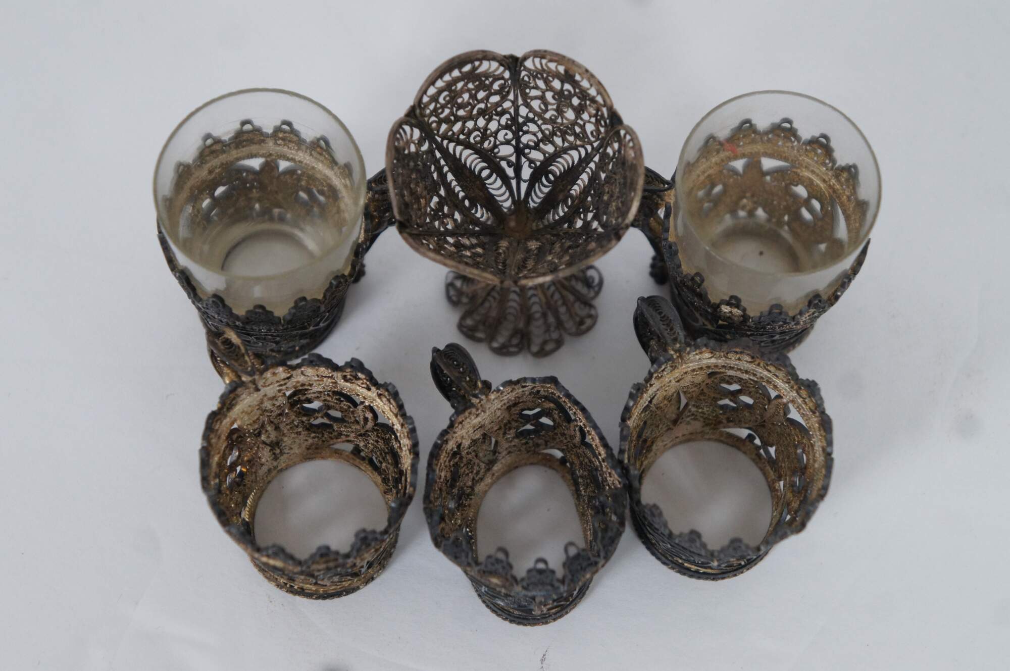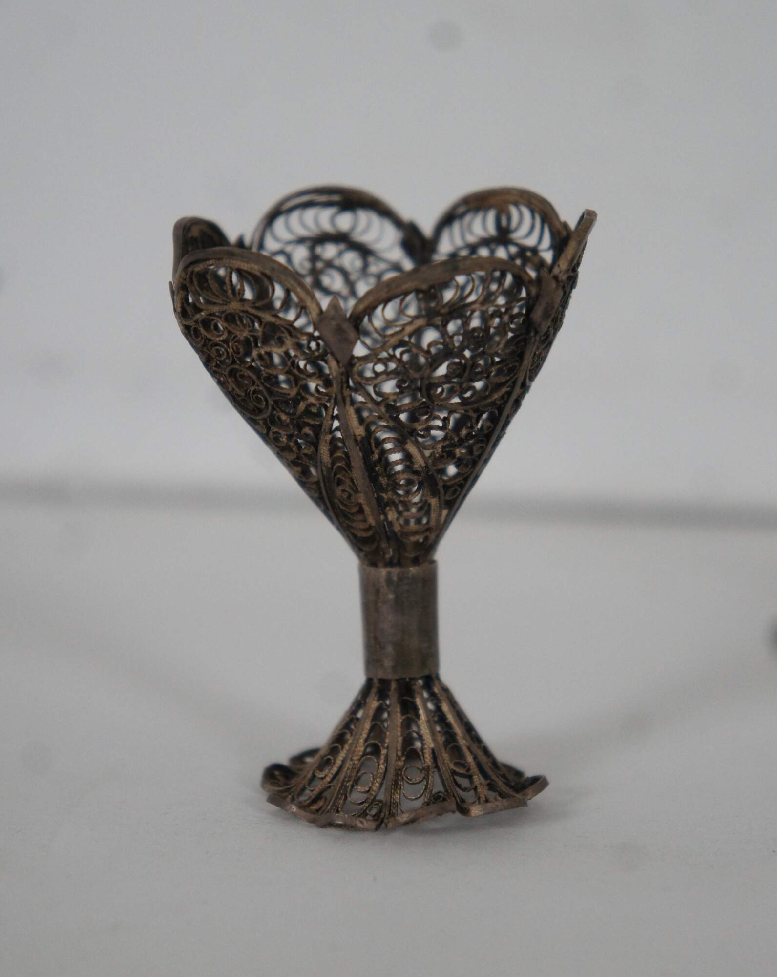 Lot of six antique metal filigree shot glass / cordial cup overlay sleeves, five mug shaped (includes two glass inserts) and one egg cup. All are intricately decorated with spirals, scallops, and three leaf clovers / shamrocks.