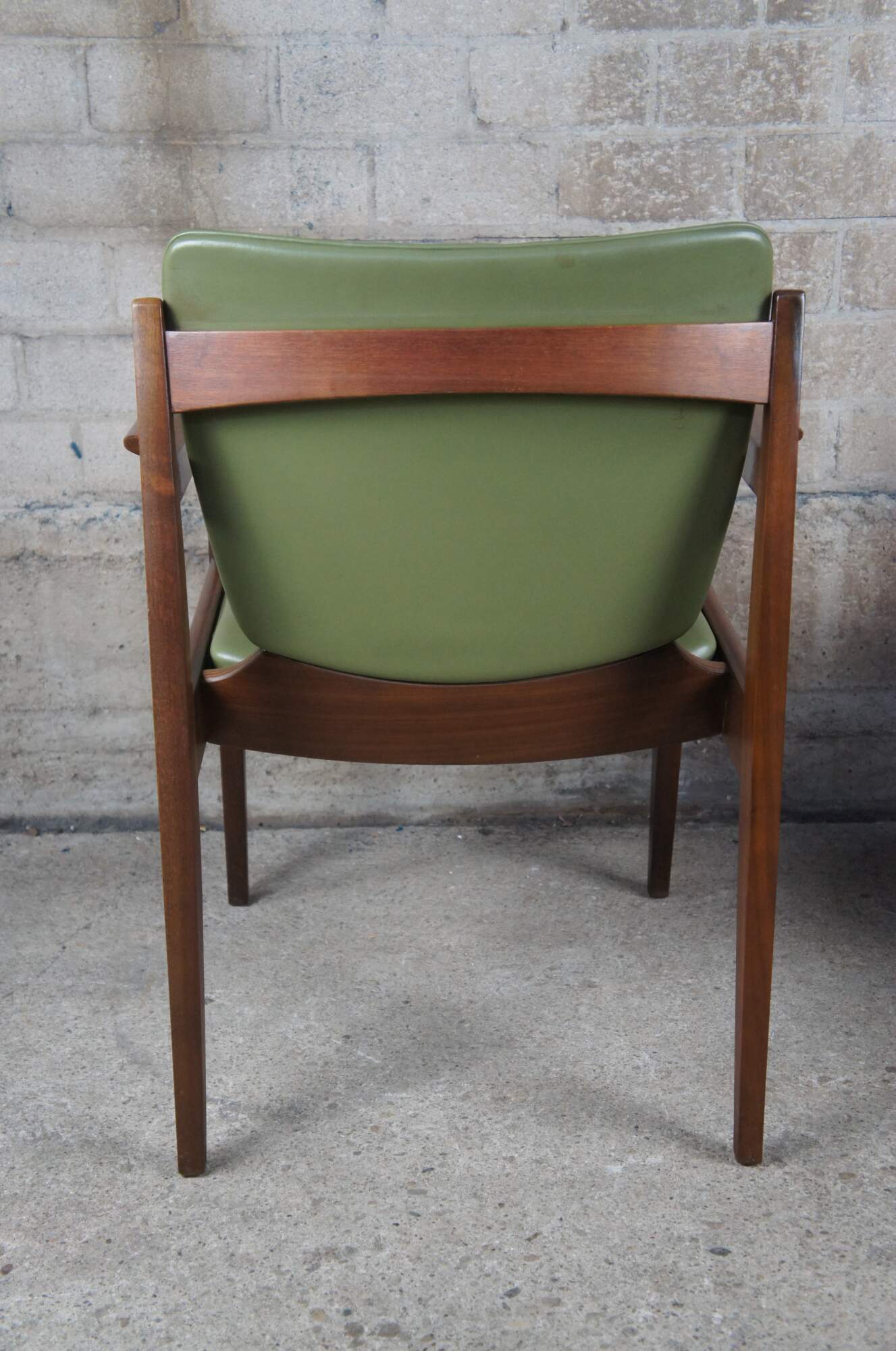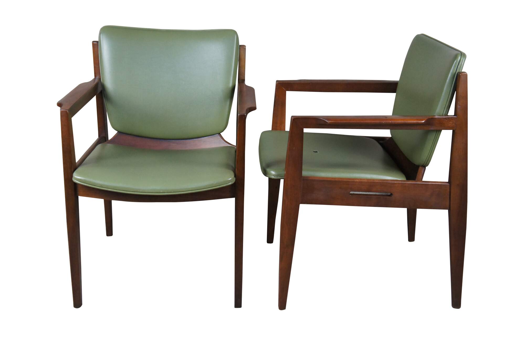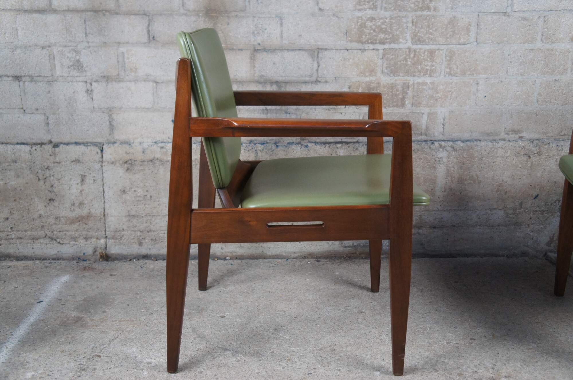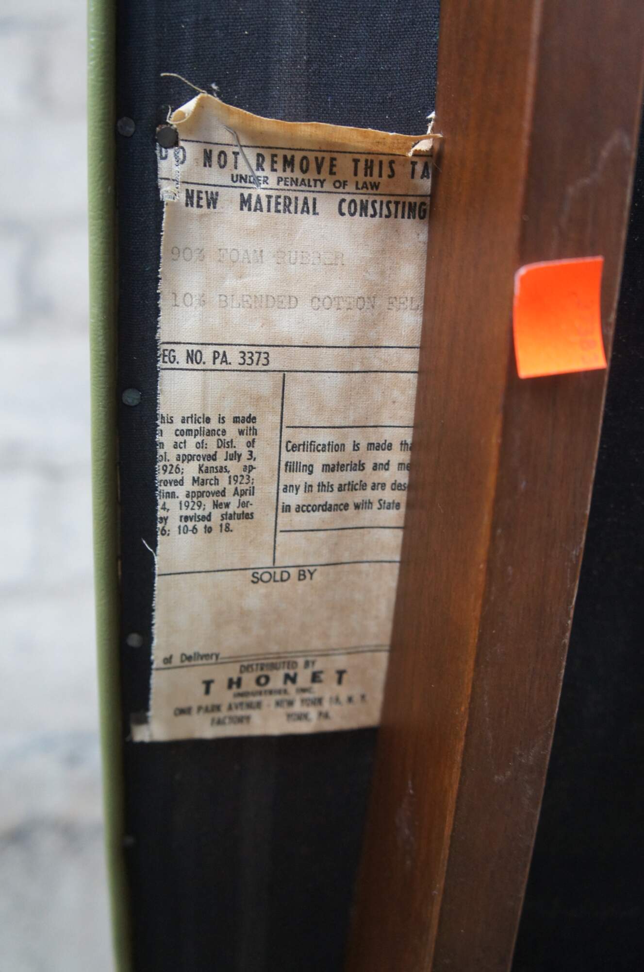 Pair of Thonet arm chairs, circa 1960s. Features Danish styling with streamline modern frames and original green vinyl fabric. Tag along underside