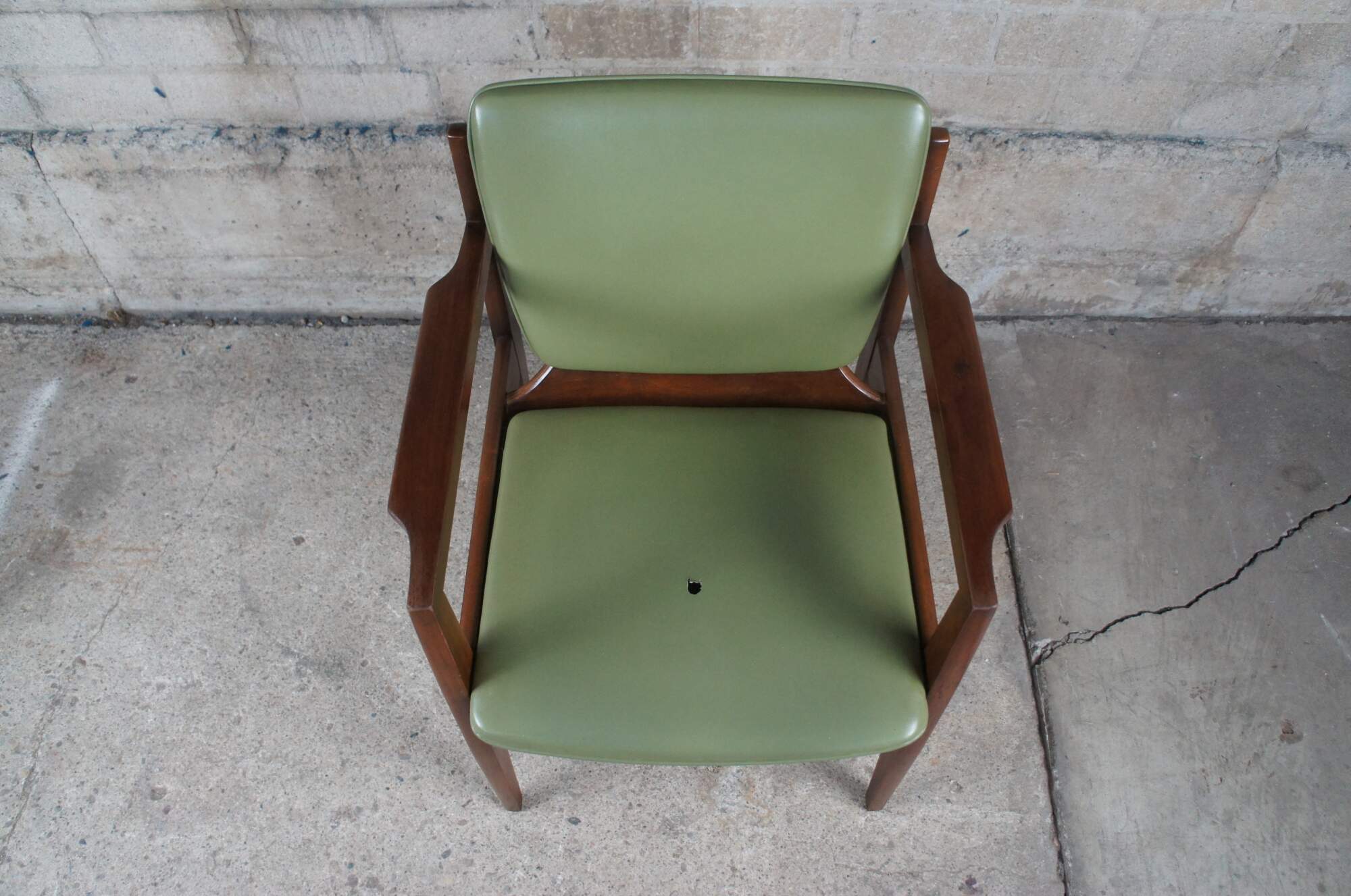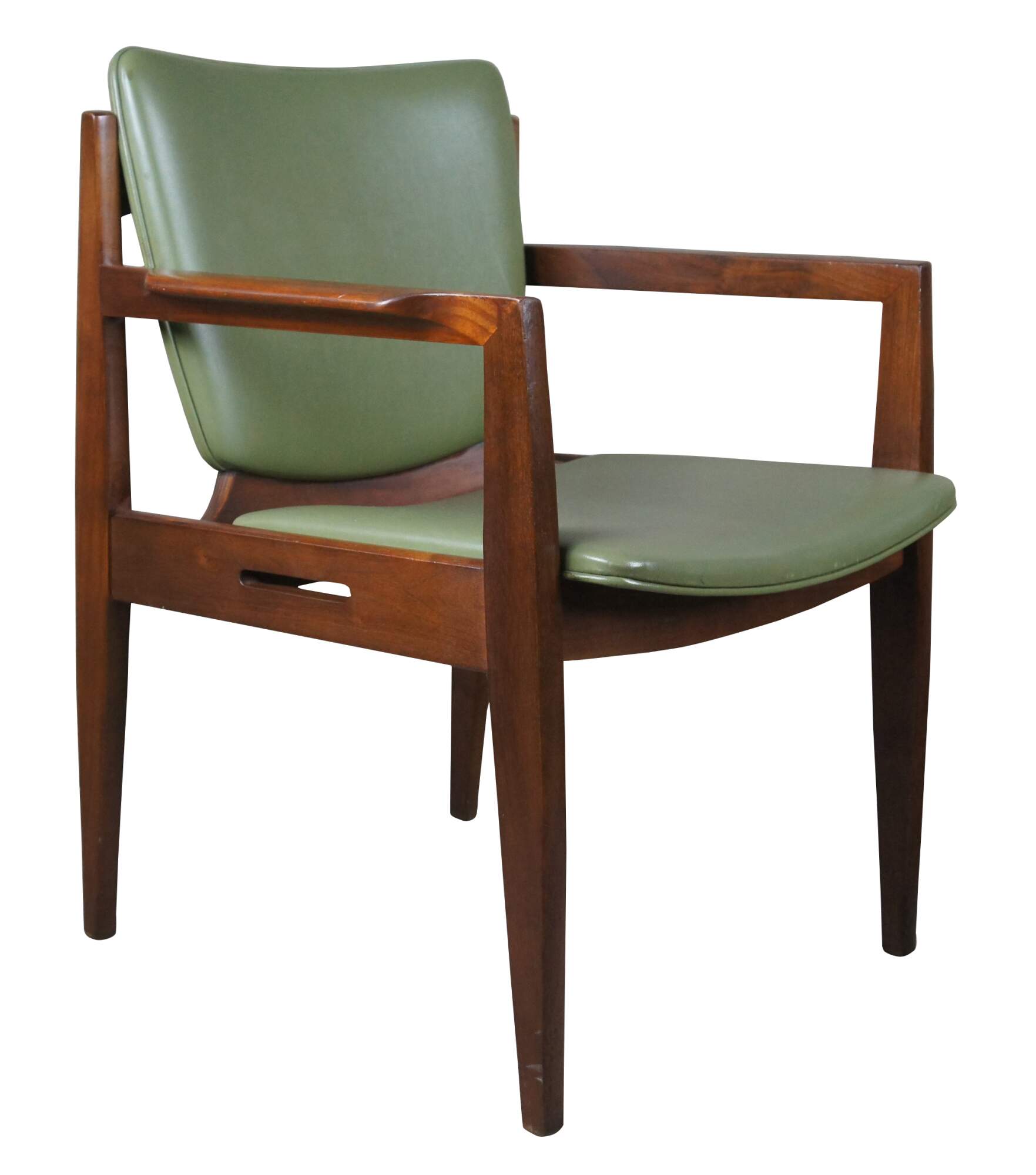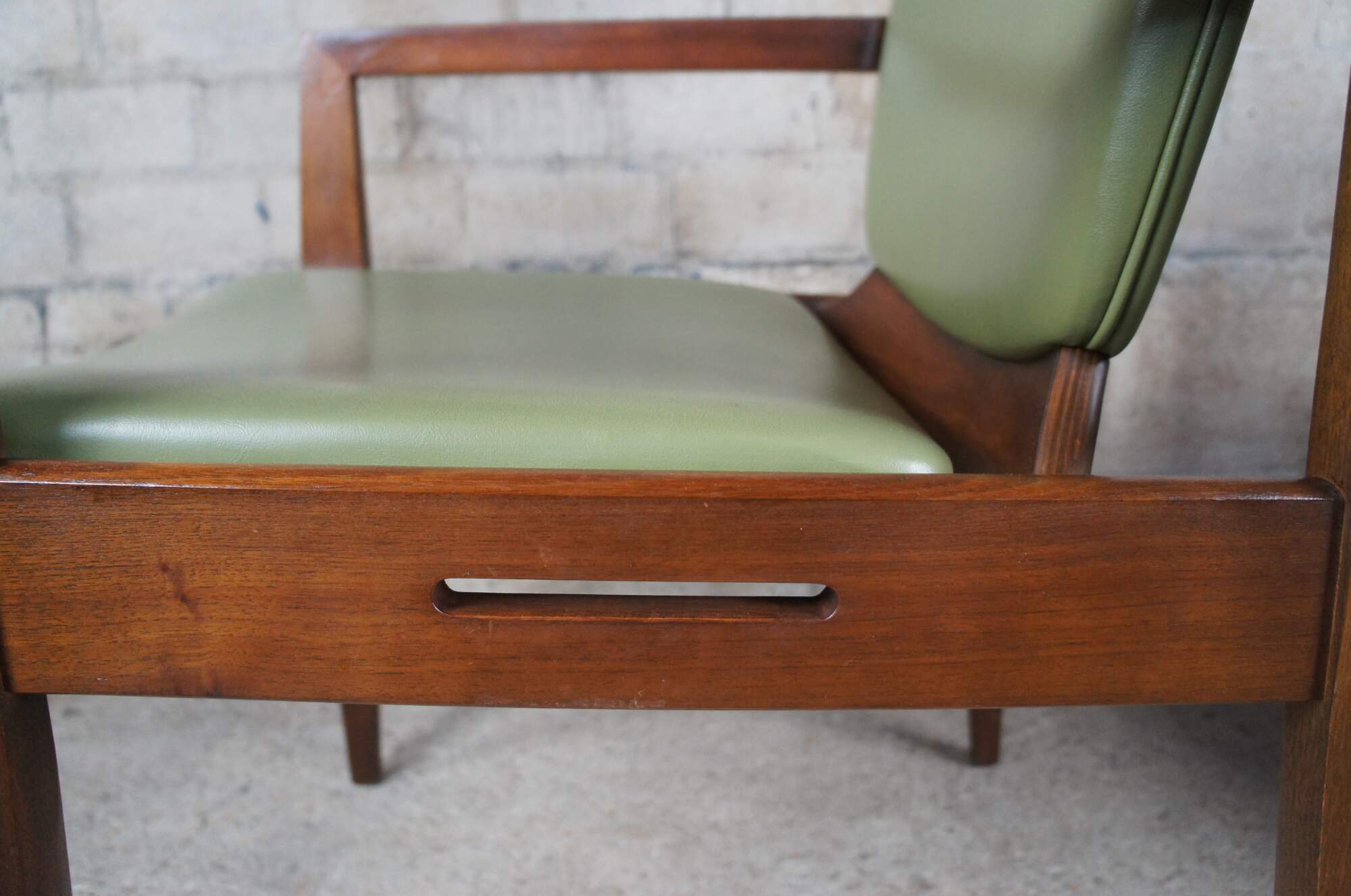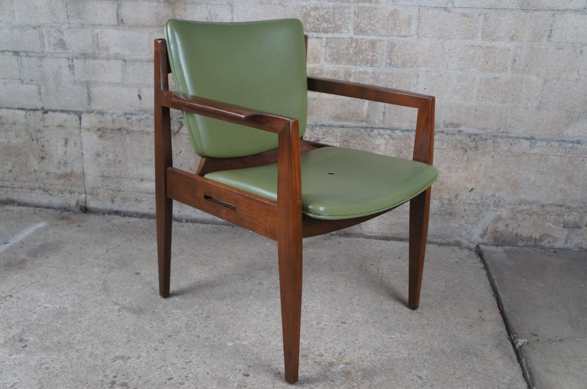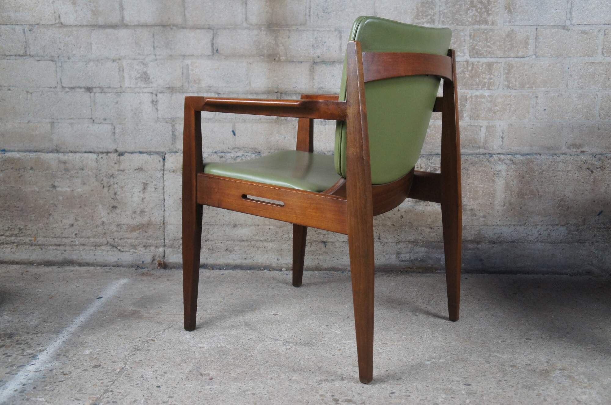 Pair of Thonet arm chairs, circa 1960s. Features Danish styling with streamline modern frames and original green vinyl fabric. Tag along underside
