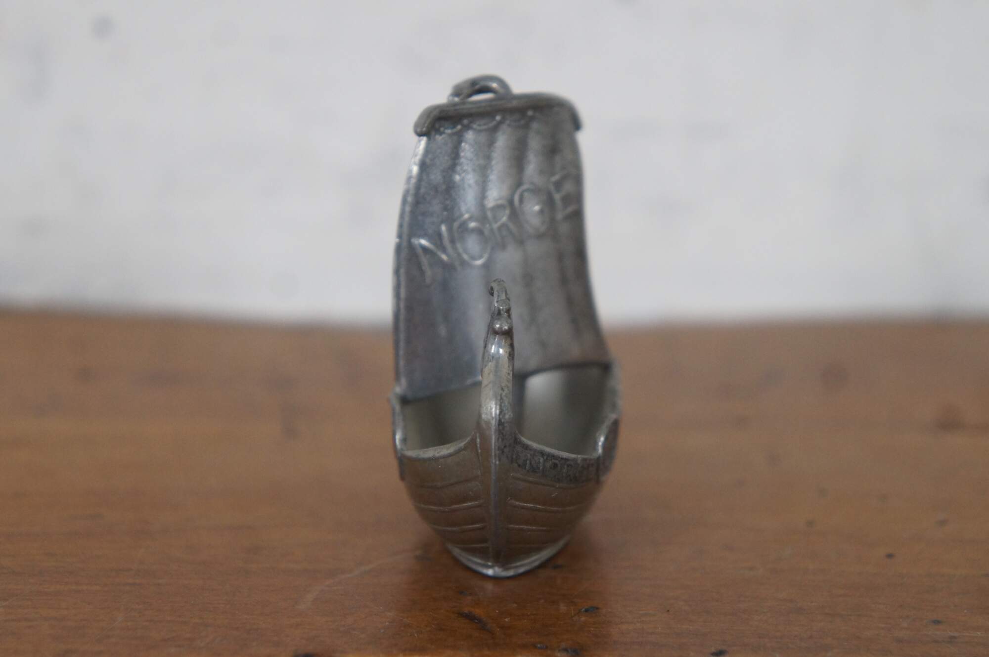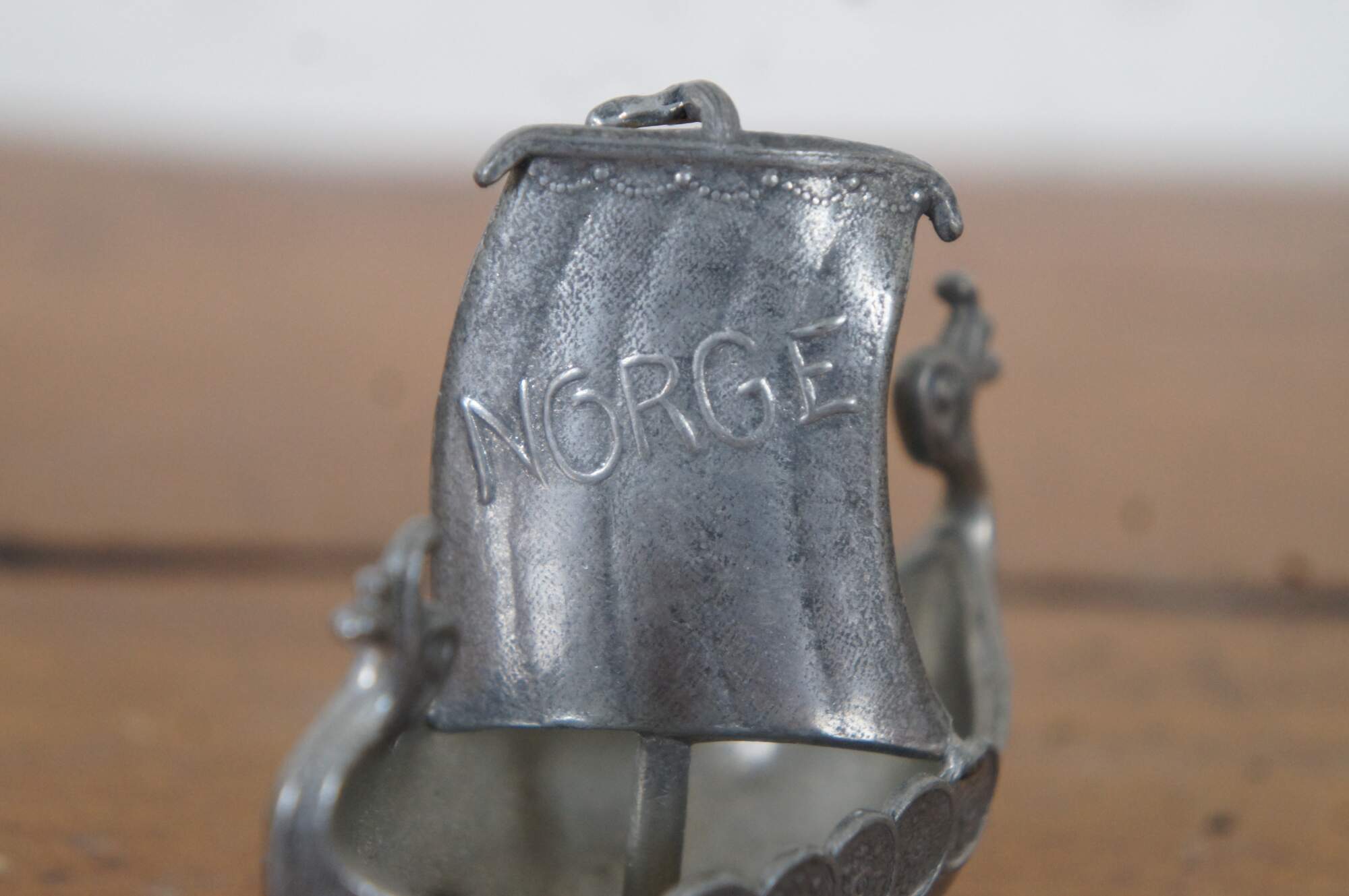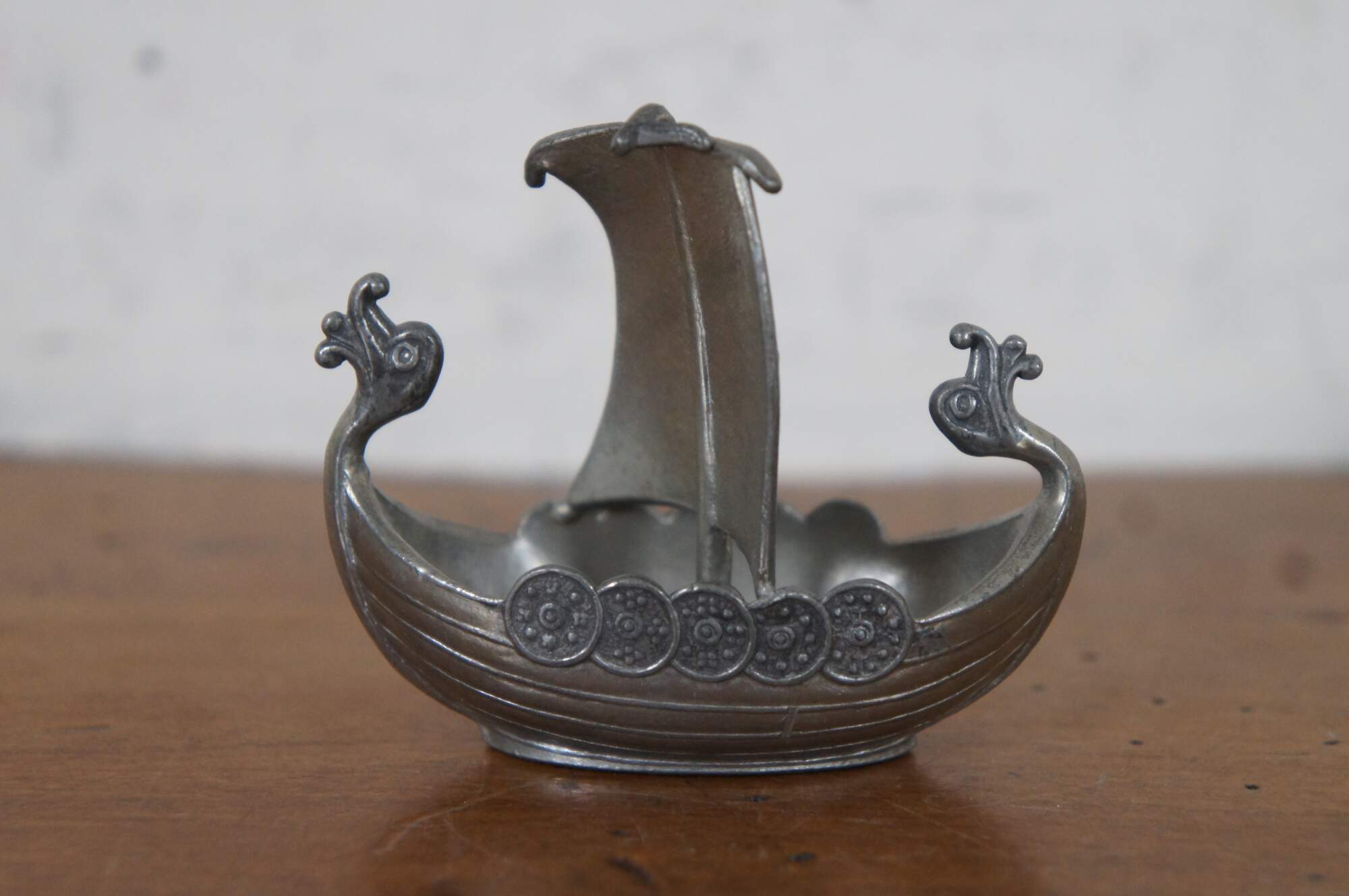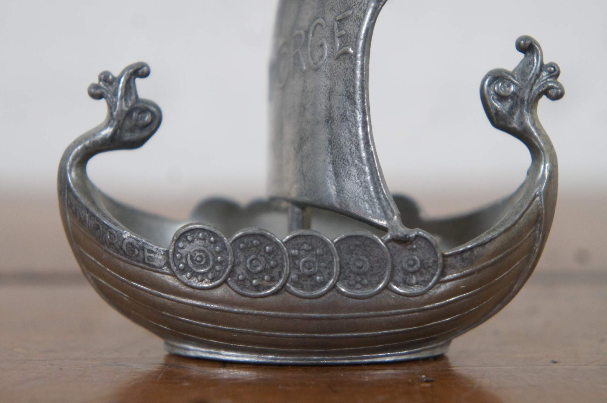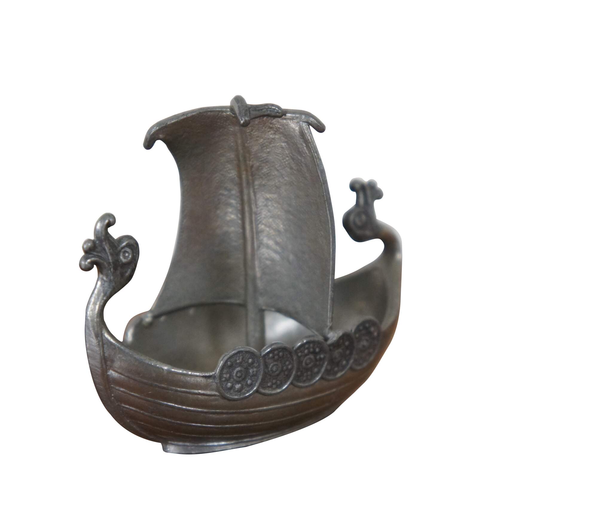 Vintage TPB Tinn, Norwegian pewter Viking boat / ship figurine / salt cellar, featuring dragon heads at the bow and prow, shields lining the sides and the word Norge on the sail.