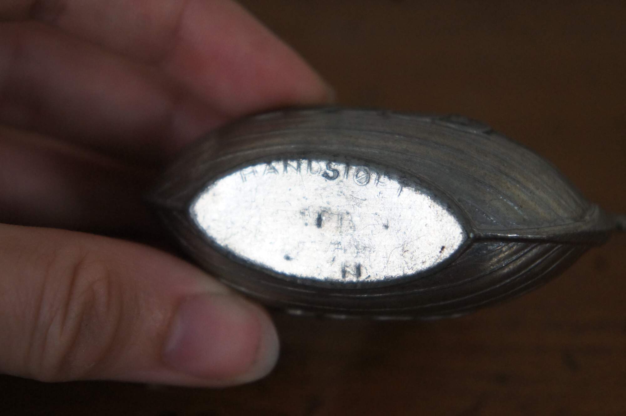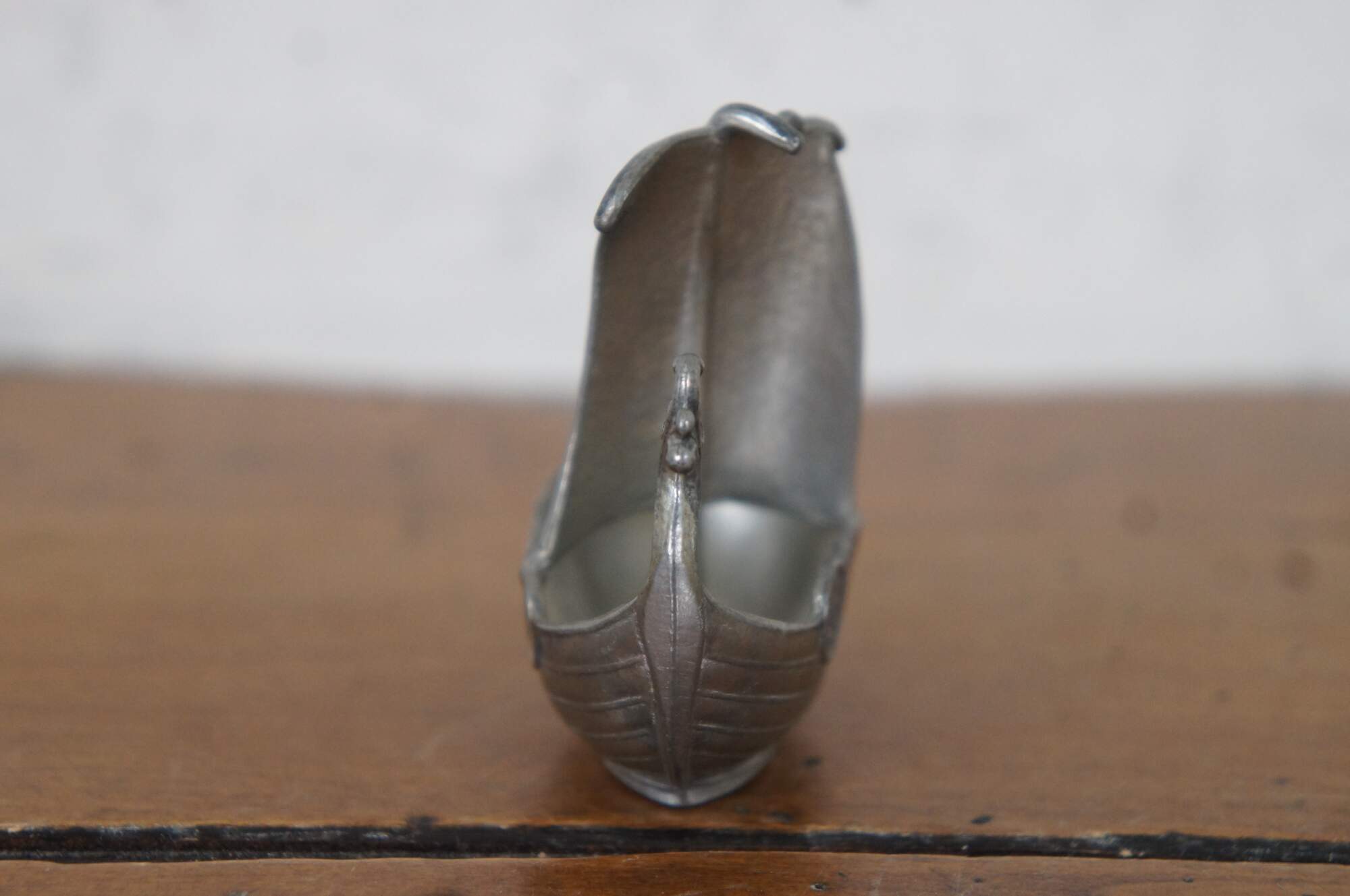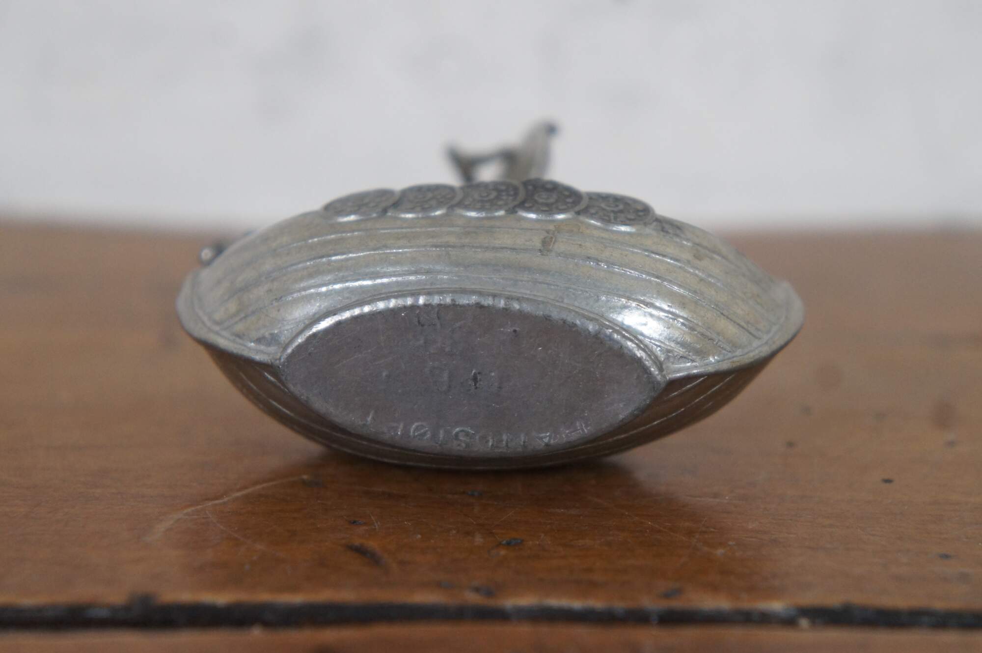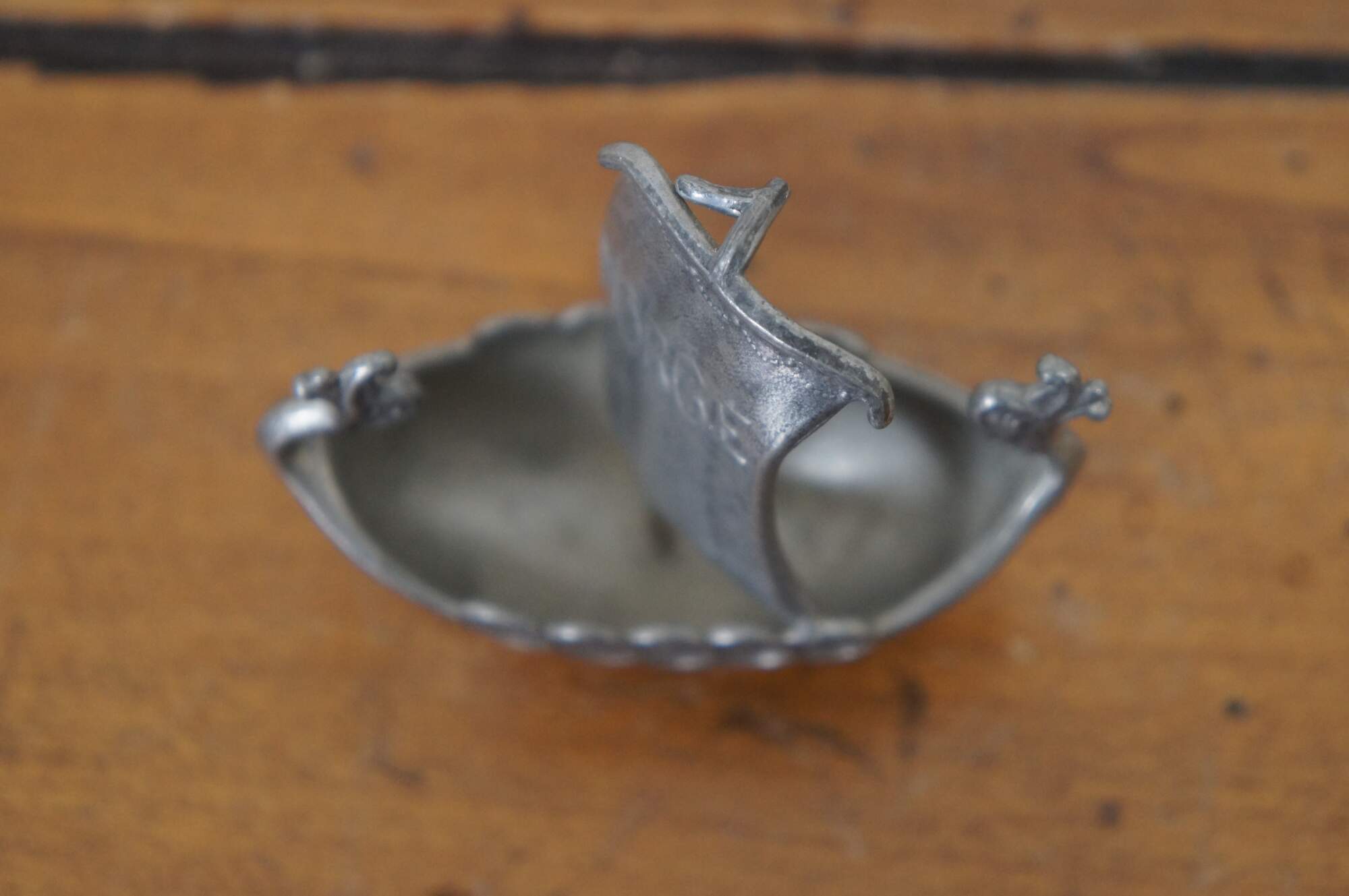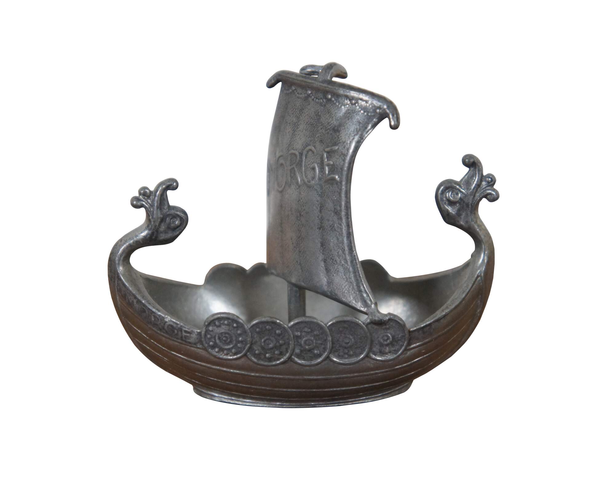 Vintage TPB Tinn, Norwegian pewter Viking boat / ship figurine / salt cellar, featuring dragon heads at the bow and prow, shields lining the sides and the word Norge on the sail.