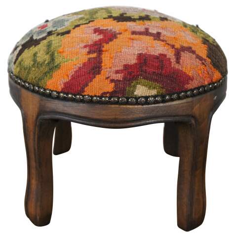 Vintage round wooden footstool / ottoman featuring a padded needlepoint top decorated with flowers and leaves in orange, green, pink and blue, and hammered nailhead trim.