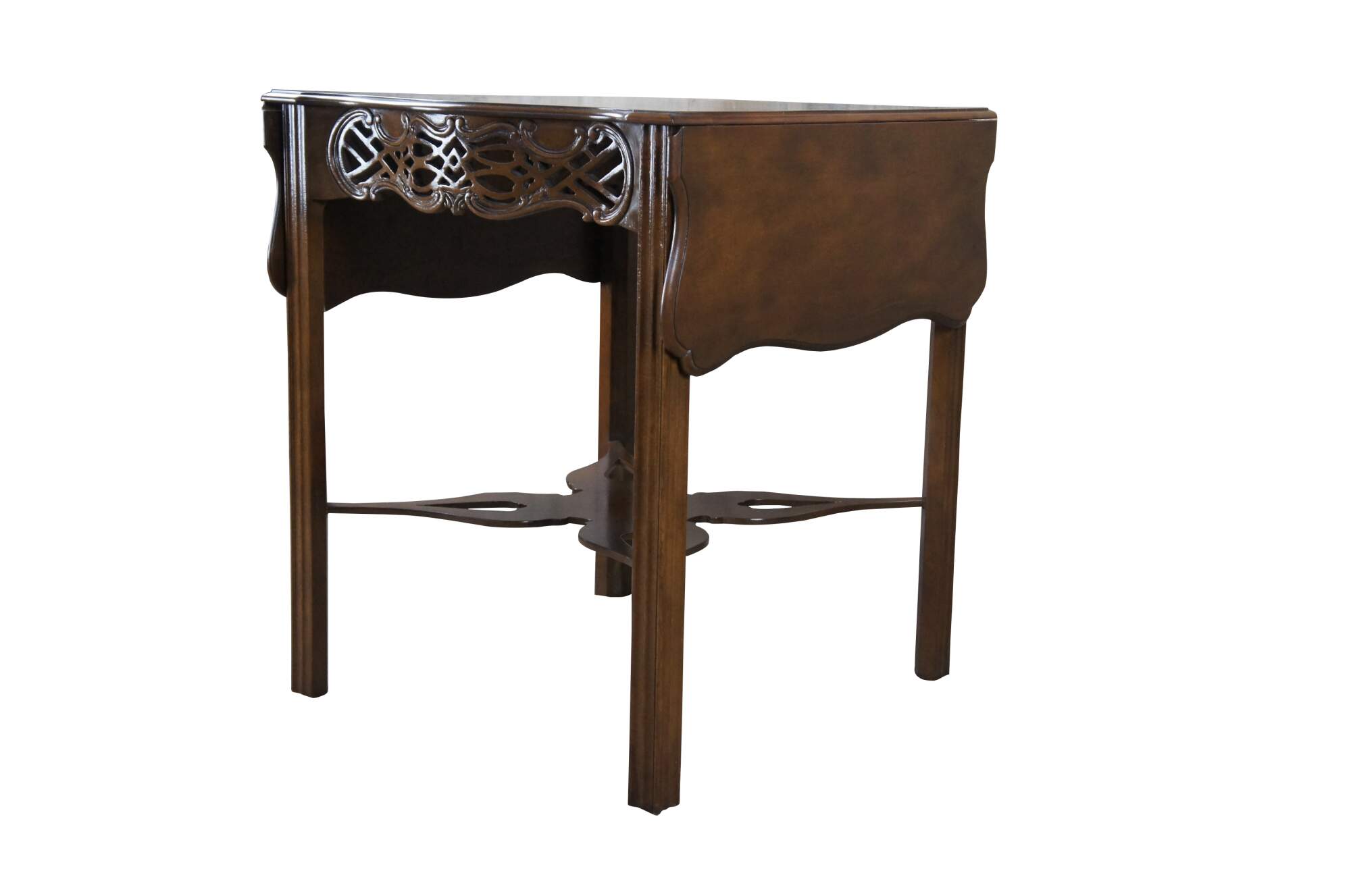 An impressive Baker Furniture Chippendale style mahogany pembroke table, circa 1970s. Featuring drop-leaf sides and a serpentine top with intricately carved open fretwork frieze. Supported by straight chamfered legs and joined by butterfly stretchers. Baker produced a very limited number of these tables as part of their historic Charlston collection. Supporting makers mark and limited edition badging underneath.