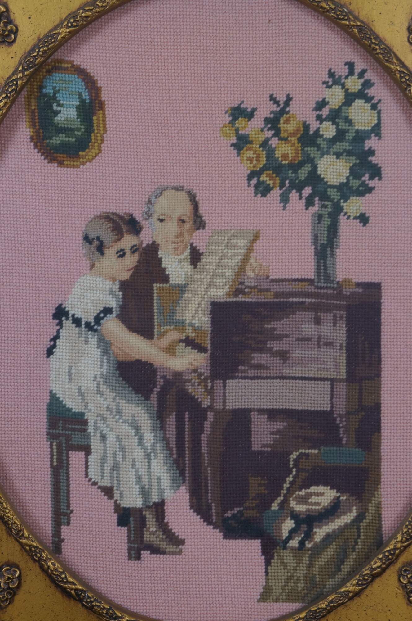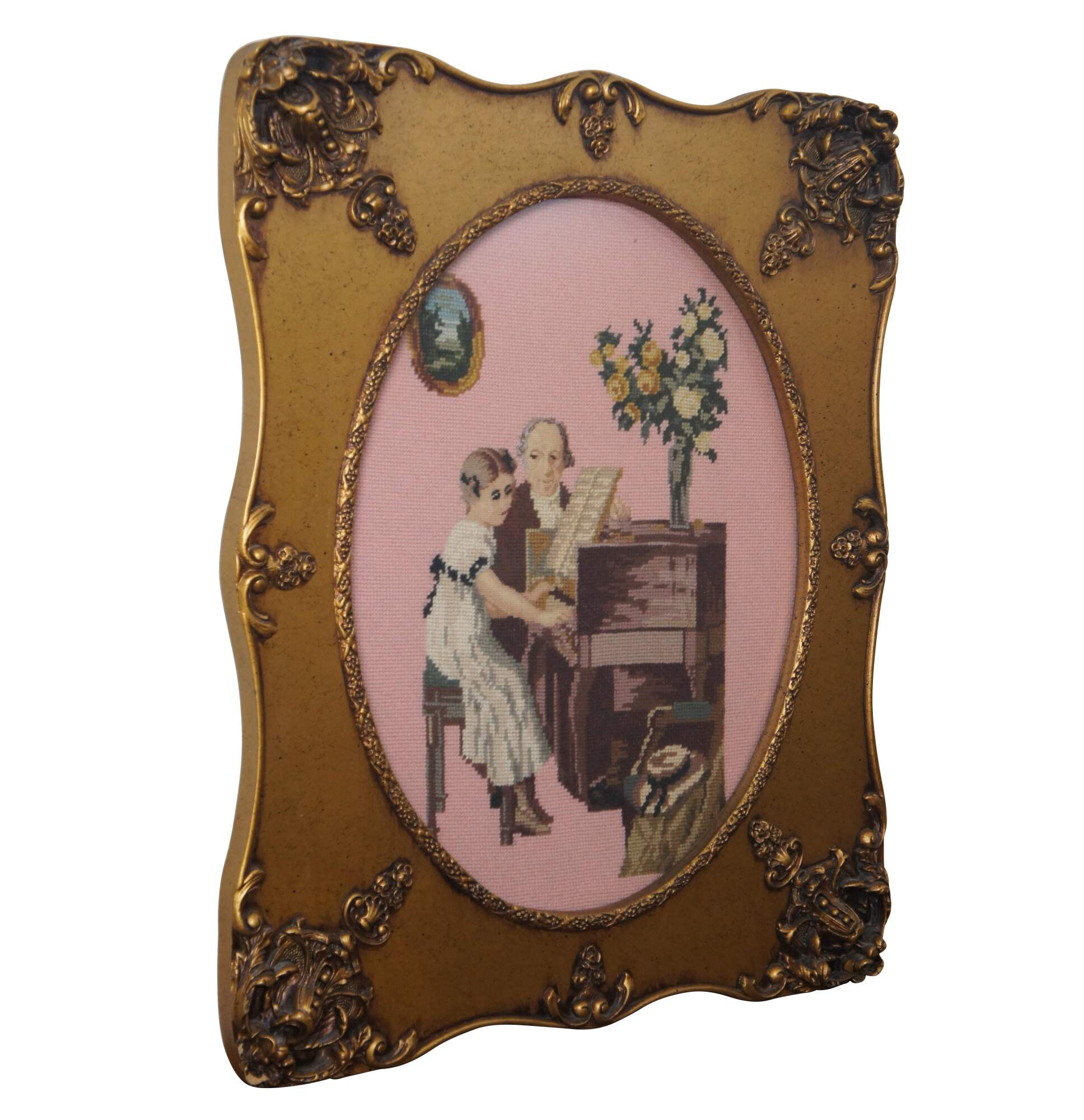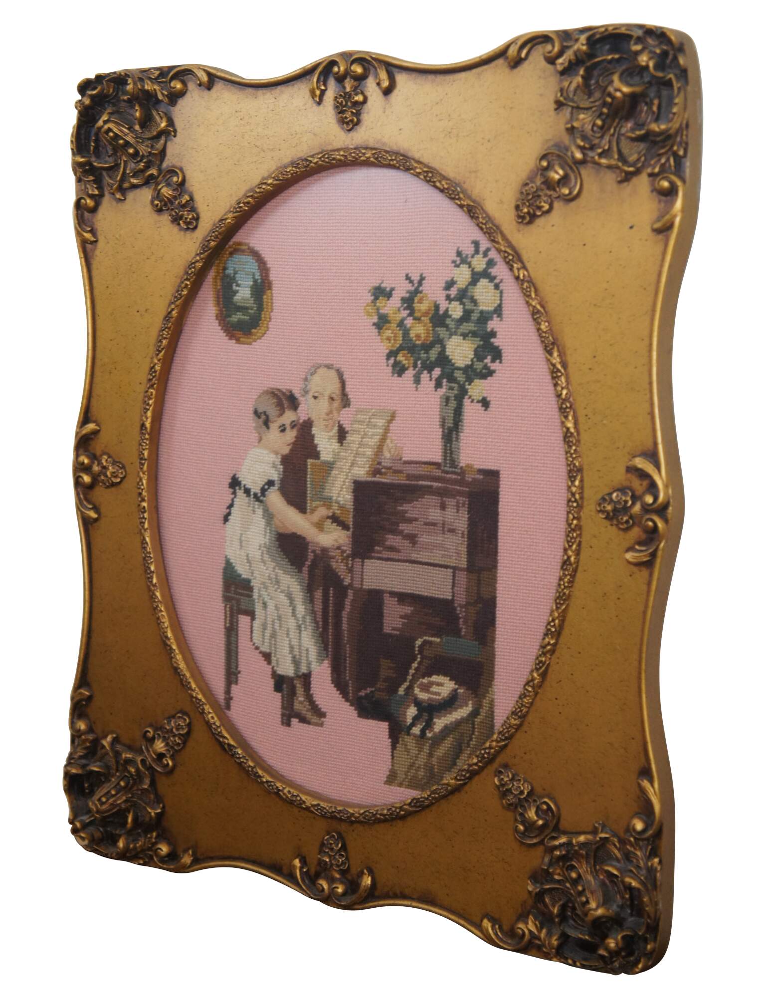 Vintage embroidered scene / tableau showing a young girl and older man in Regency era attire. After work by Jules Alexis Muenier, titled The Piano Lesson. Framed in a scalloped giltwood frame with ornate details.