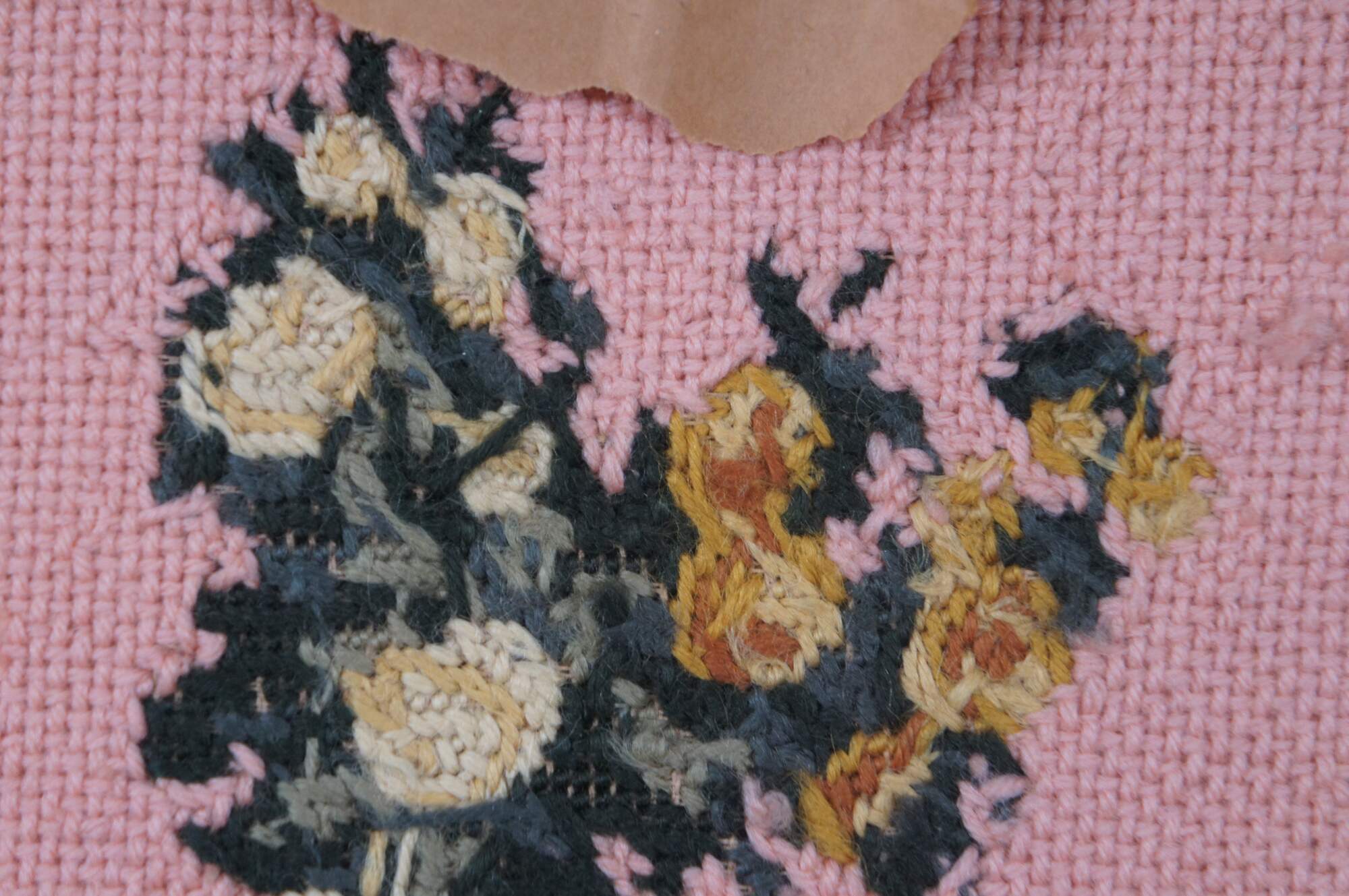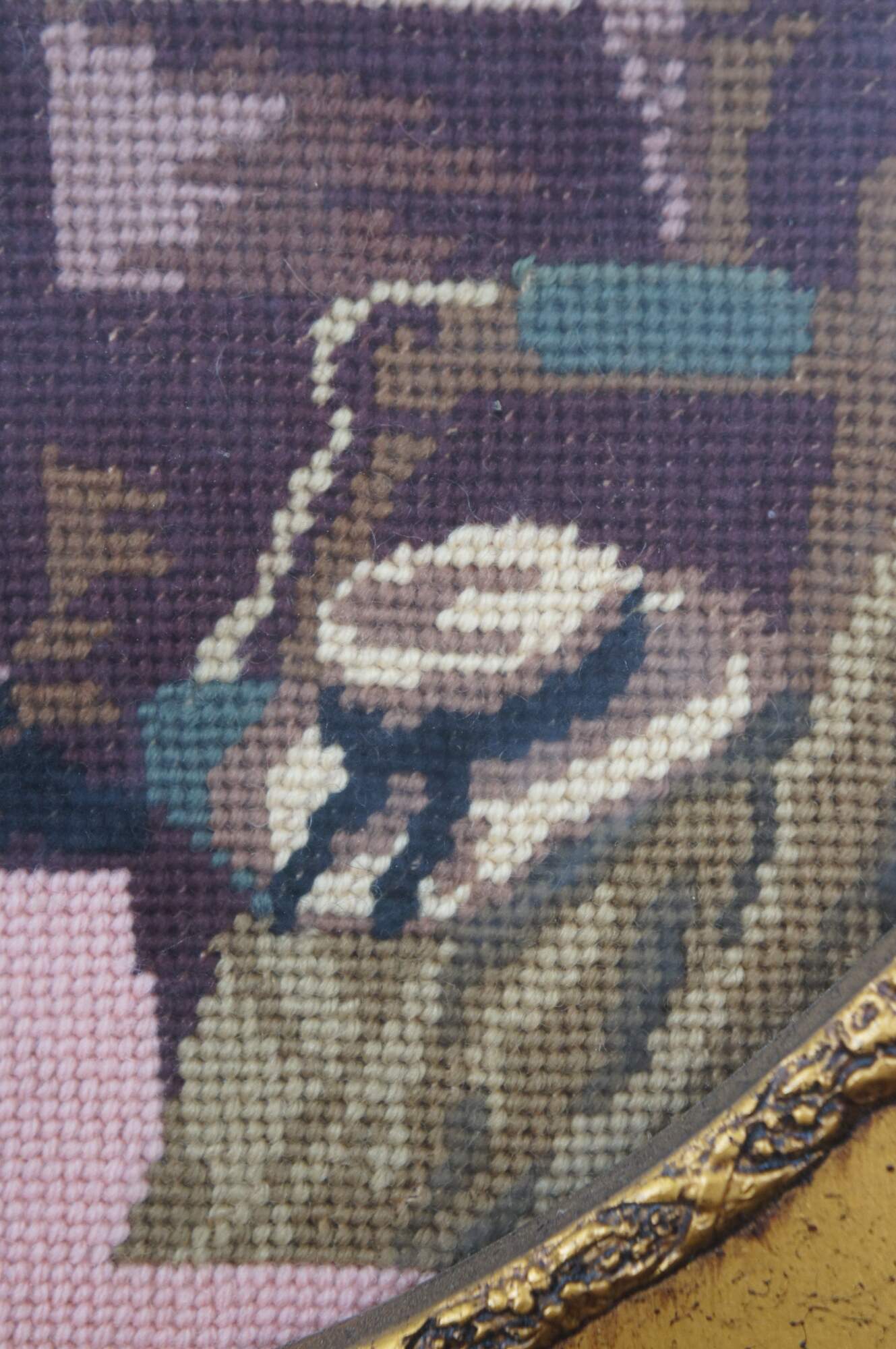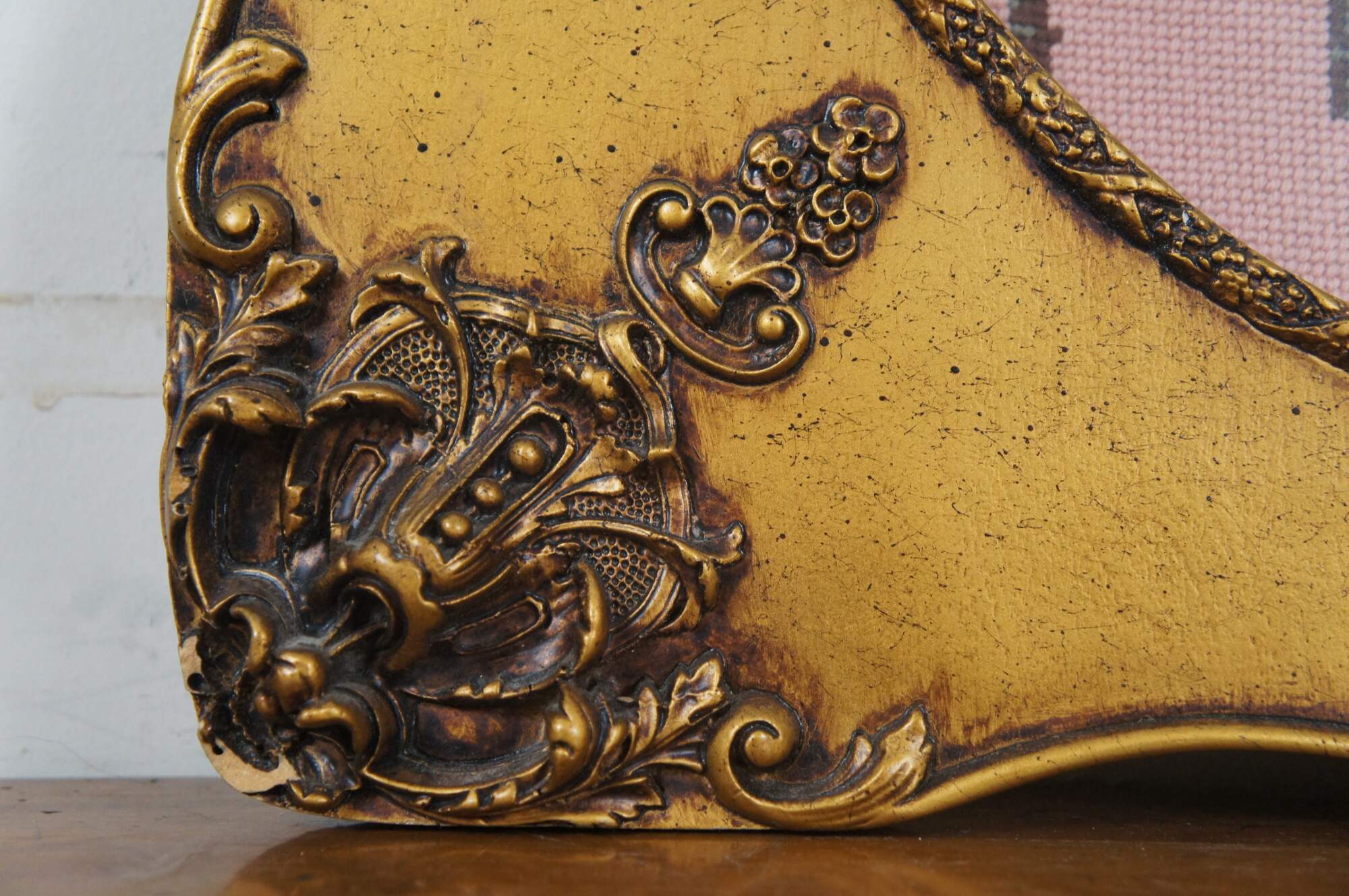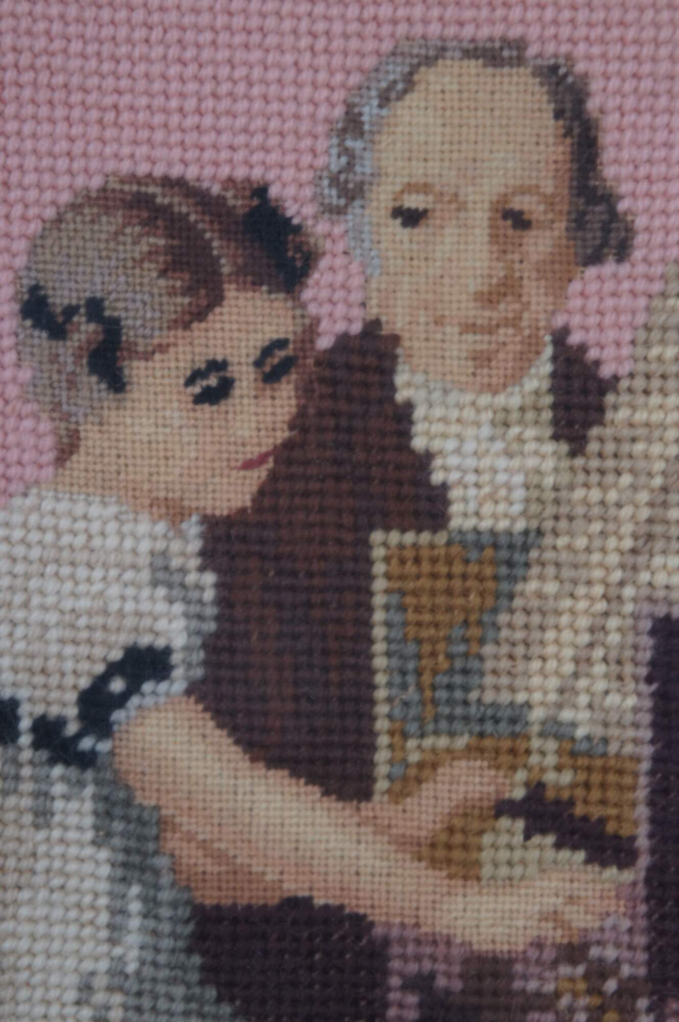 Vintage embroidered scene / tableau showing a young girl and older man in Regency era attire. After work by Jules Alexis Muenier, titled The Piano Lesson. Framed in a scalloped giltwood frame with ornate details.
