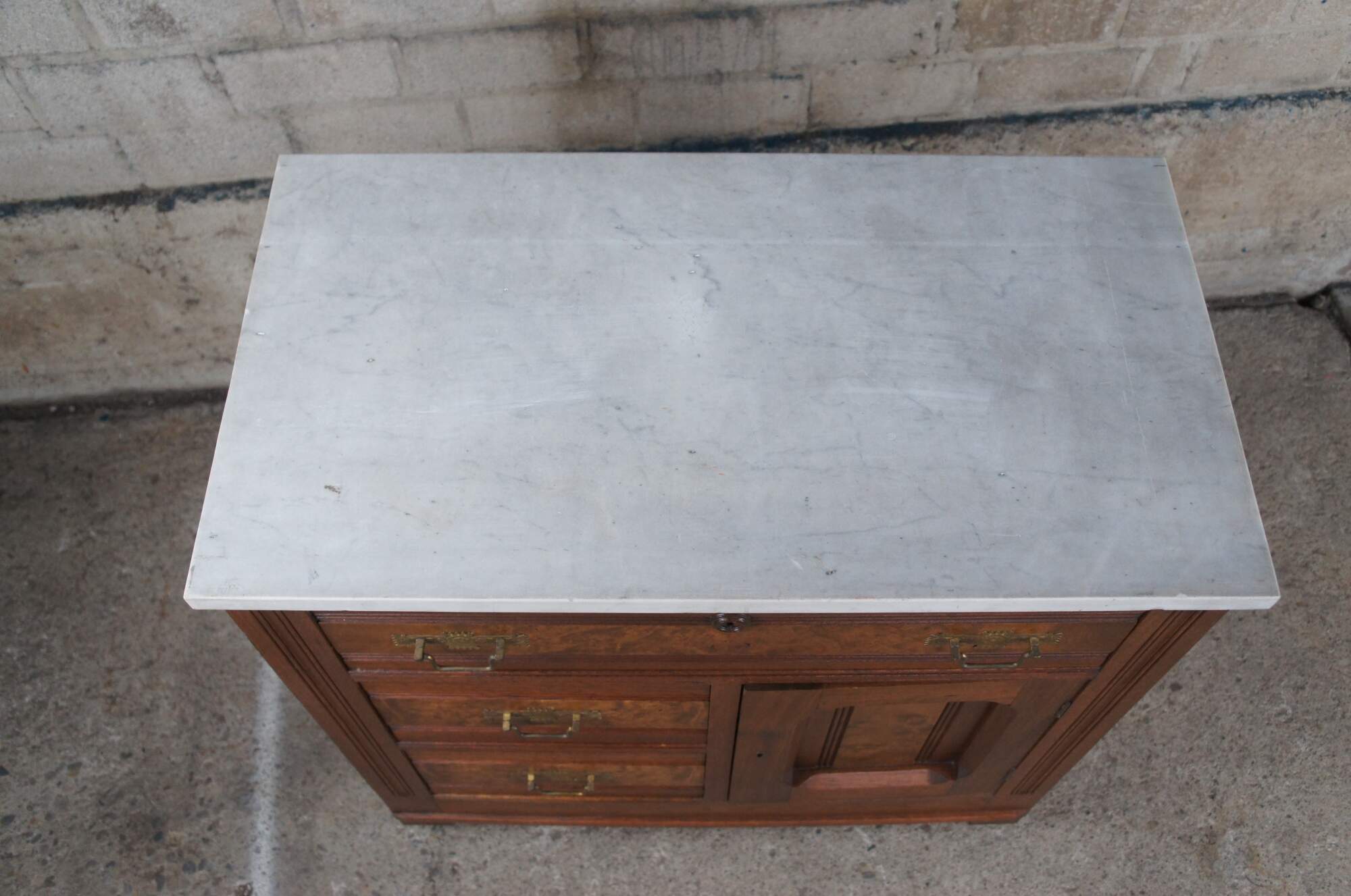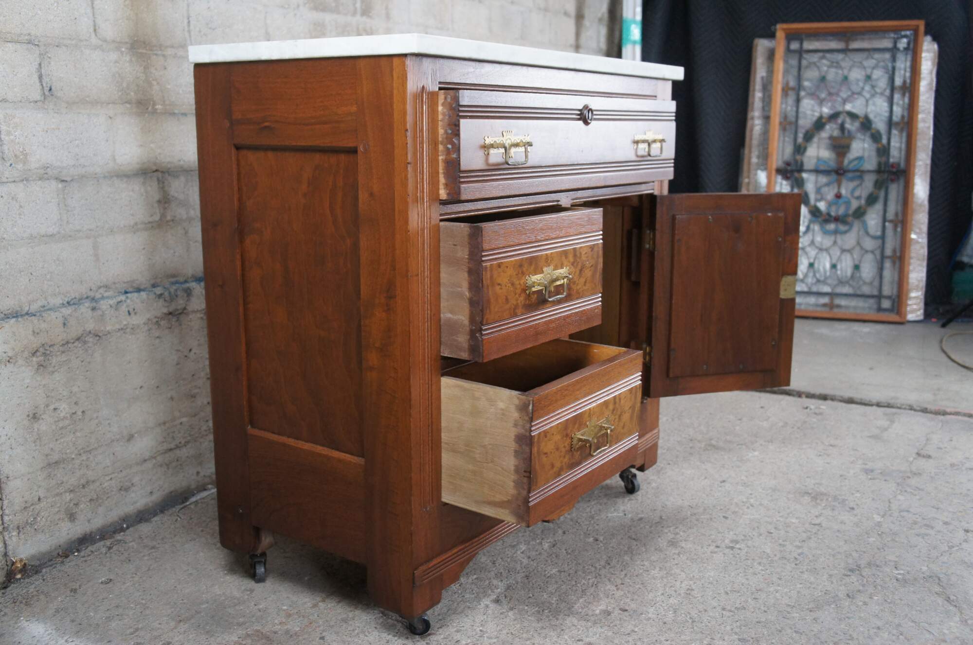 A lovely Victorian era washstand, circa 1880s. Made from walnut with burled and fluted panels. Features 3 drawers with Knapp Joint Dovetailing and a side cabinet for storage. Includes a while marble top, ornate brass drawer pulls, metal casters for ease of movement and a unique pullout bar for towels or rags.