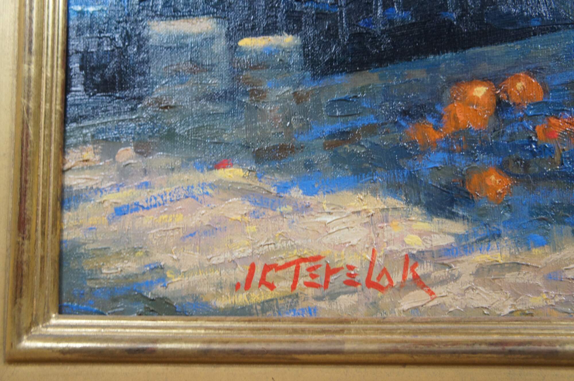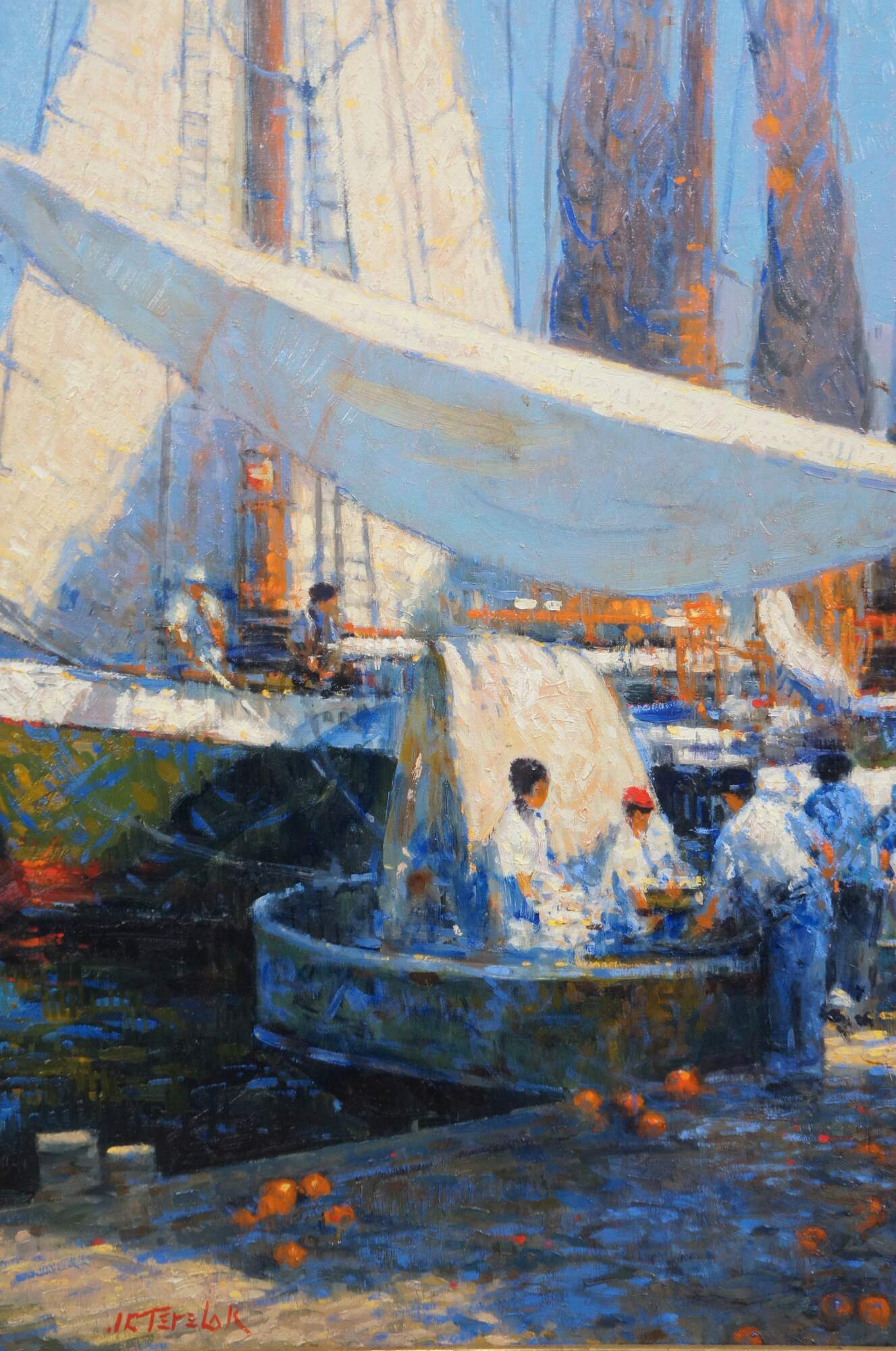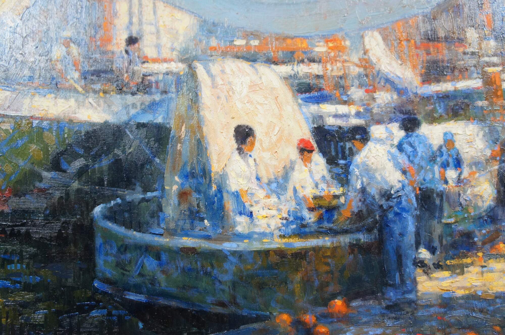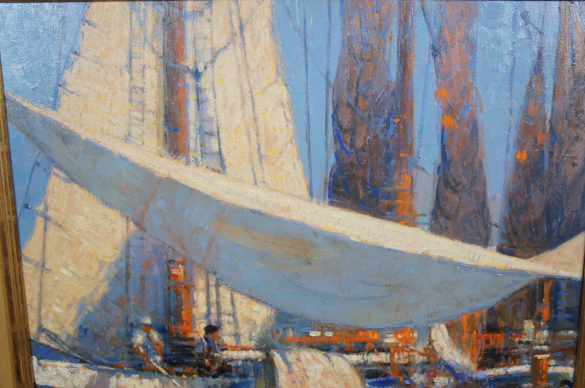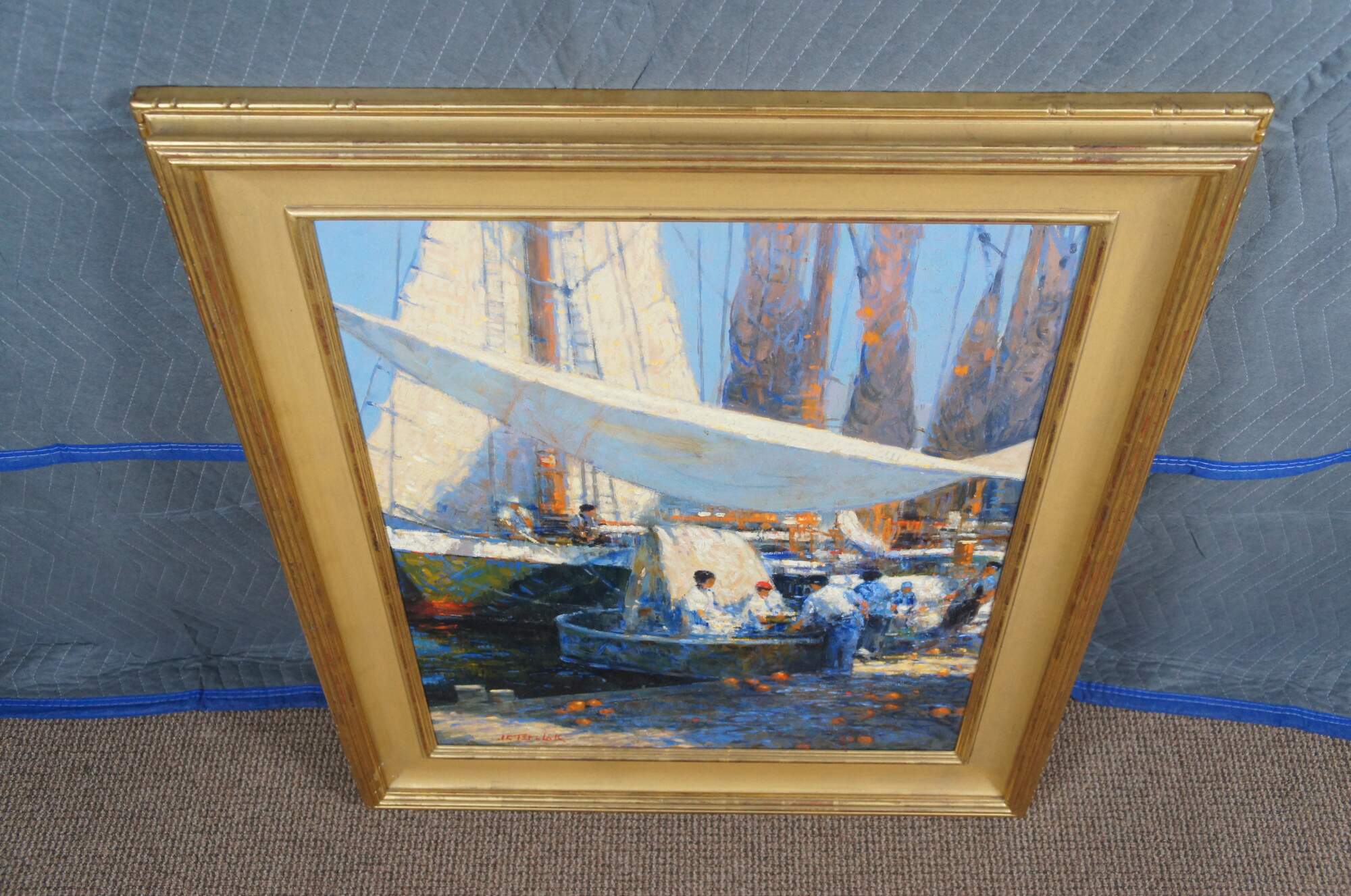 Vintage nautical maritime impressionist painting featuring sailboats boats docked at a Massachusetts harbor. The scene shows figures at an ocean side market. 'Upland Game' refers to the wild birds that are hunted during season. The canvas is signed lower left and marked on the verso. Framed in an a gently distressed wooden frame with gold paint.