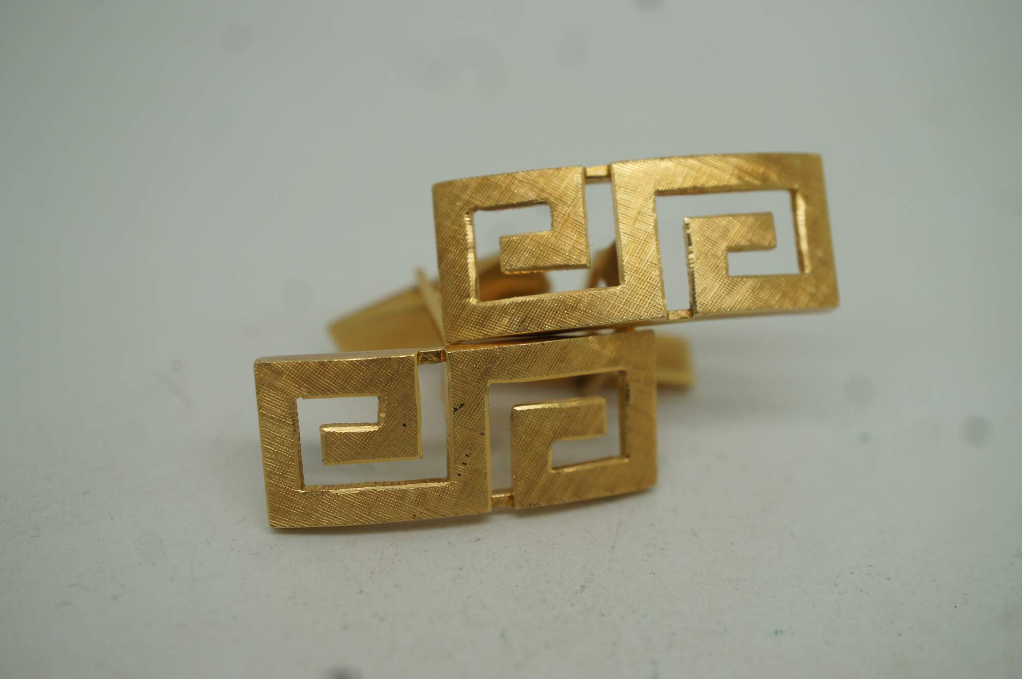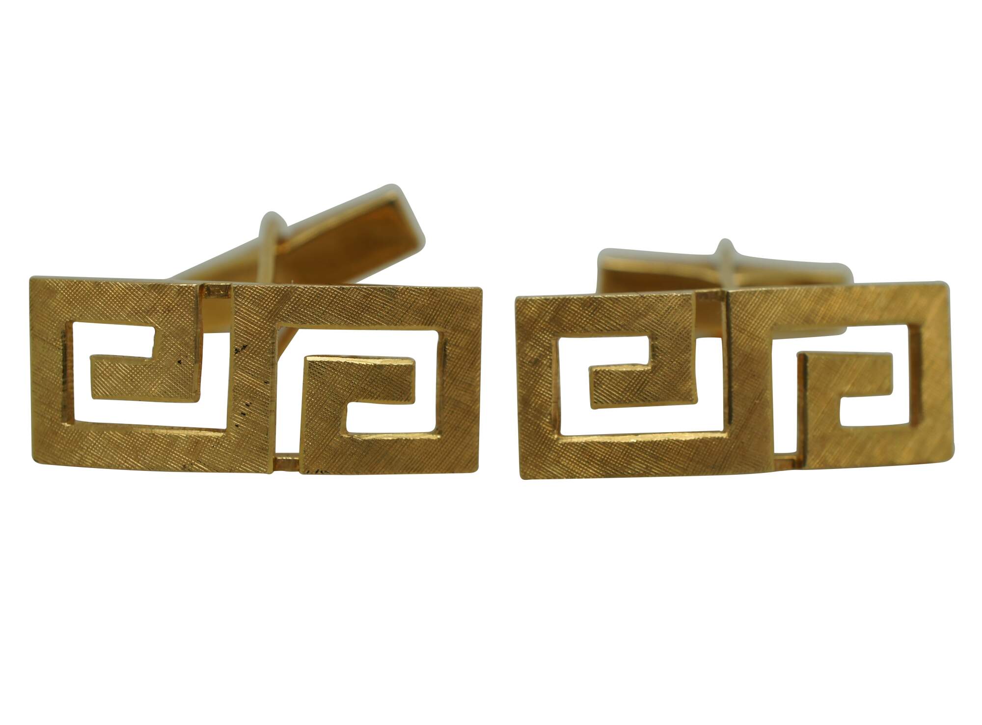 Pair of vintage 18K yellow gold men’s cufflinks in the shape of a Greek Key pattern with cross hatched surface texture.