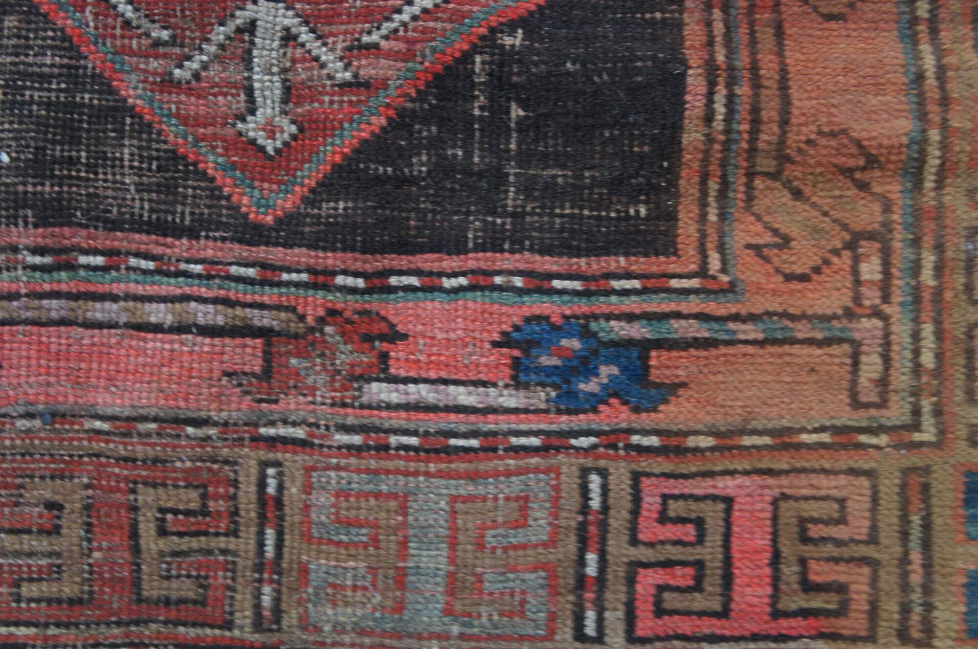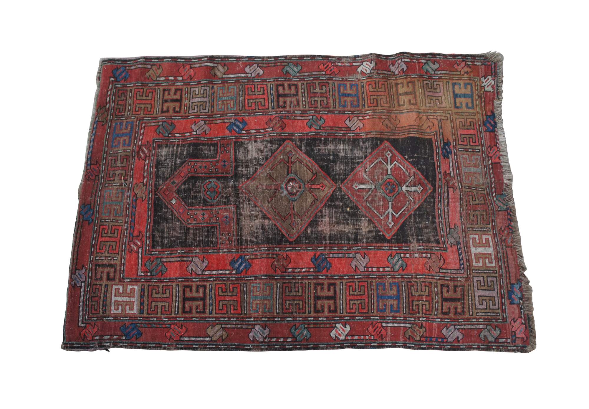 Red & Blue hand Woven wool prayer rug. Features a diamond geometric field with framed in alternating color # signs. 3'3" x 4'6